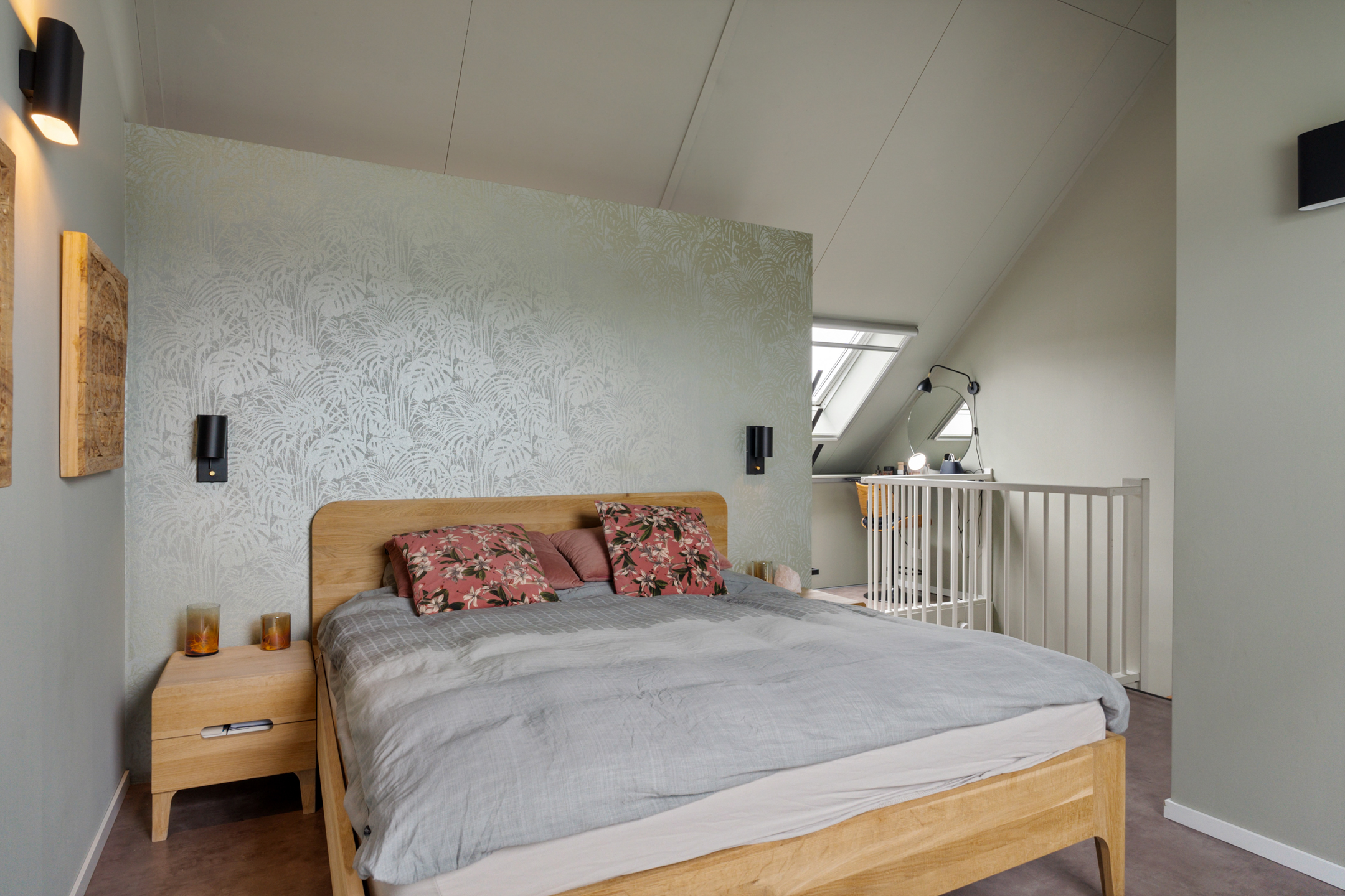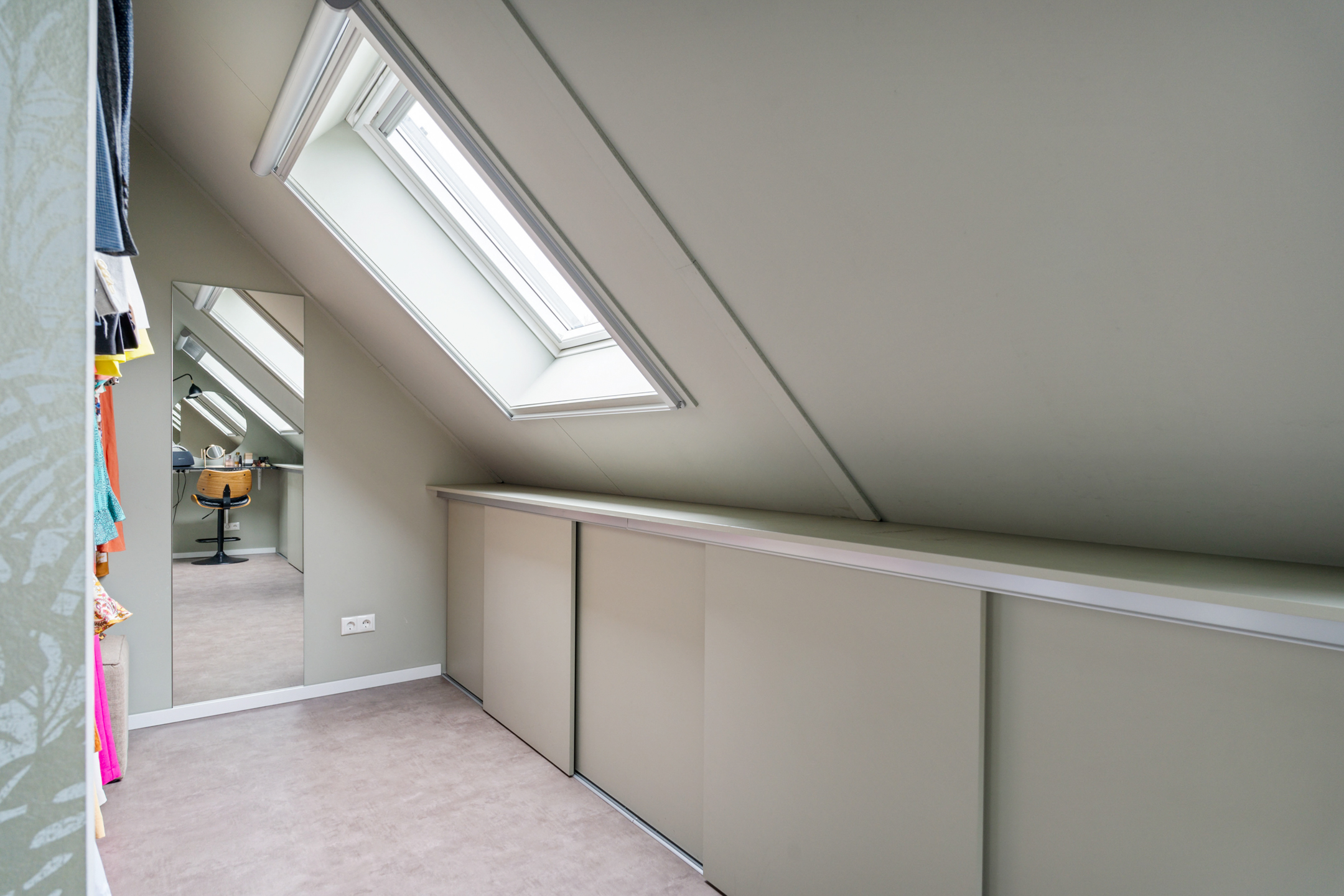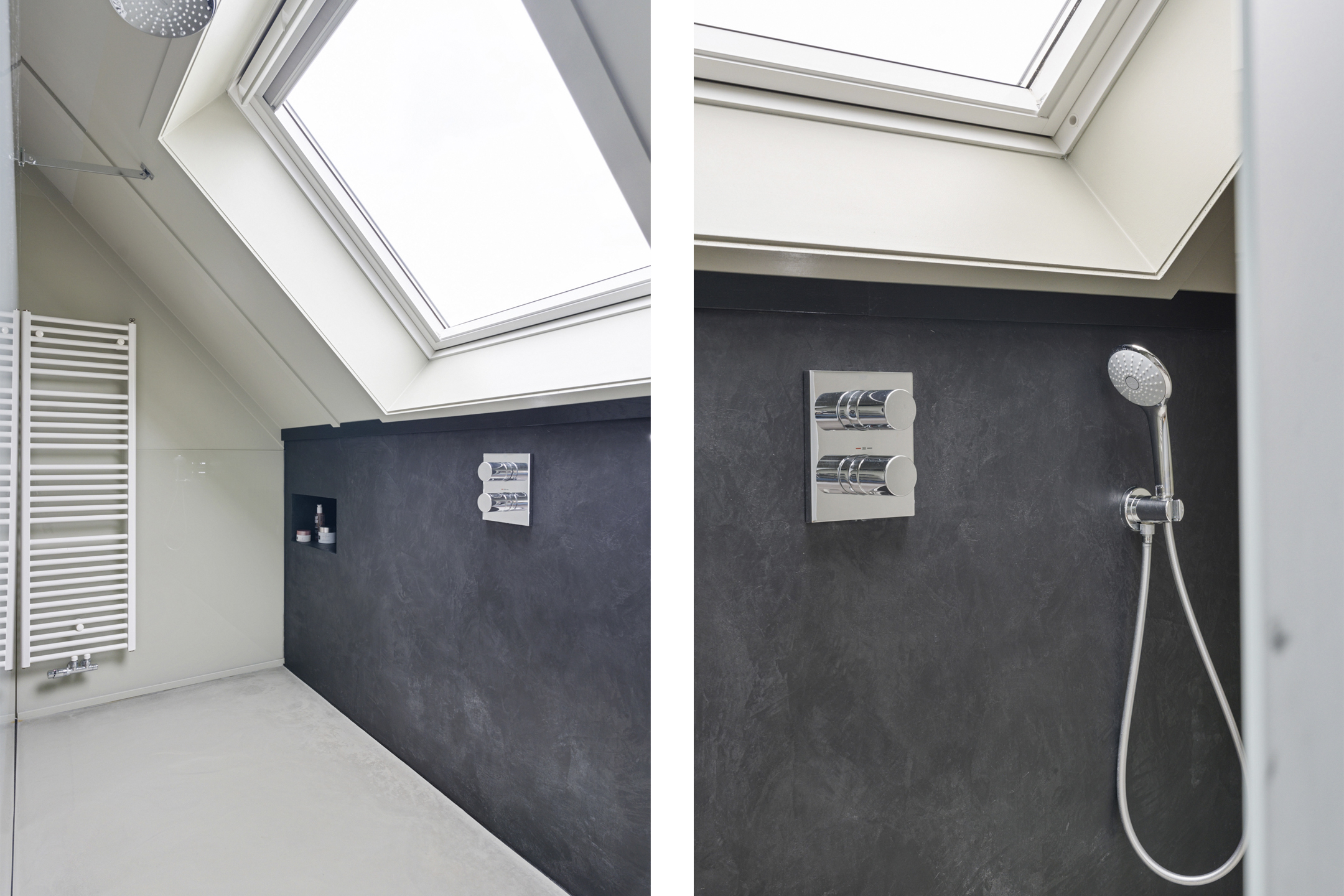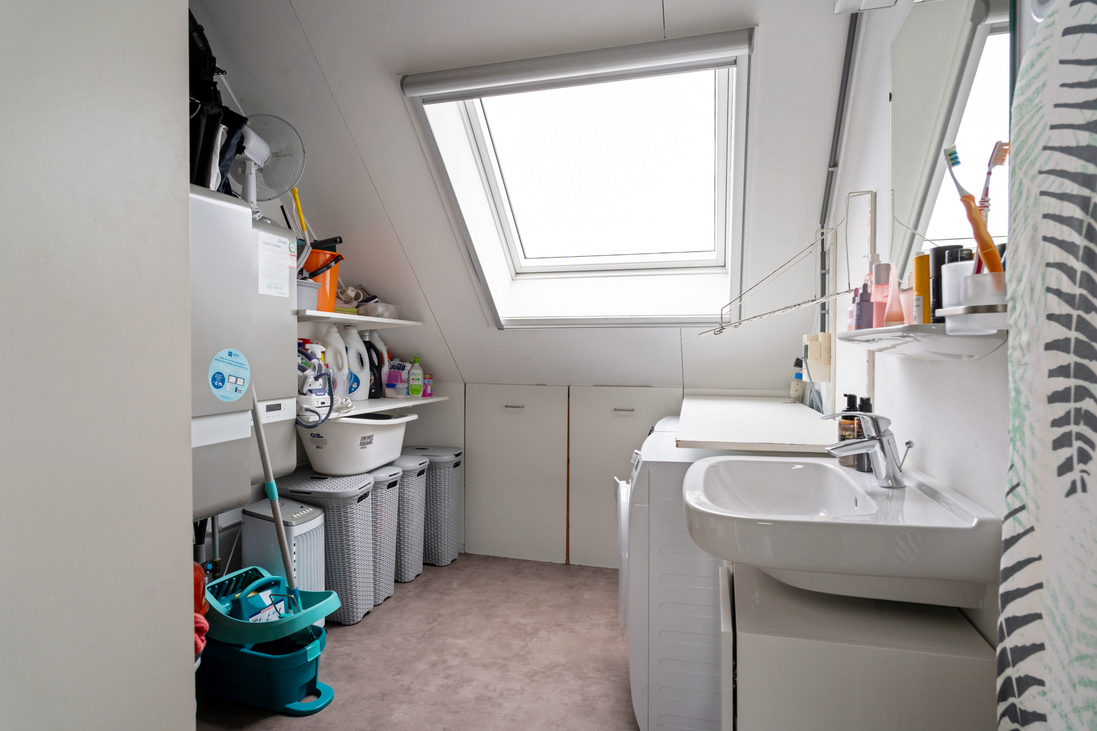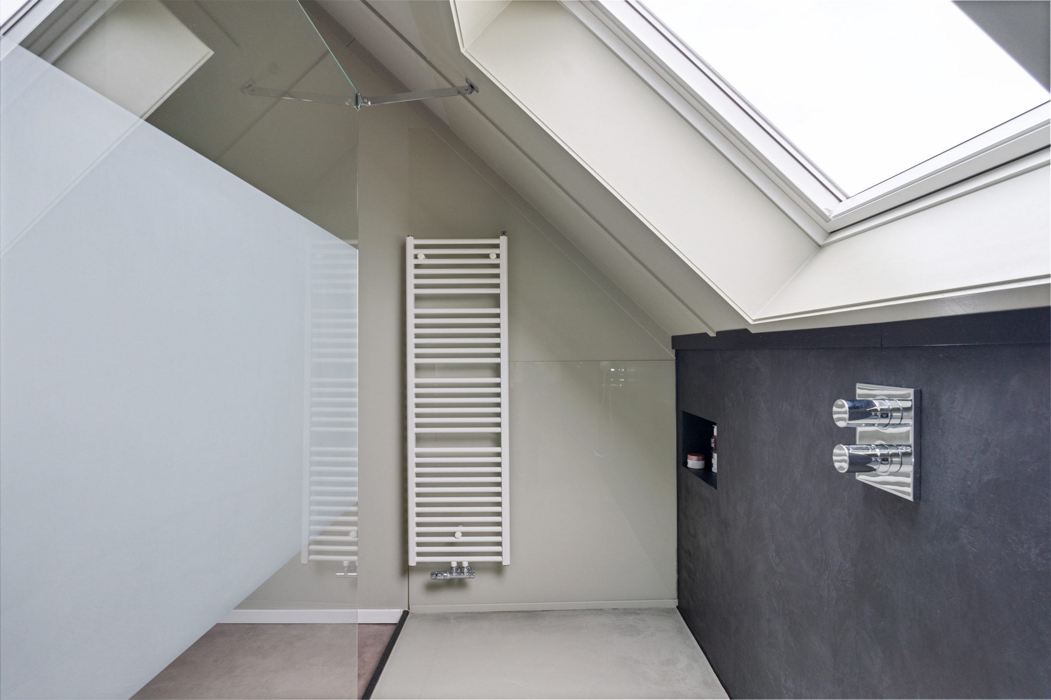 De open trap leidt naar de indrukwekkende tweede verdieping. Deze hoge ruimte is ingericht als een luxe boutique suite, compleet met een royale inloopgarderobe, een open XL regendouche met handdouche en een aparte ruimte voor de wasmachine, droger en technische installaties. Ook is er een extra wastafel aanwezig.