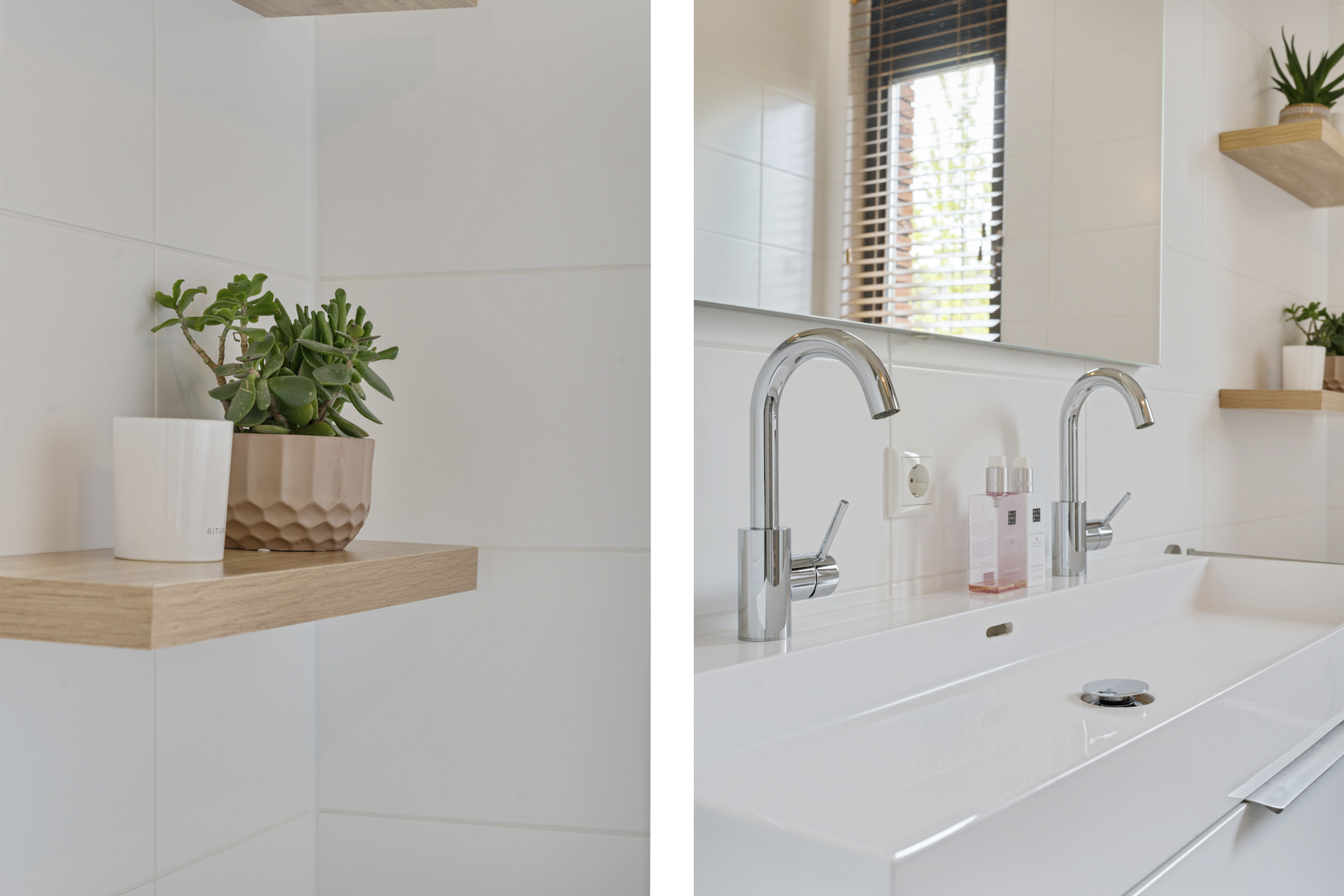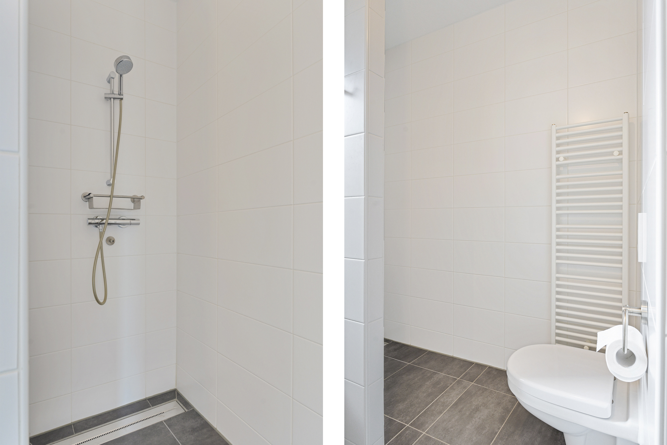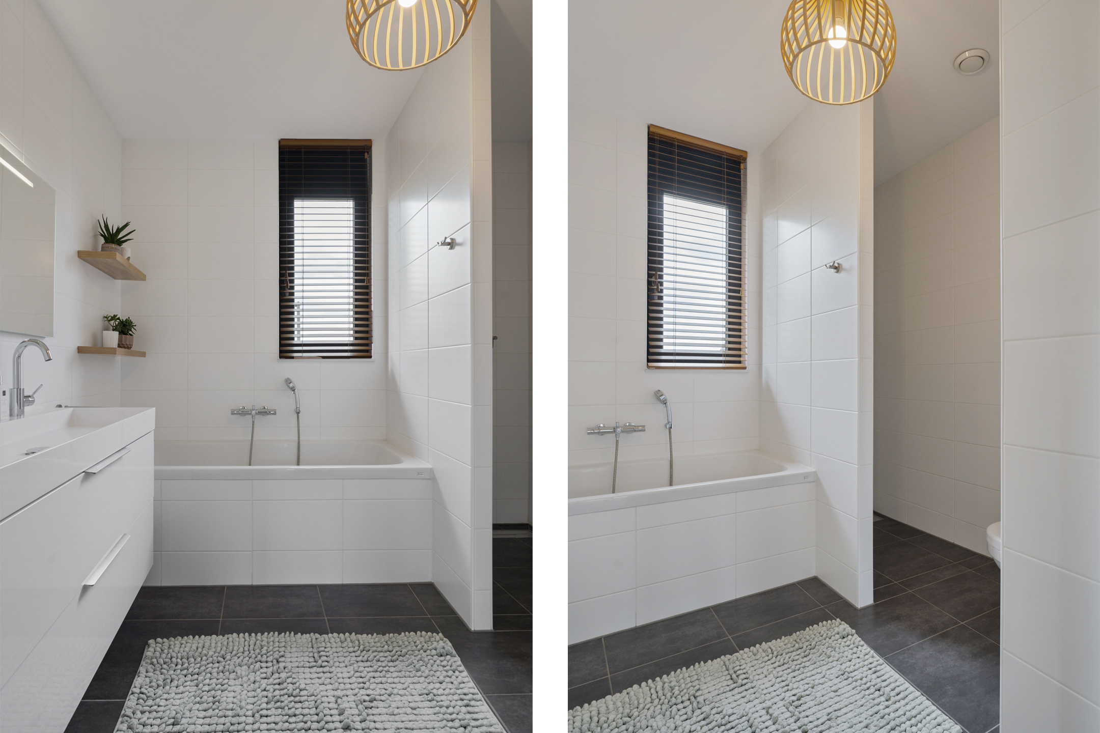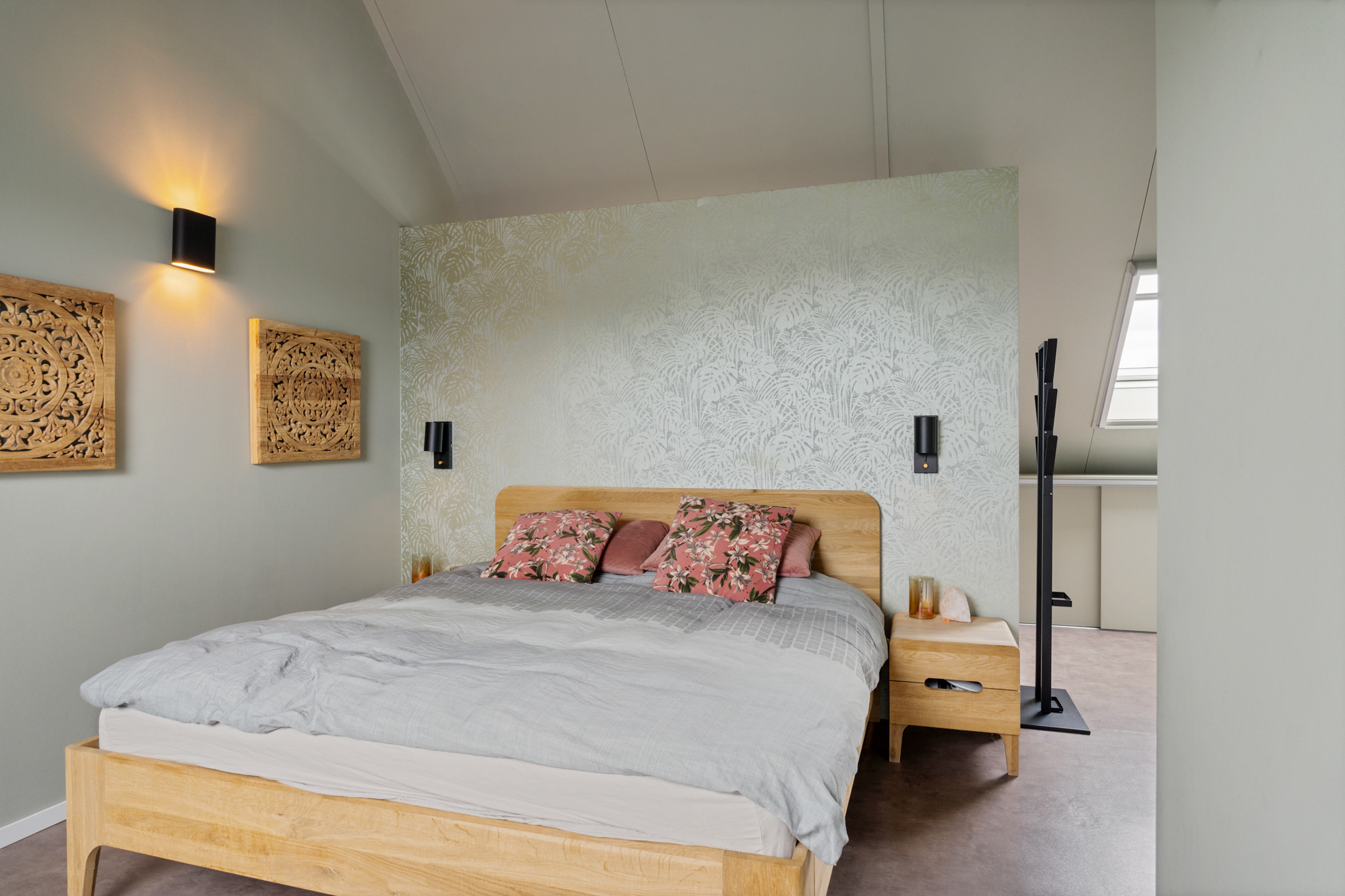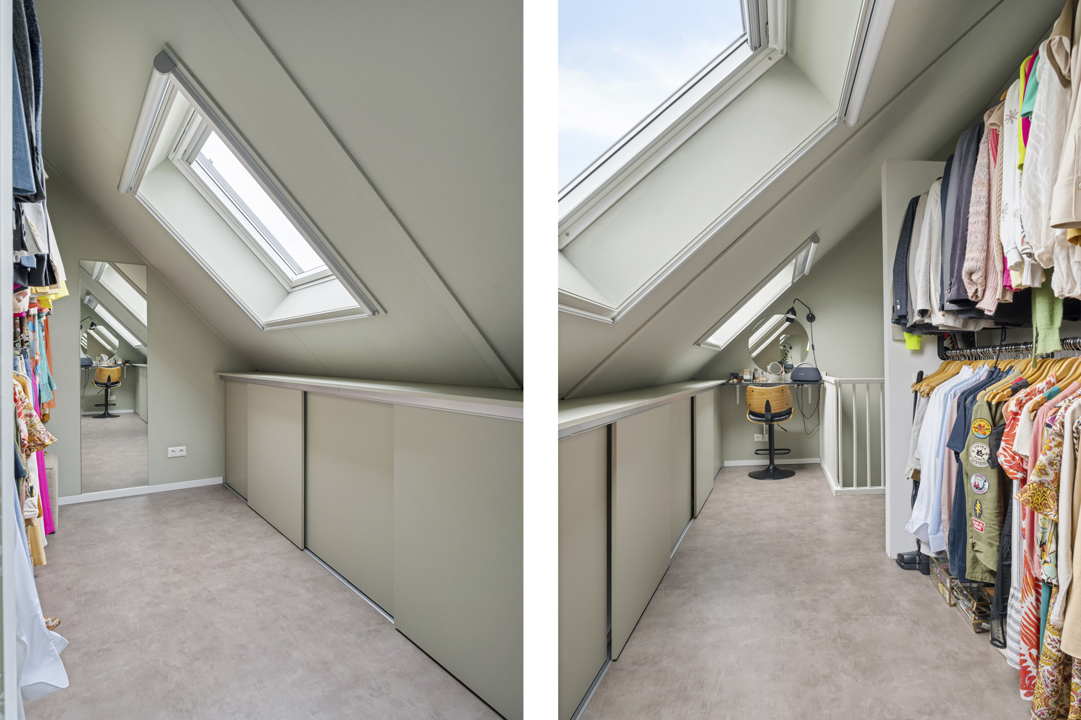 De open trap leidt naar de indrukwekkende tweede verdieping. Deze hoge ruimte is ingericht als een luxe boutique suite, compleet met een royale inloopgarderobe, een open XL regendouche met handdouche en een aparte ruimte voor de wasmachine, droger en technische installaties. Ook is er een extra wastafel aanwezig.