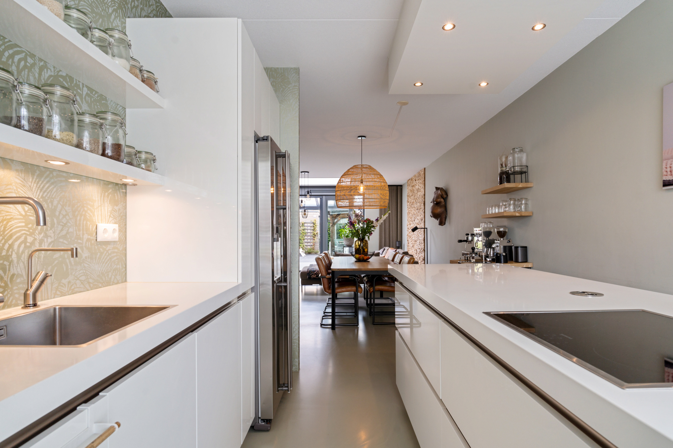 De luxe open keuken bevindt zich aan de voorzijde en is voorzien van een modern kookeiland met een gezellige eetbar, inductiekookplaat en ingebouwd plafondafzuigsysteem. De wandopstelling is strak afgewerkt met onder andere een stoomoven, vaatwasser, Quooker, koelkast en een stijlvol composiet werkblad. Daarnaast is er een aparte coffee corner.