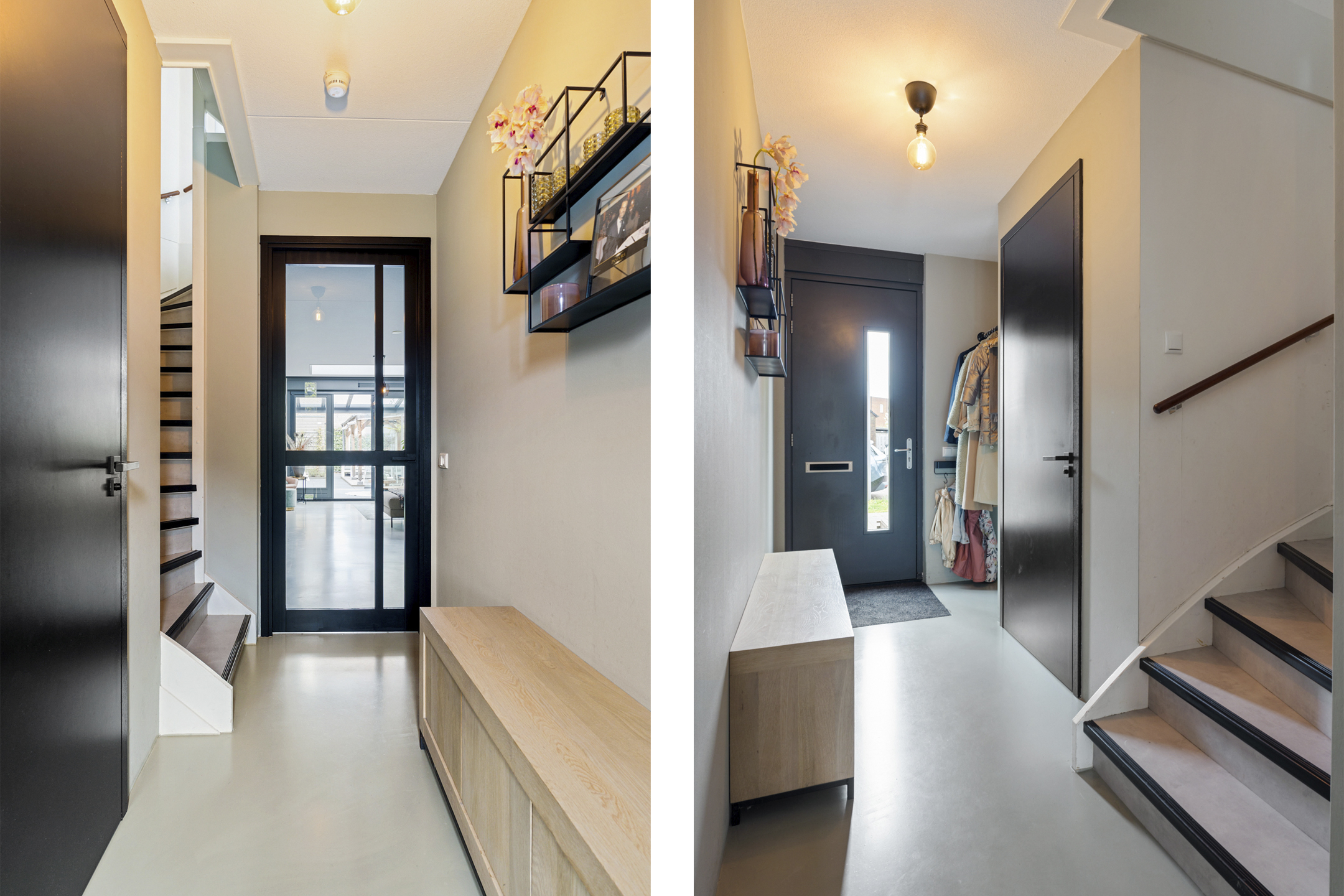 Via de verzorgde voortuin stap je binnen in de entreehal met garderoberuimte, meterkast en een modern toilet met fonteintje. De ruime woonkamer is voorzien van een fraaie gietvloer met vloerverwarming en baadt in het licht dankzij de grote raampartijen aan de achterzijde.