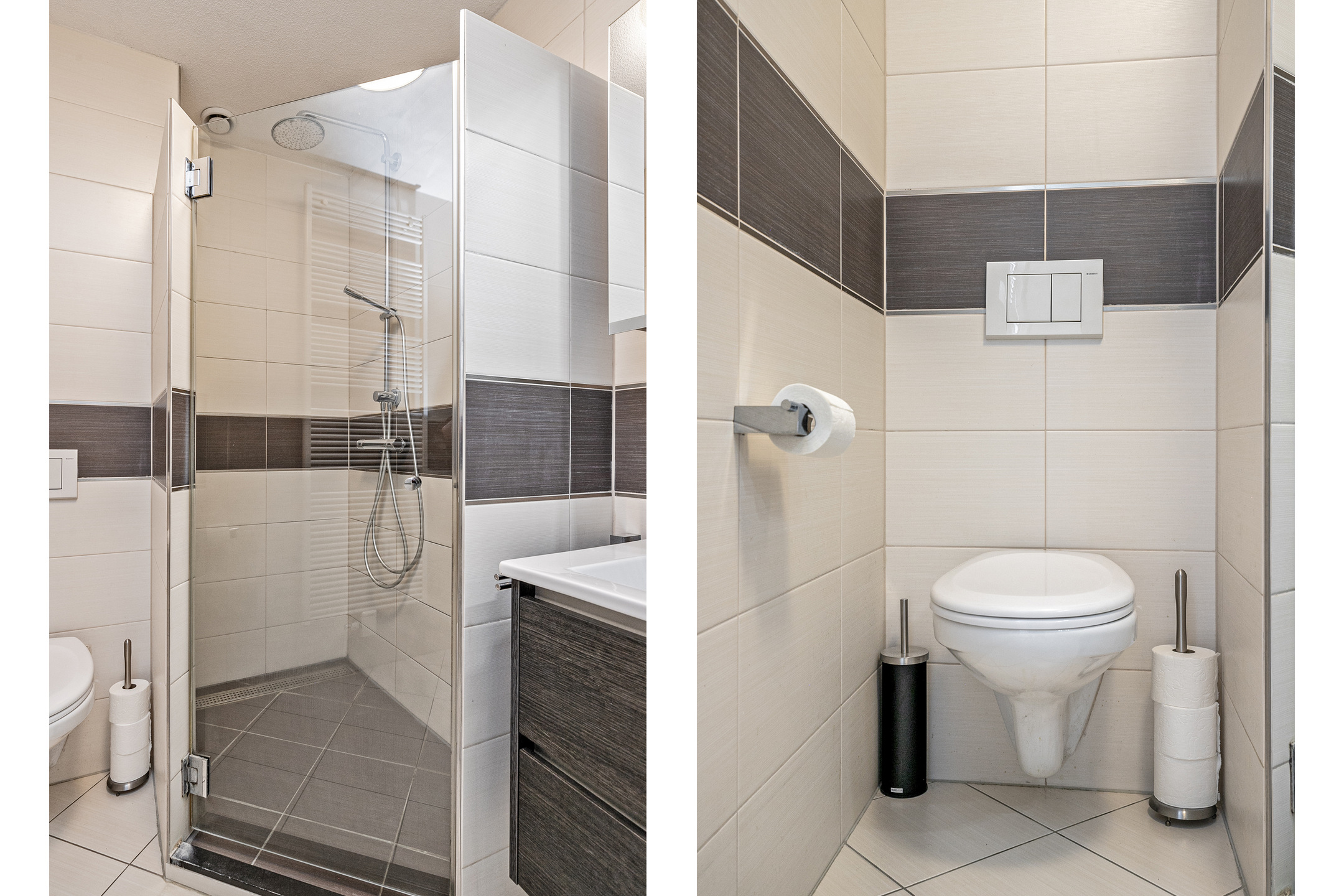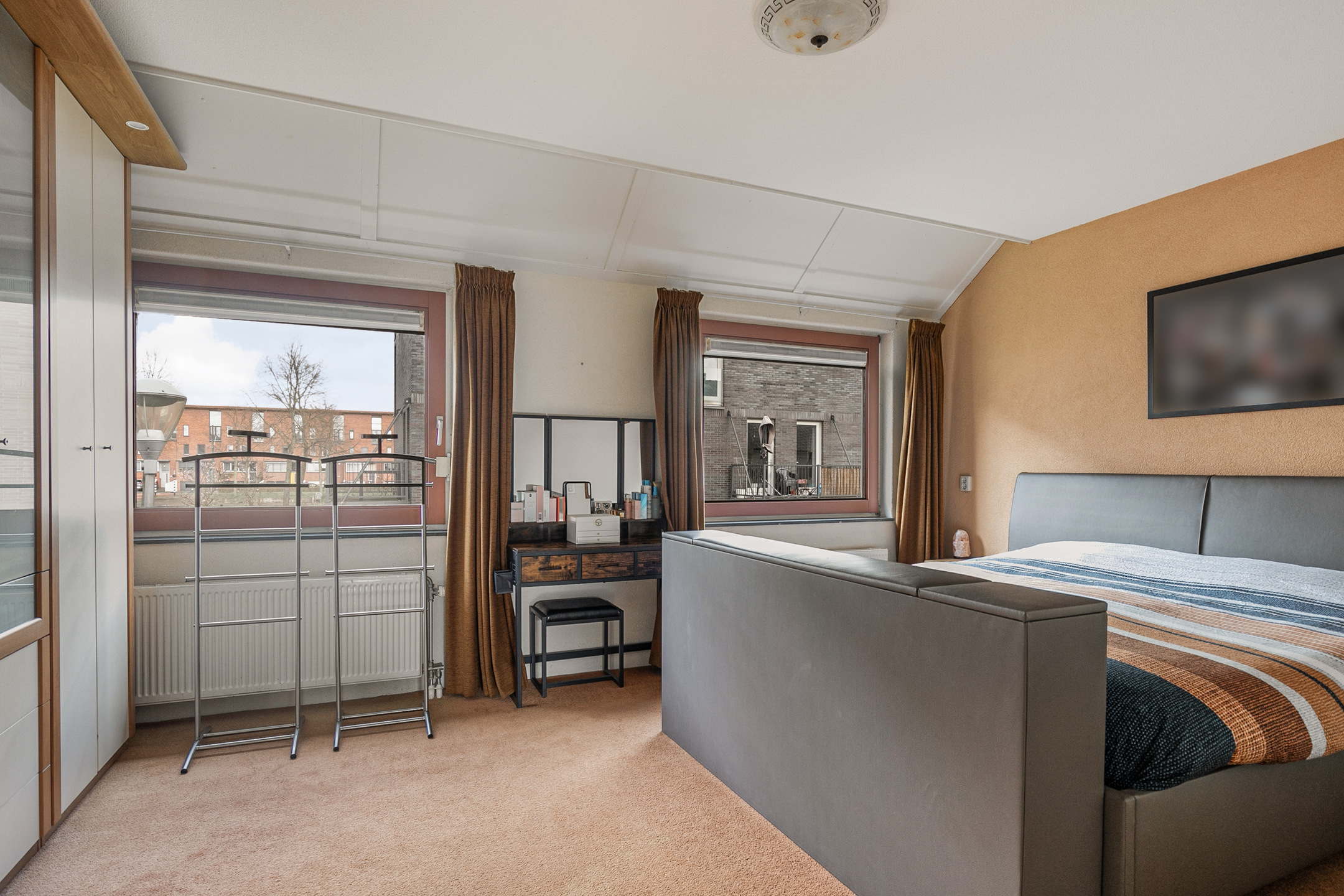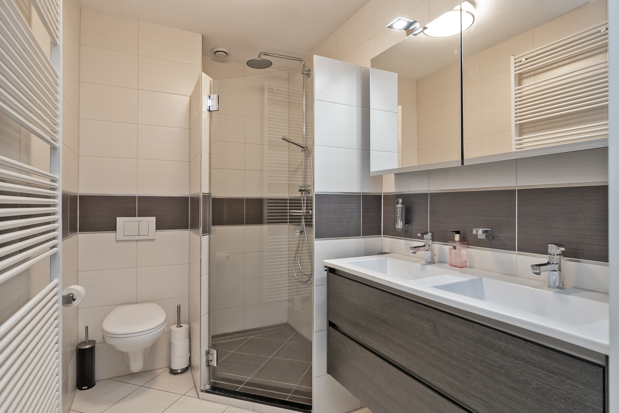 Trapopgang naar de eerste etage. Vanaf de overloop is er toegang tot alle vertrekken. Een ruime slaapkamer ligt aan de voorzijde van de woning. De badkamer is voorzien van een douche, een wastafelmeubel met dubbele wastafels, een spiegelkast en een wandcloset.