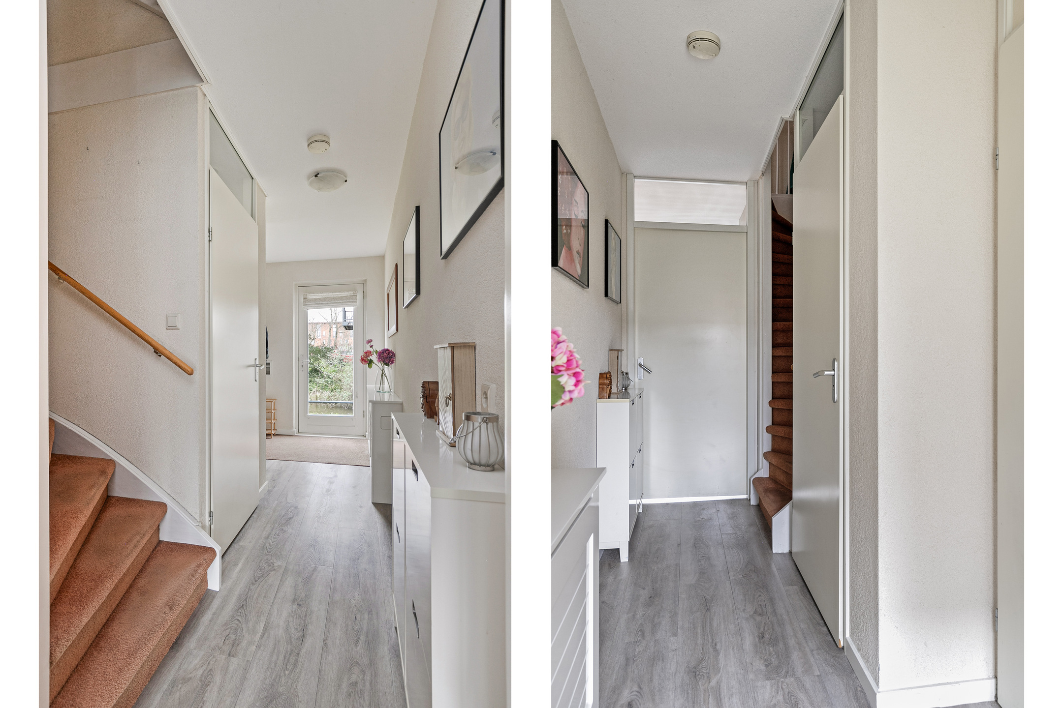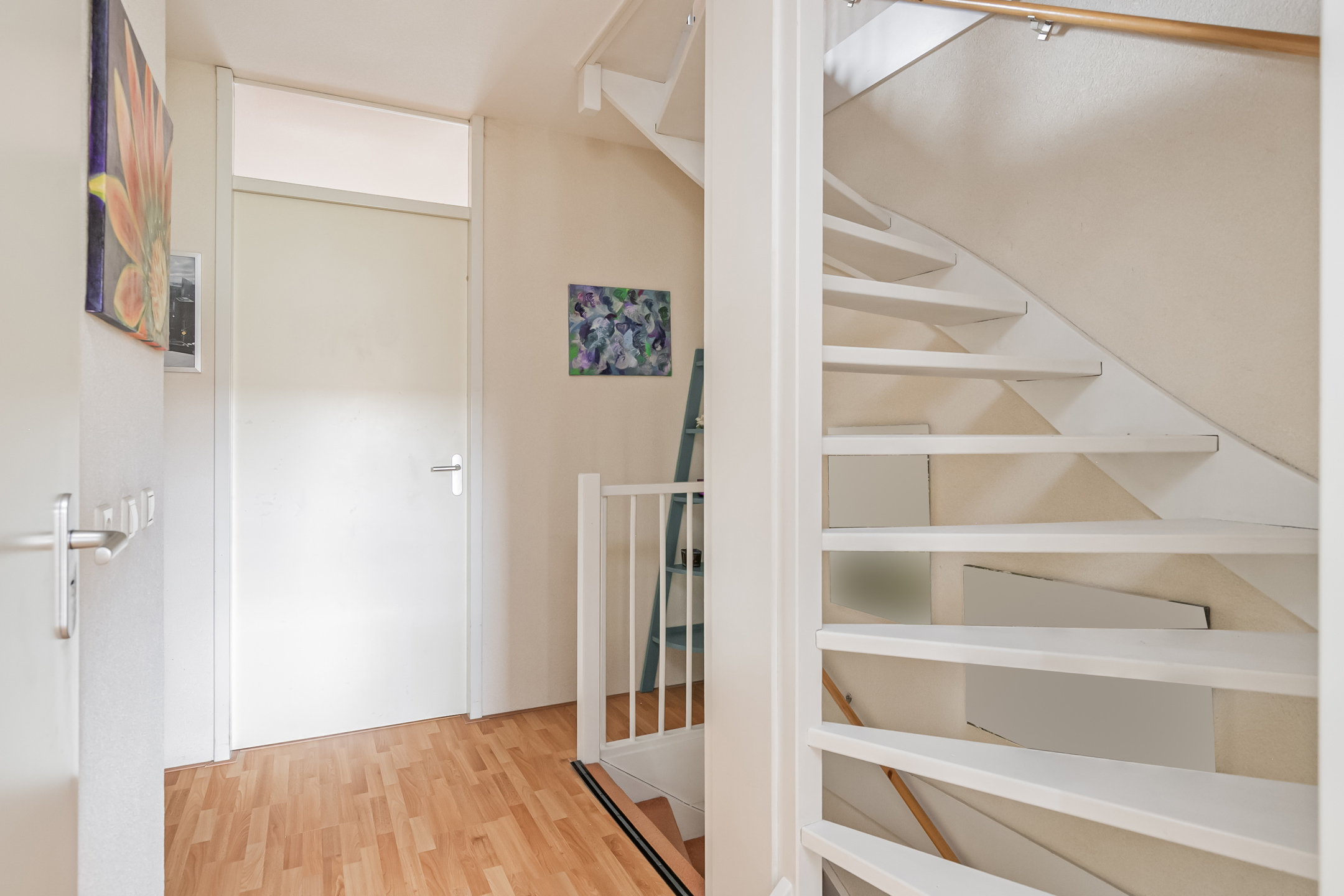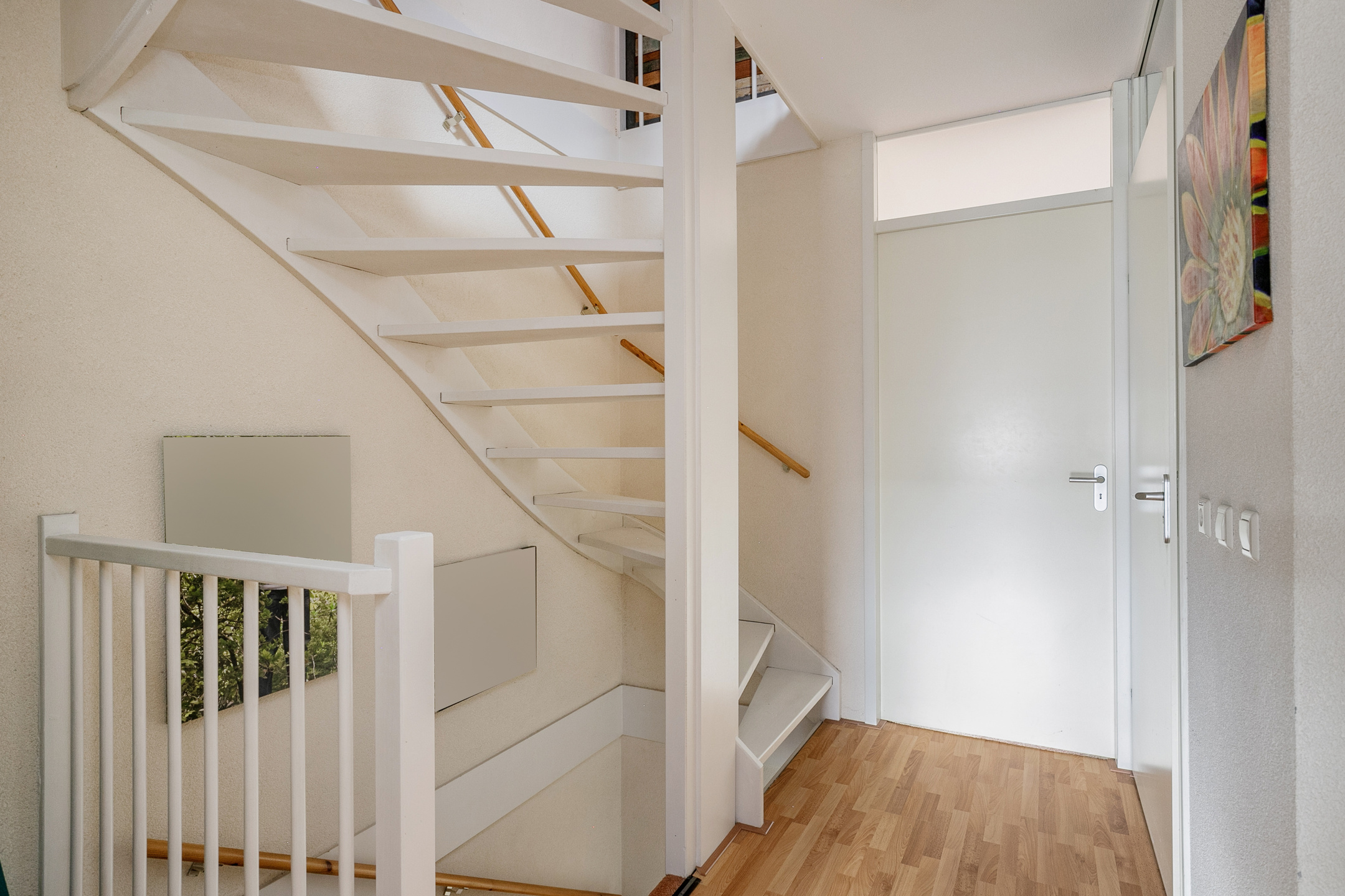 Ruime entreehal met toegang tot het toilet, trapopgang naar de eerste verdieping en de woonkamer.