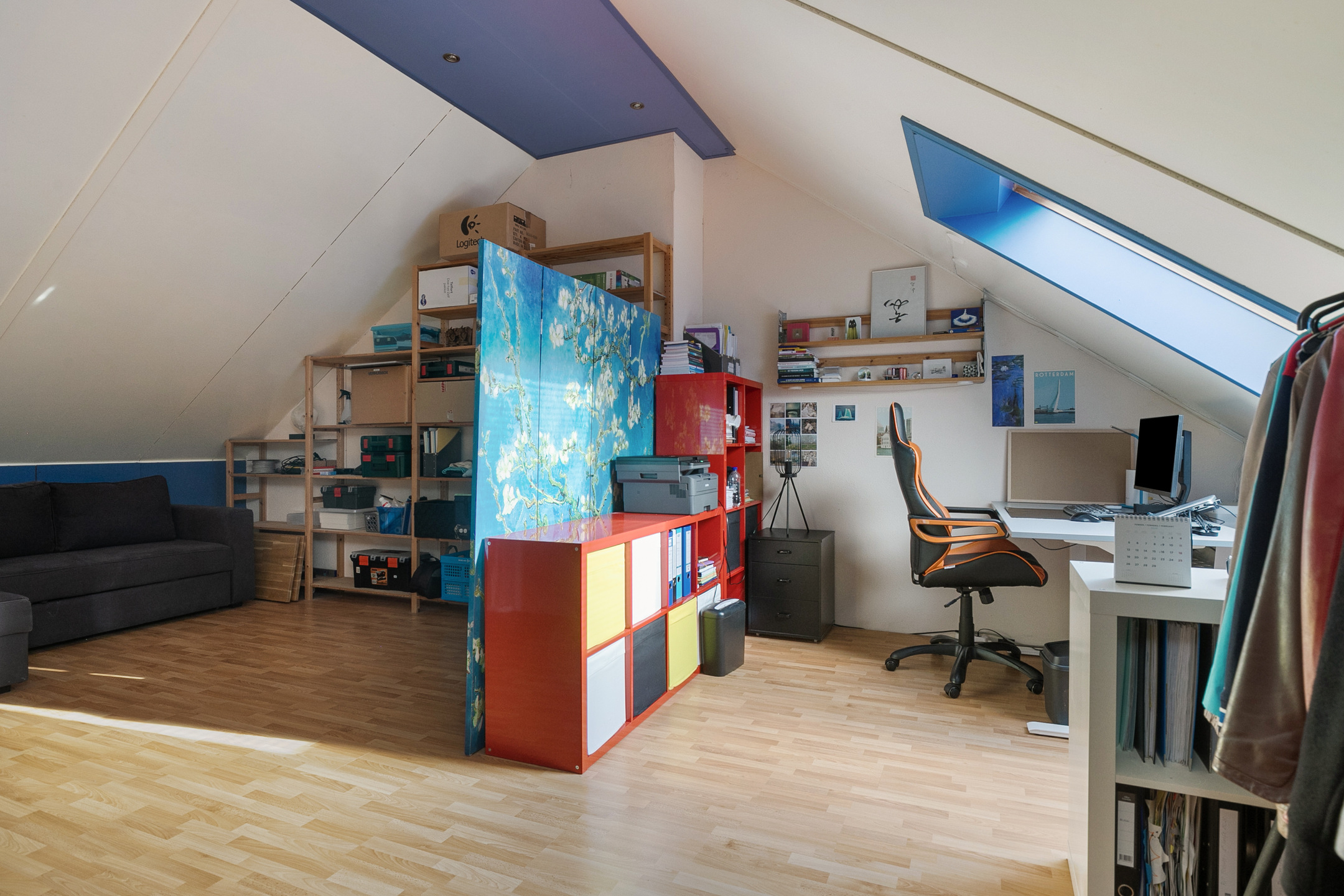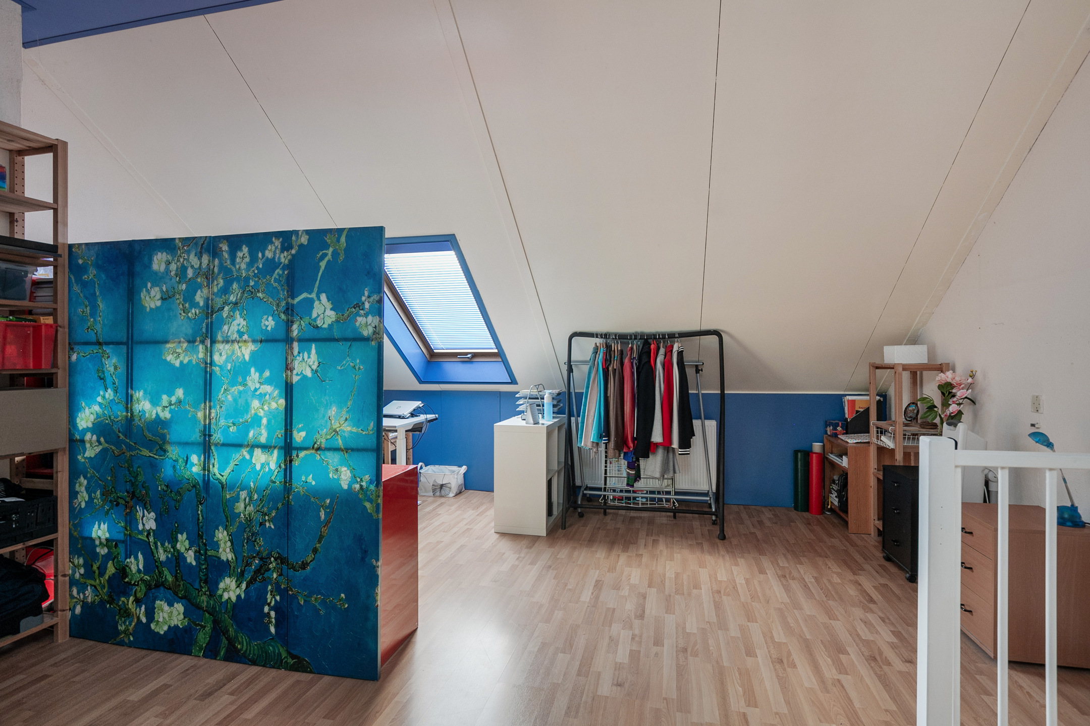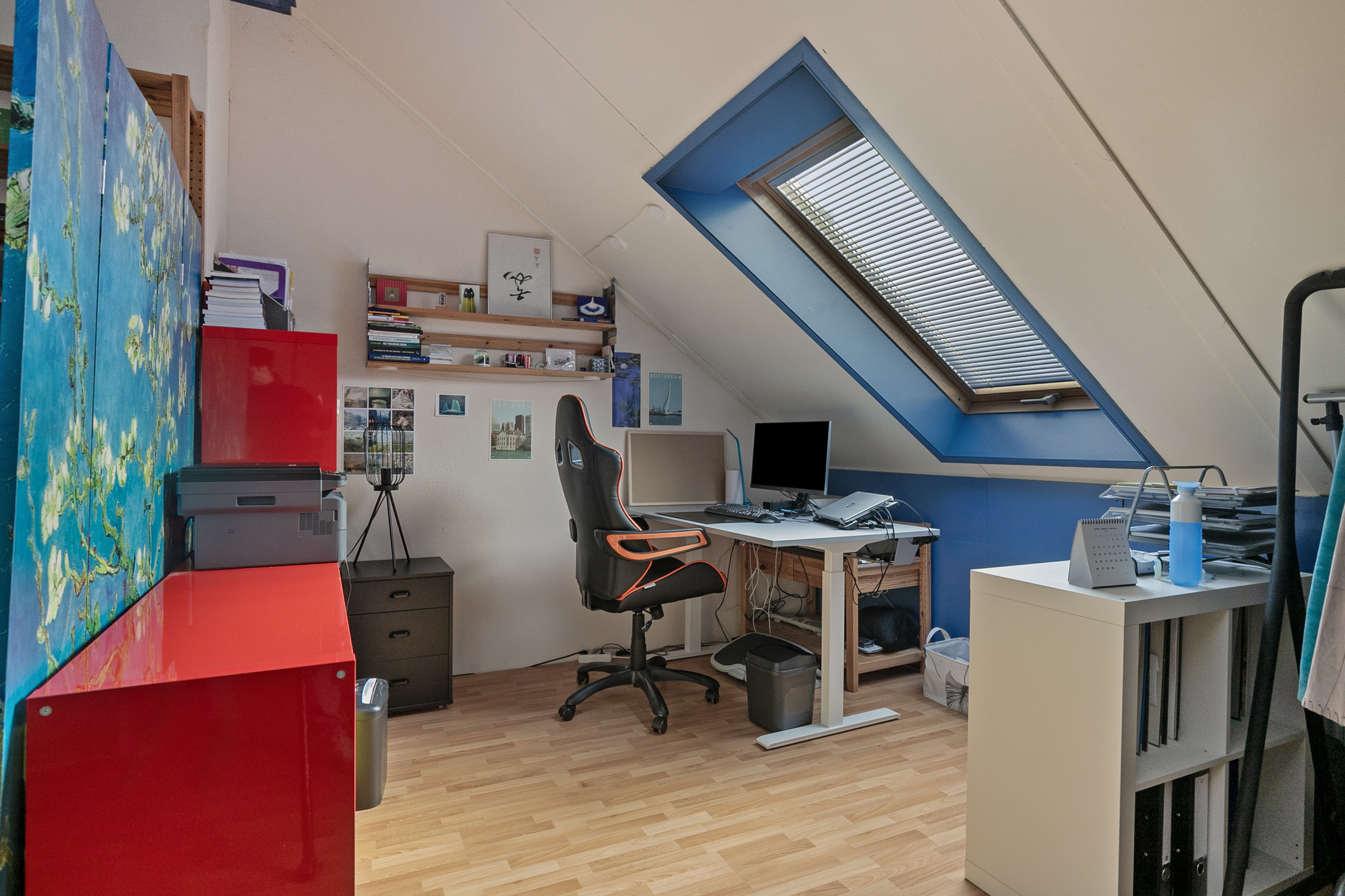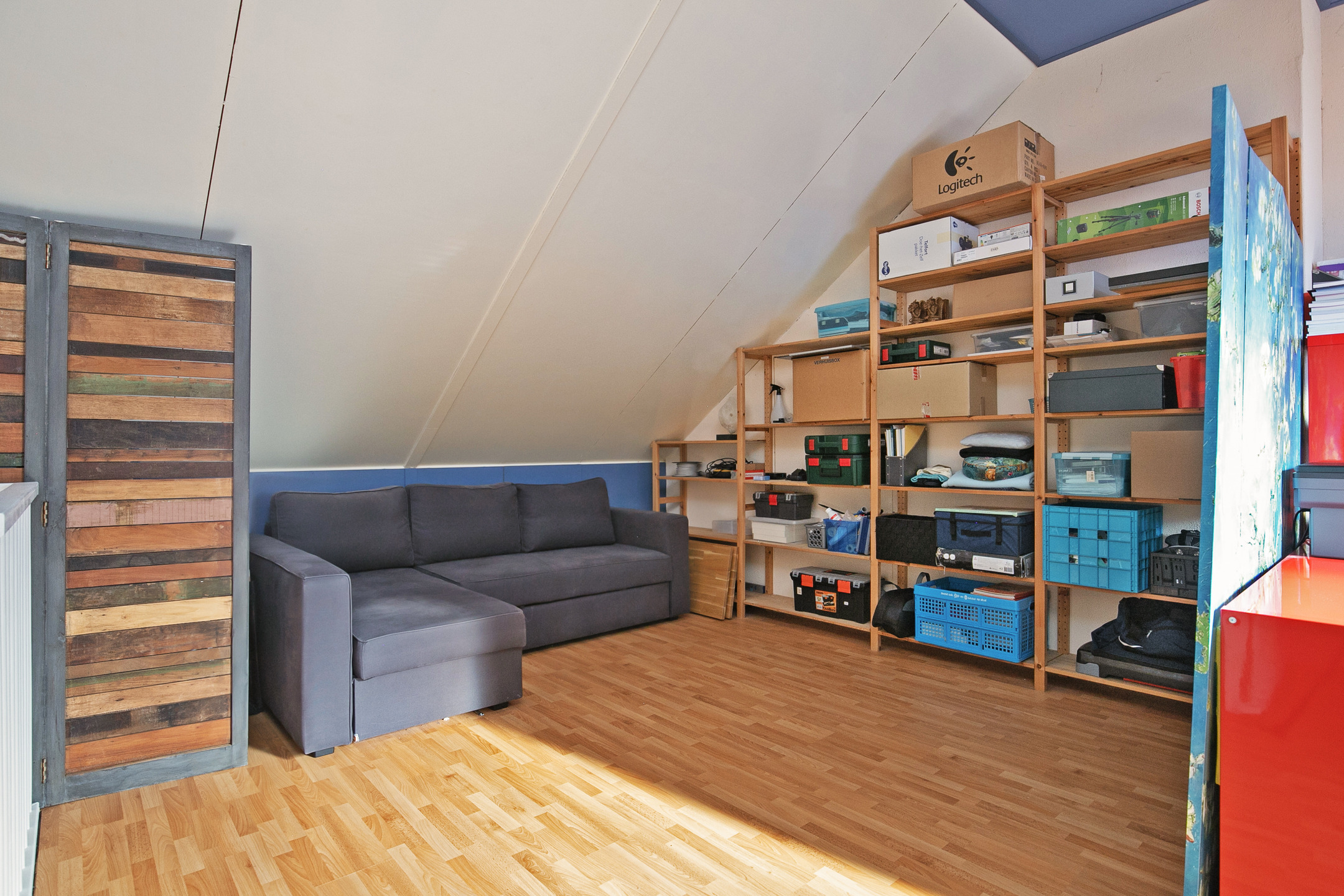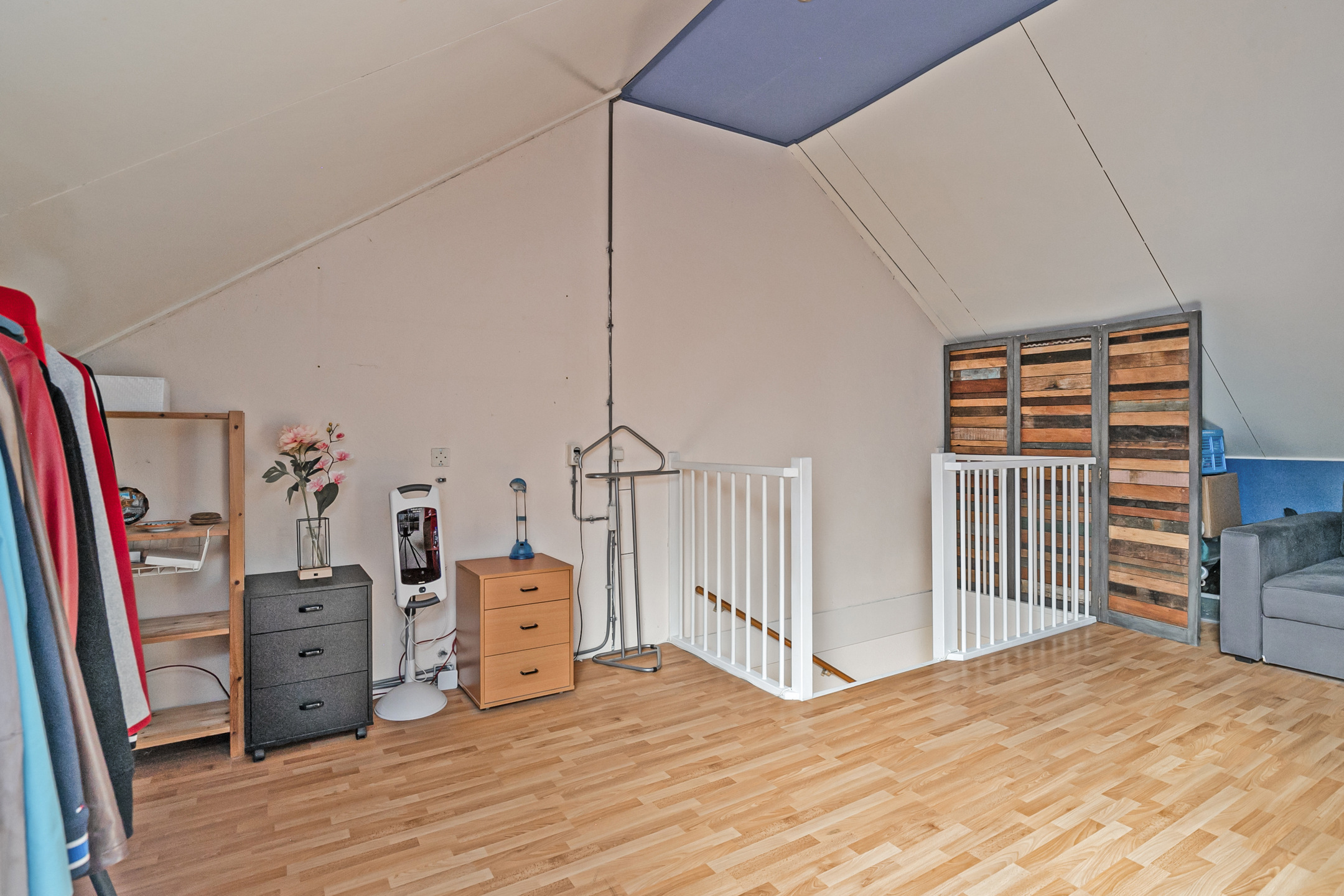 De trapopgang naar de zolderverdieping brengt je naar de open zolderruimte. De zolderetage is erg ruim en voorzien van een dakraam en voldoende opbergruimte.