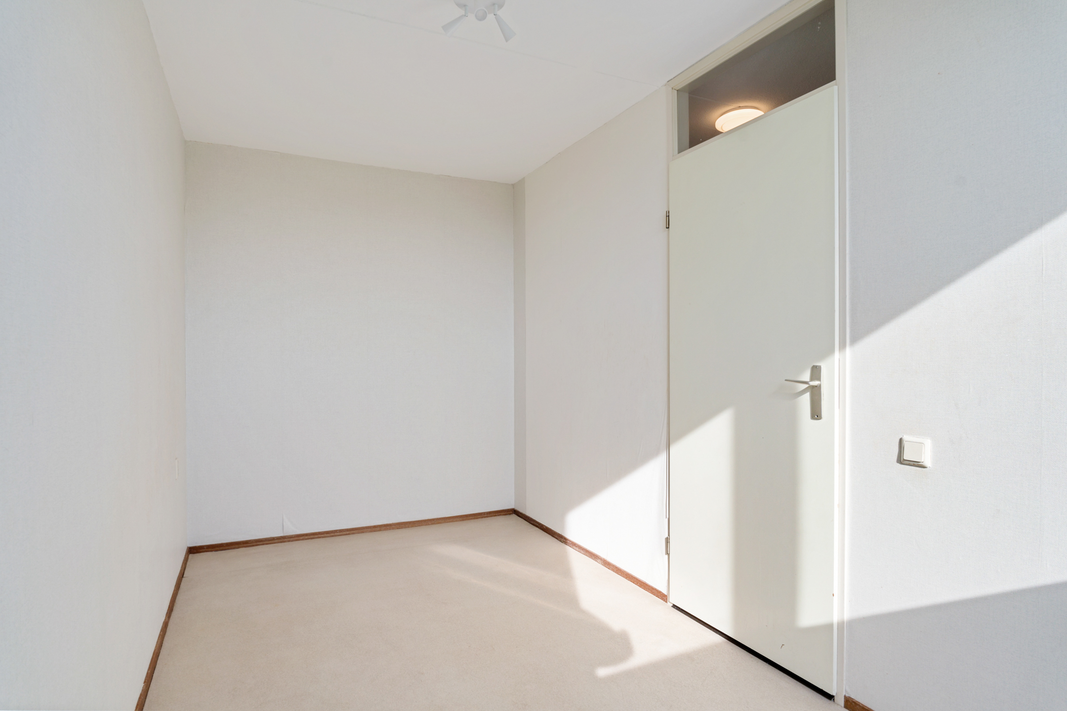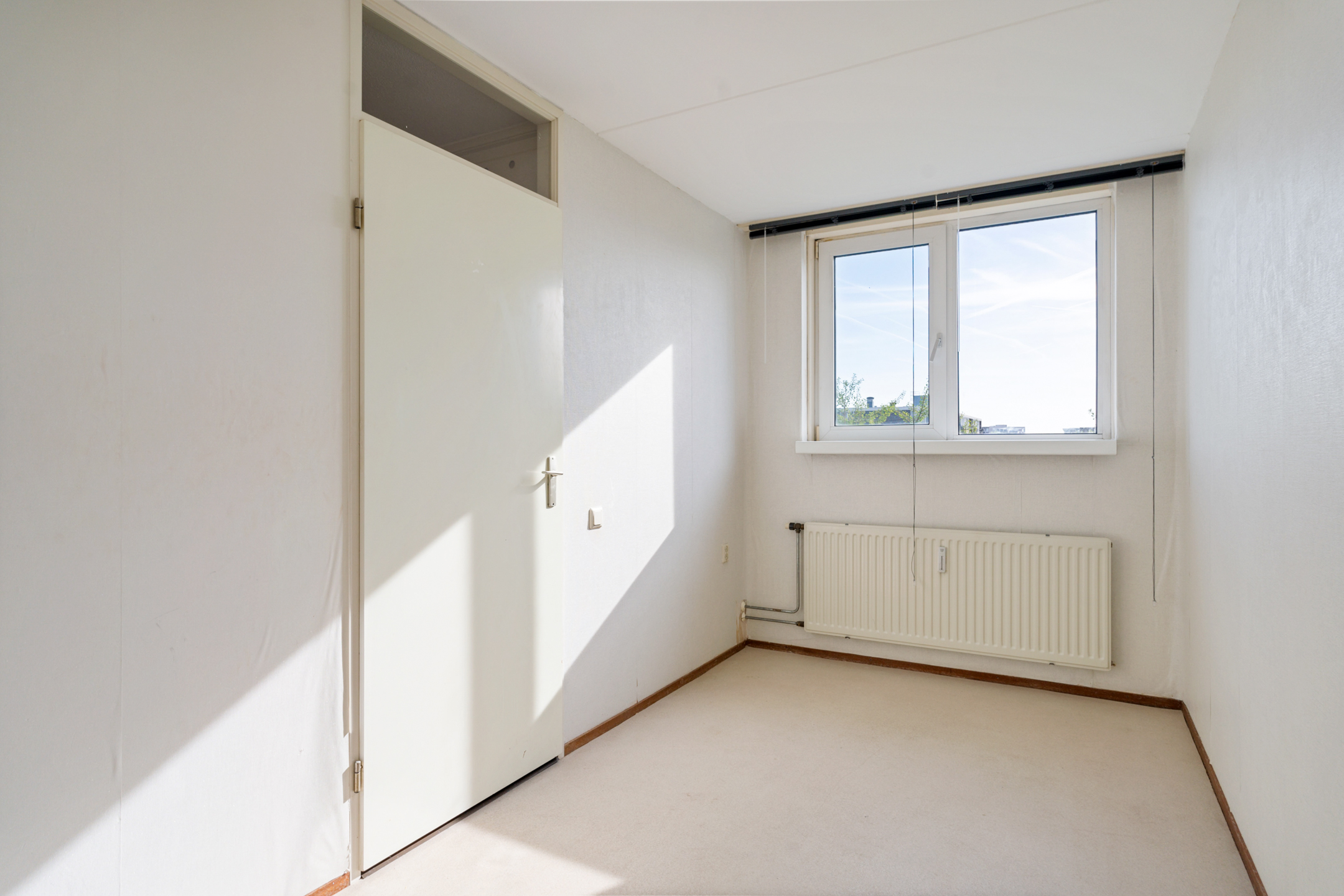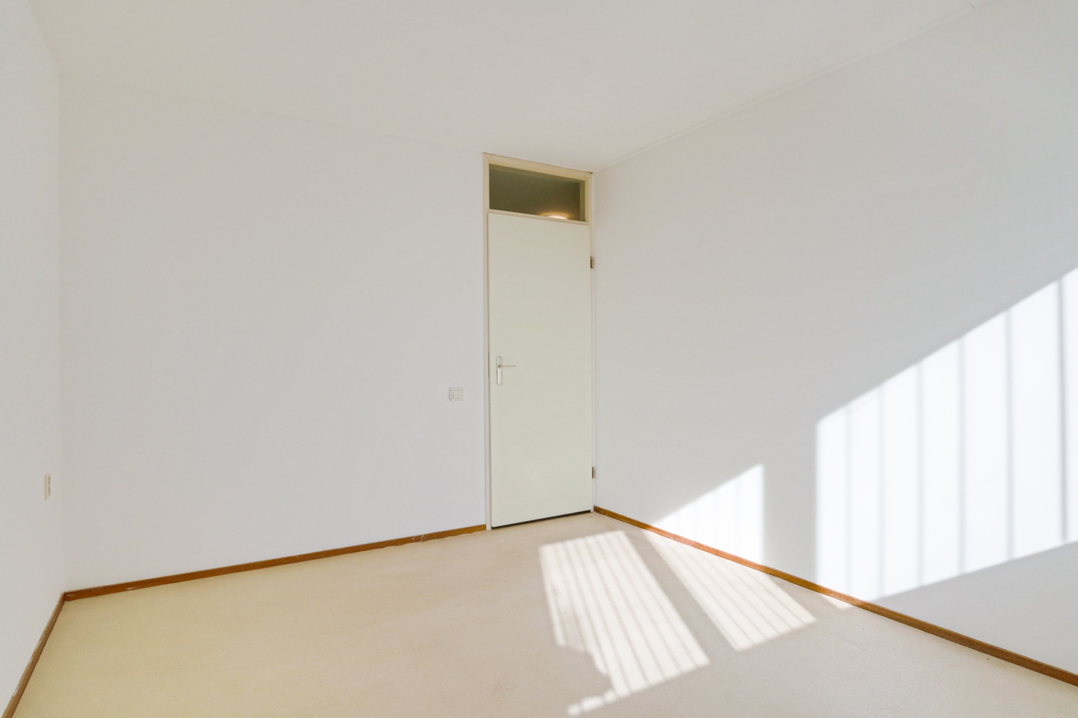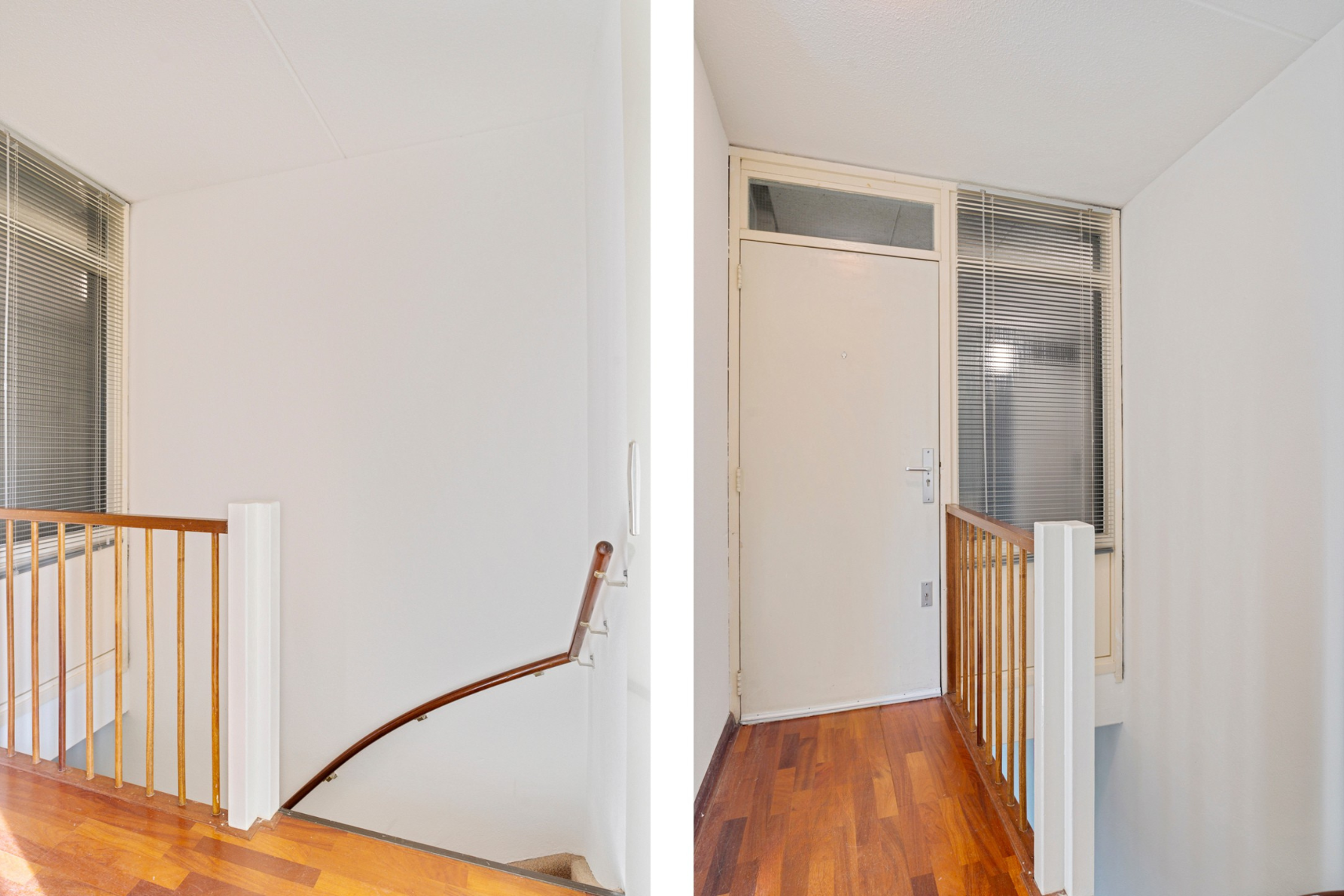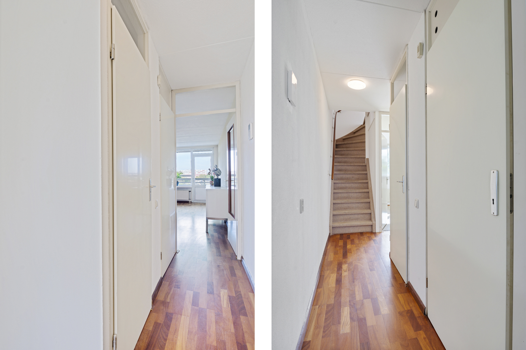 Je komt de woning binnen op de bovenste woonlaag. Hier vind je direct een lichte slaapkamer en een praktische inloopkast. Via de vaste trap bereik je de woonverdieping.
