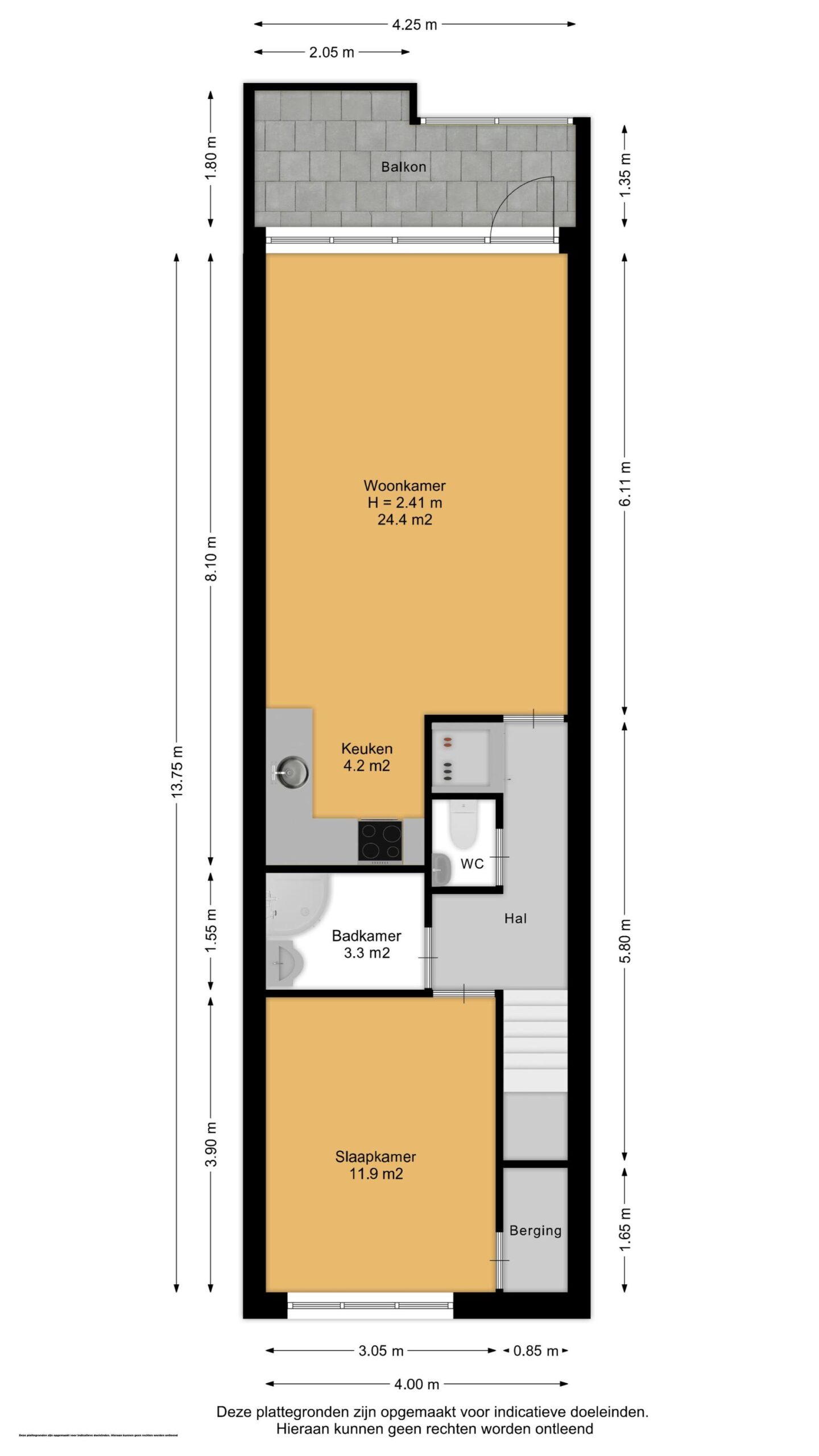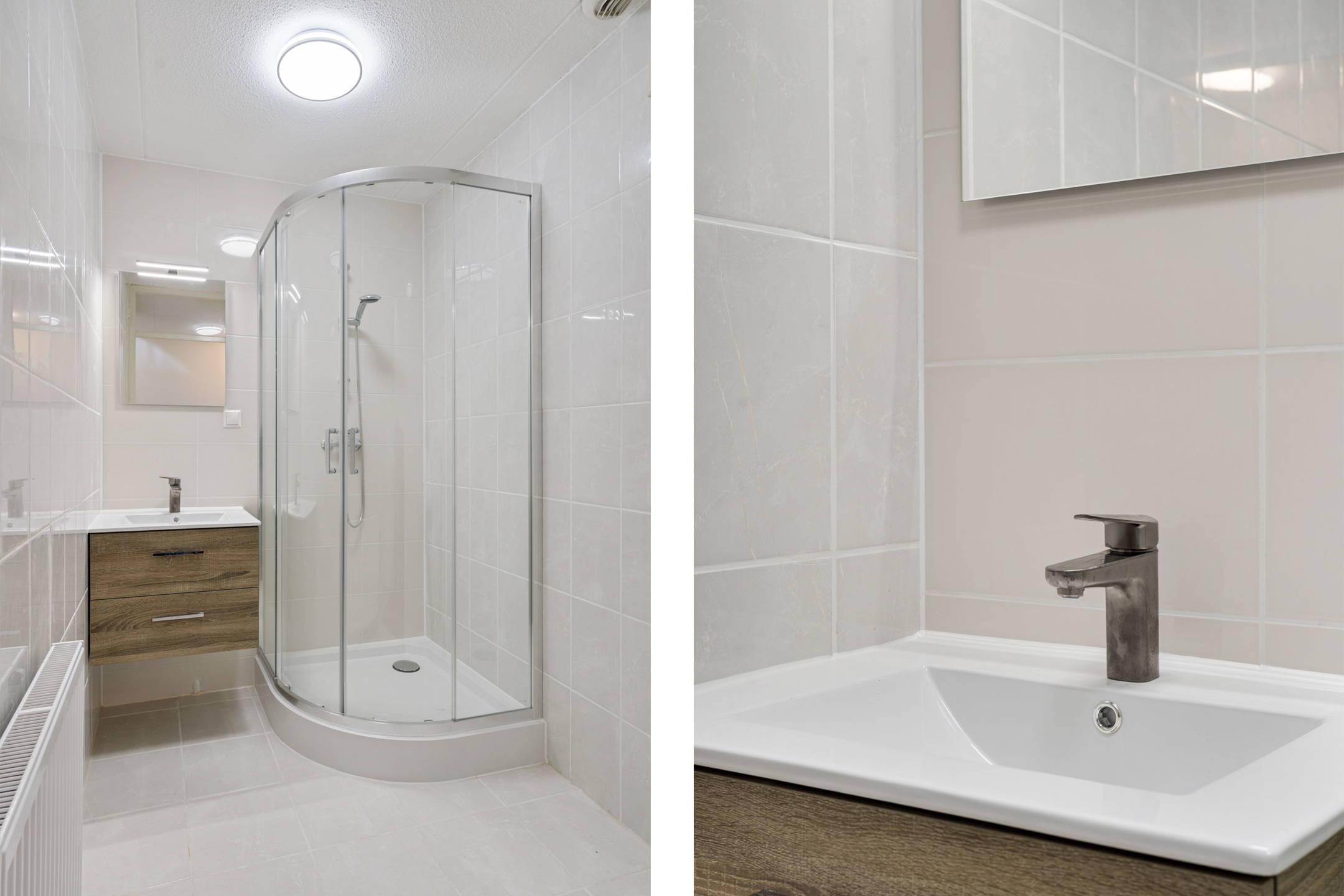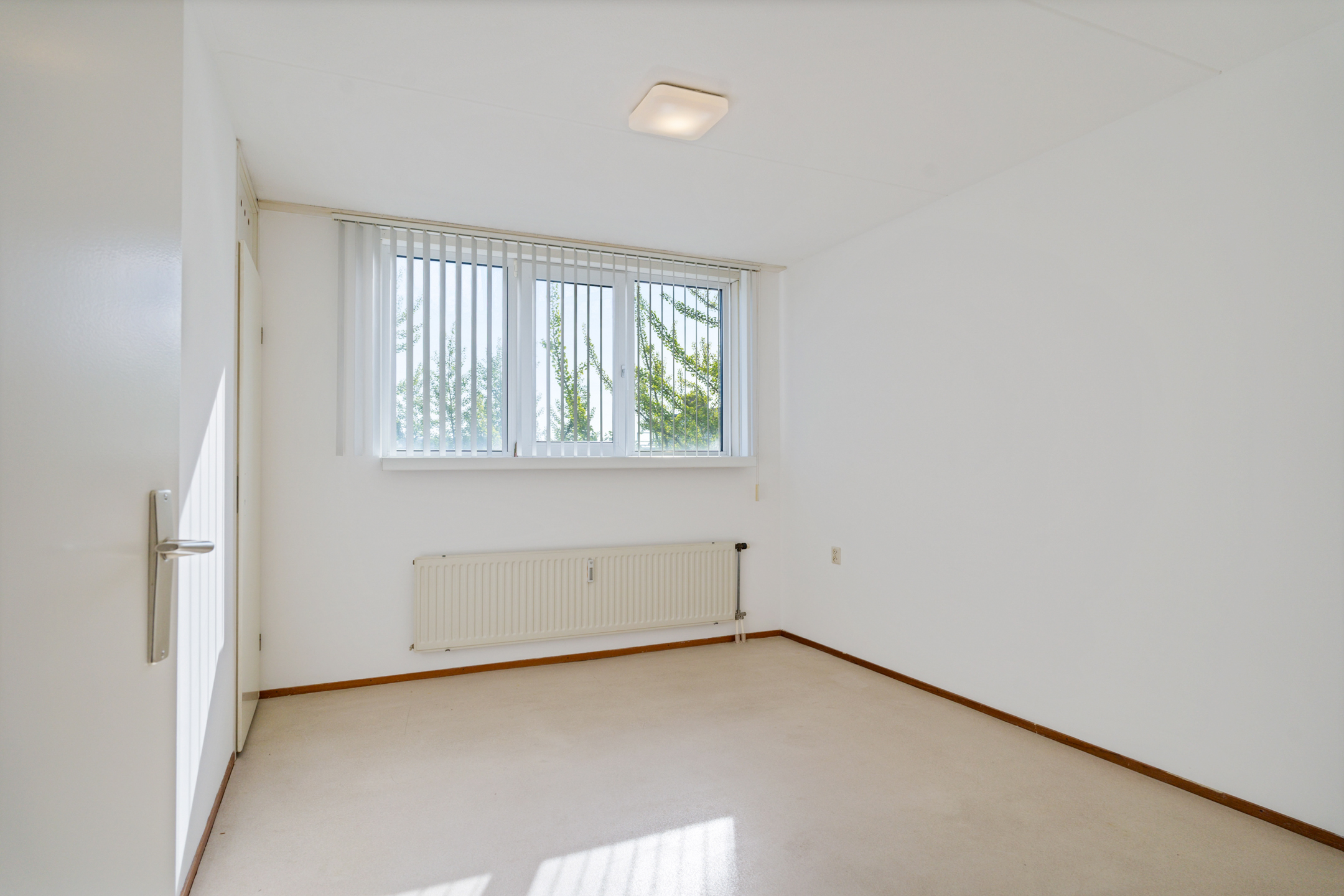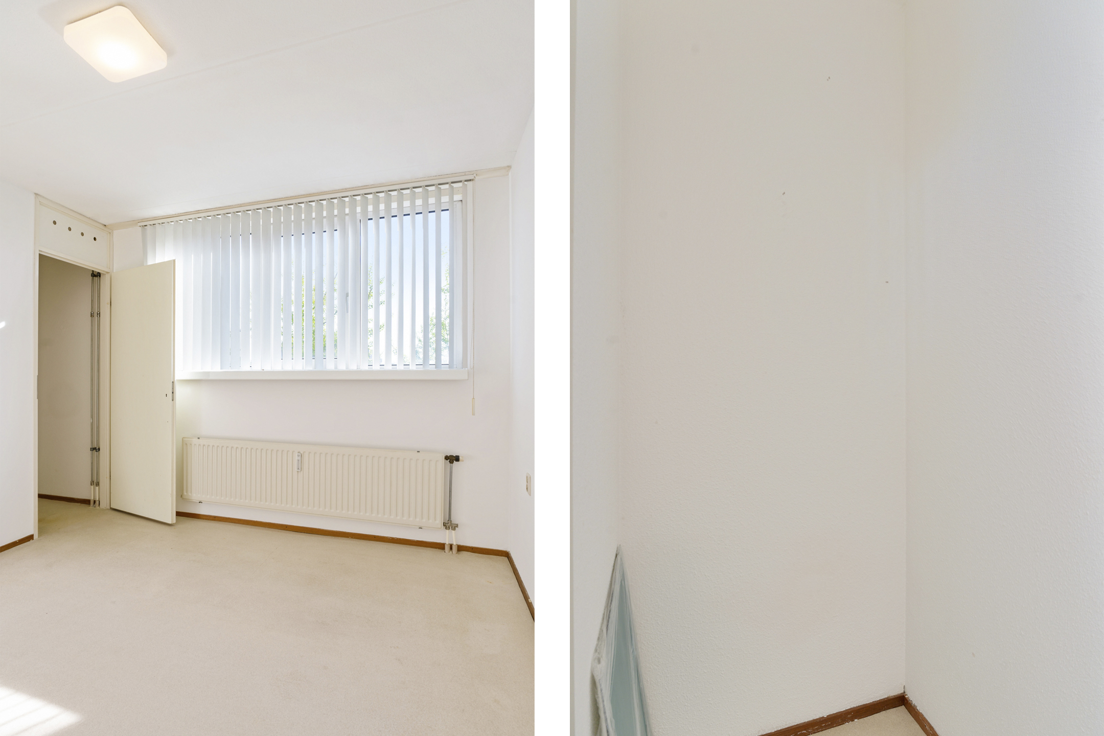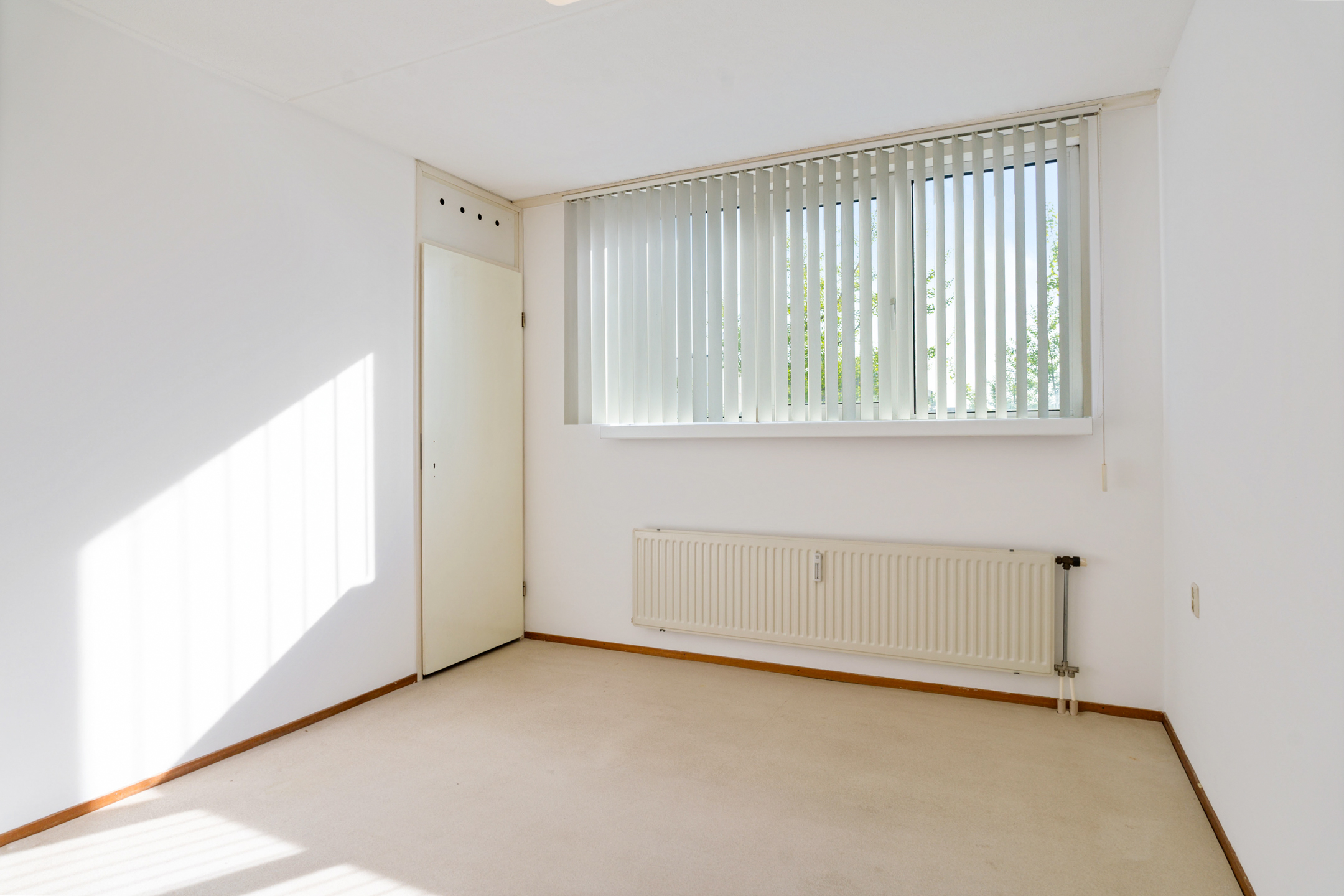 Je komt de woning binnen op de bovenste woonlaag. Hier vind je direct een lichte slaapkamer en een praktische inloopkast. Via de vaste trap bereik je de woonverdieping.