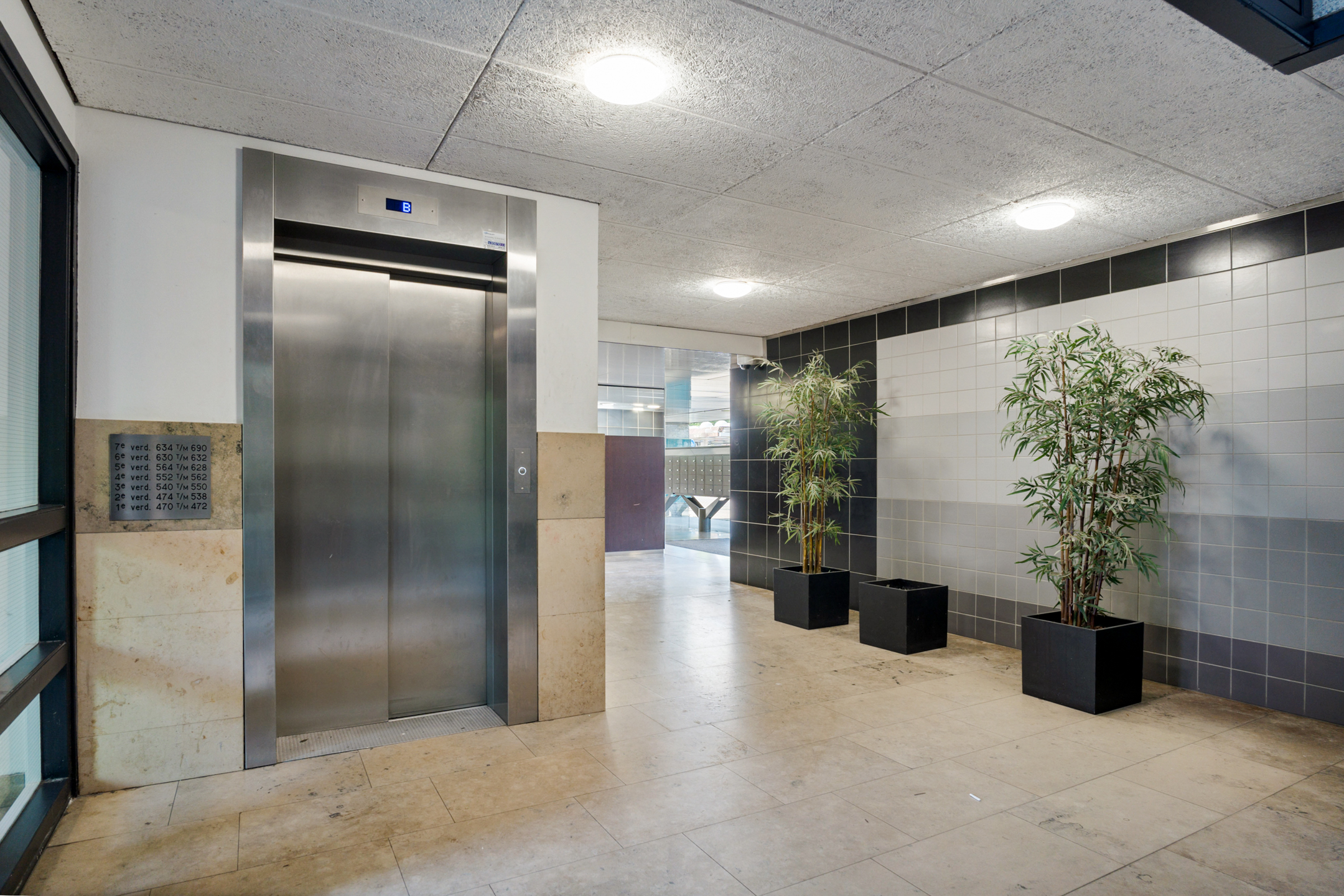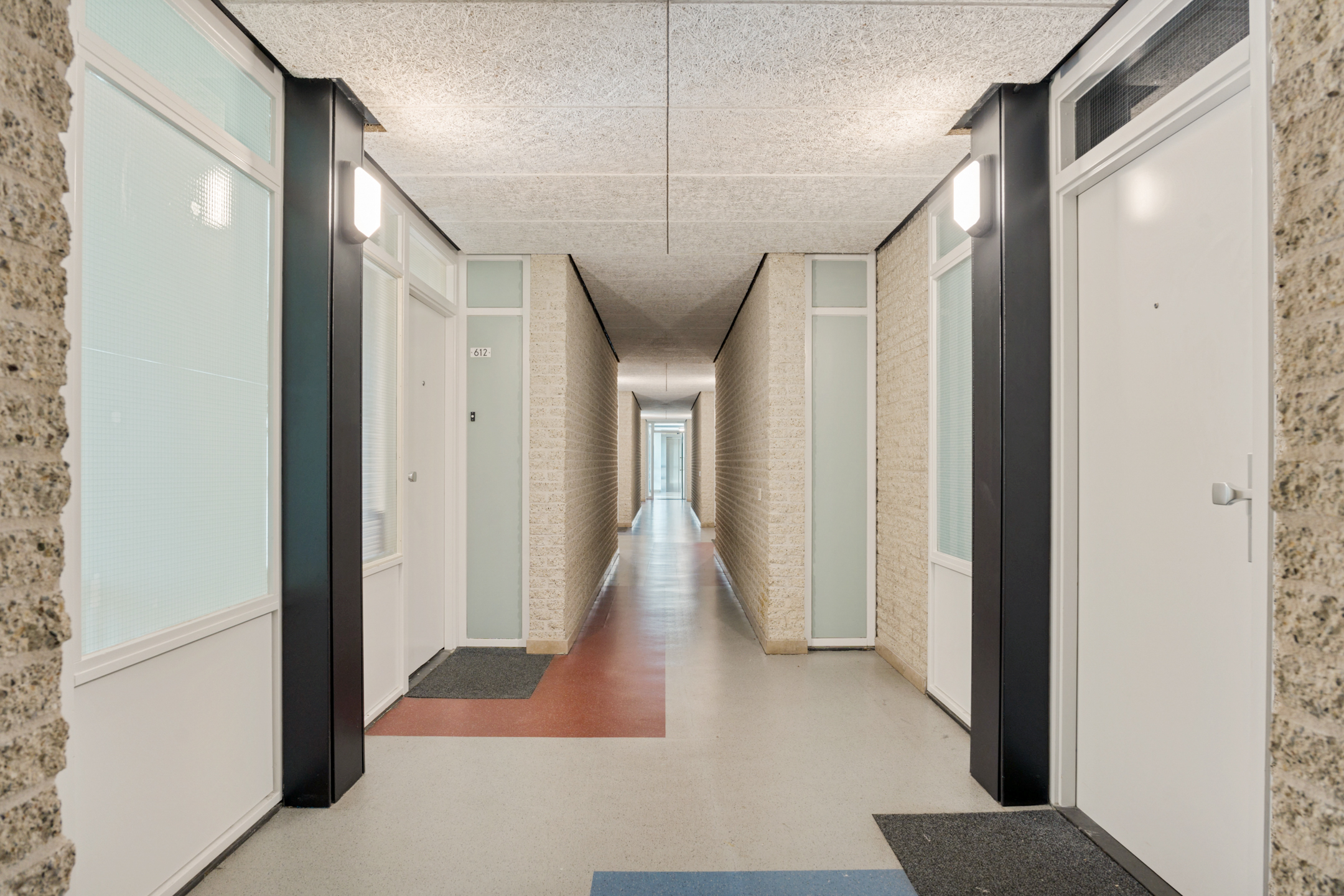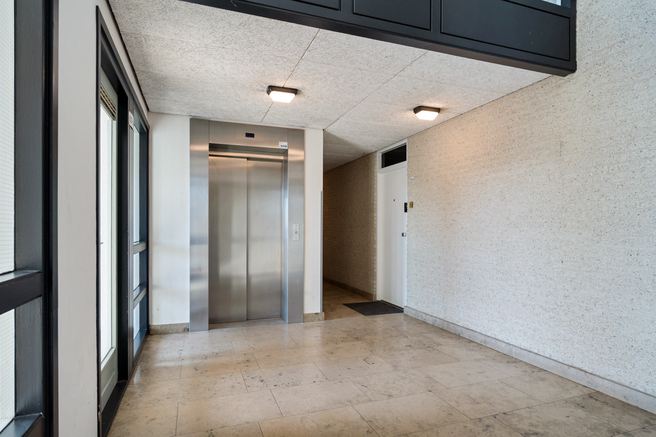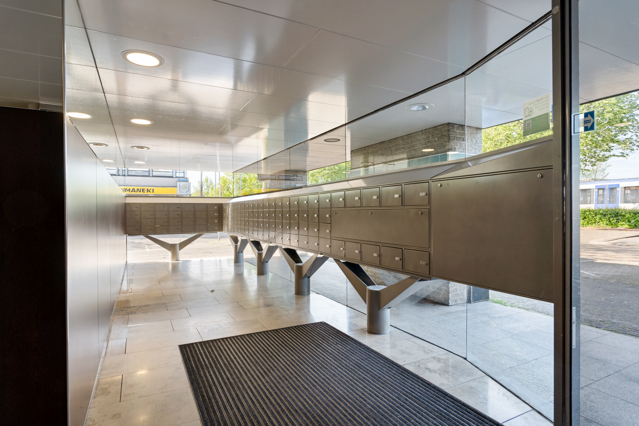 Afgesloten, nette entree van het appartementencomplex met bellentableau, brievenbussen en intercom met videocamera. Vanuit de centrale hal heb je toegang tot de lift, het trappenhuis, de bergingen en de containerruimte.