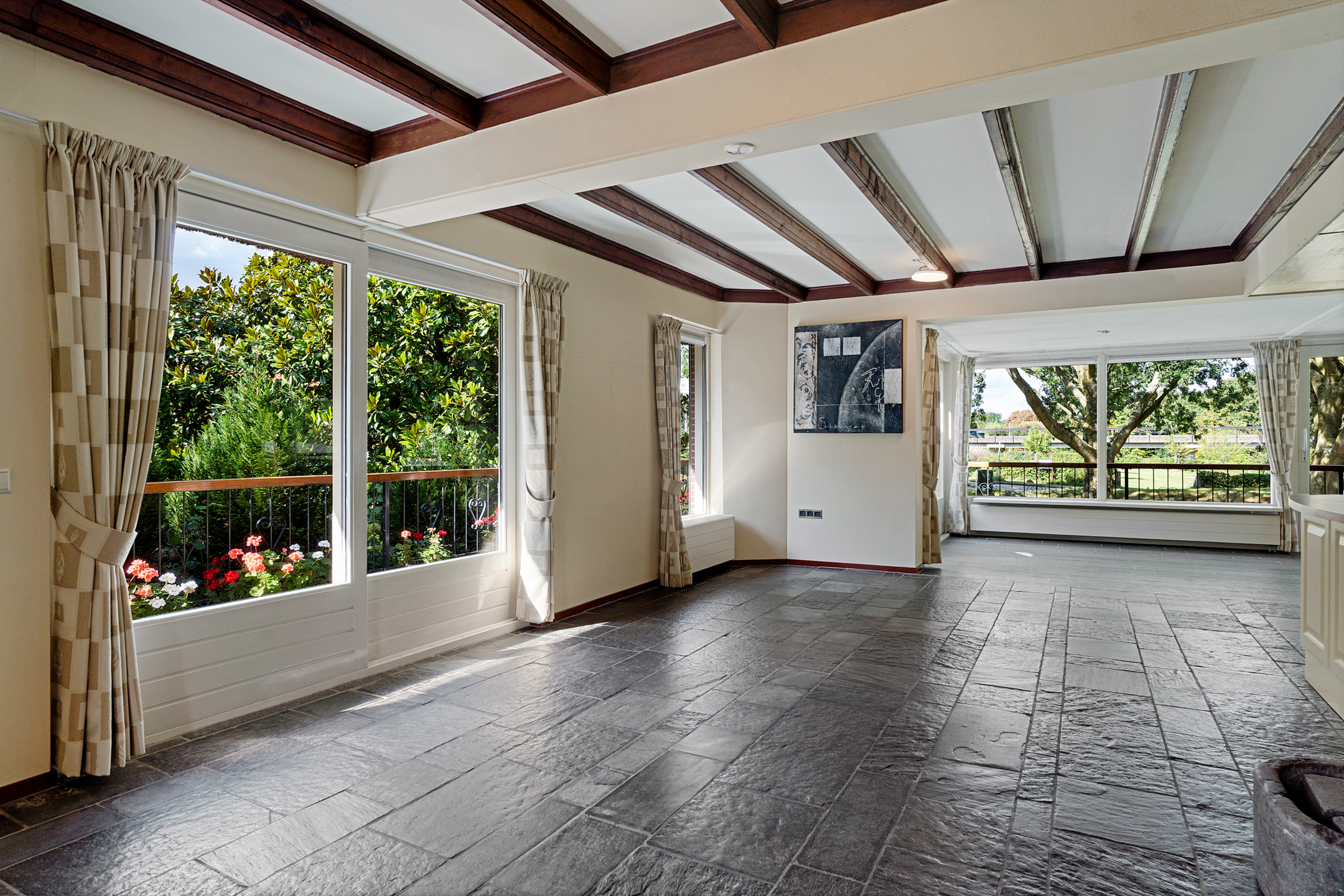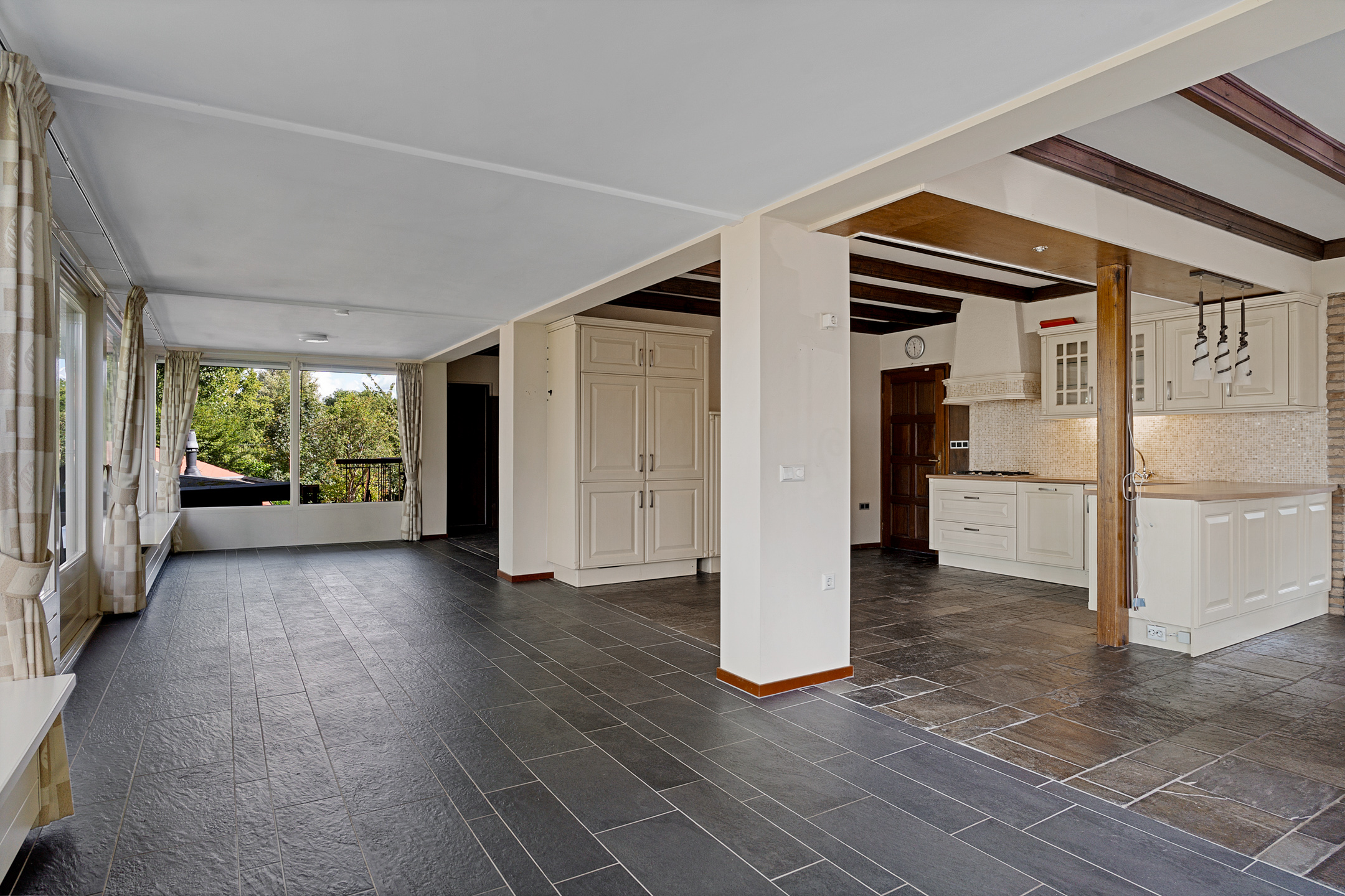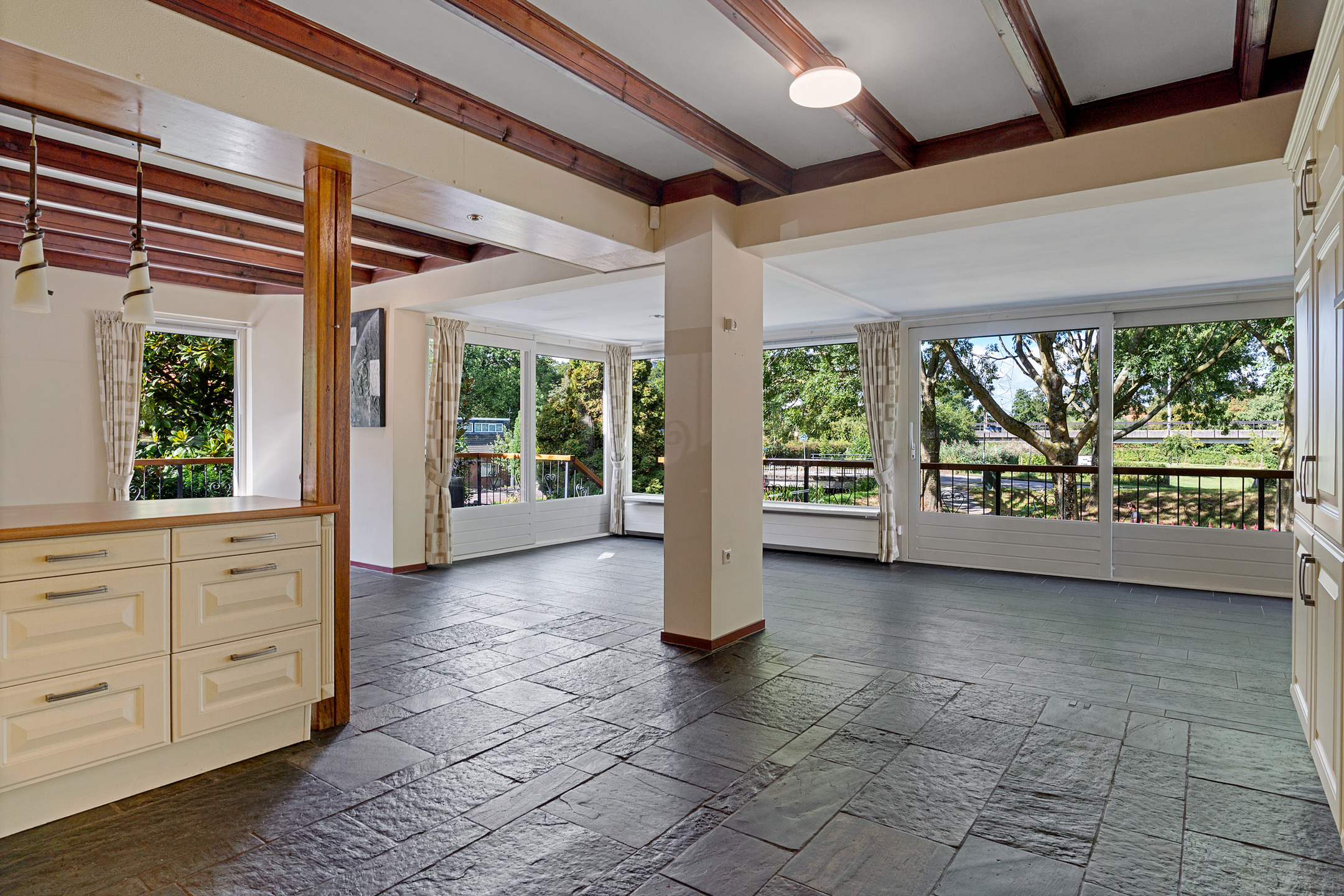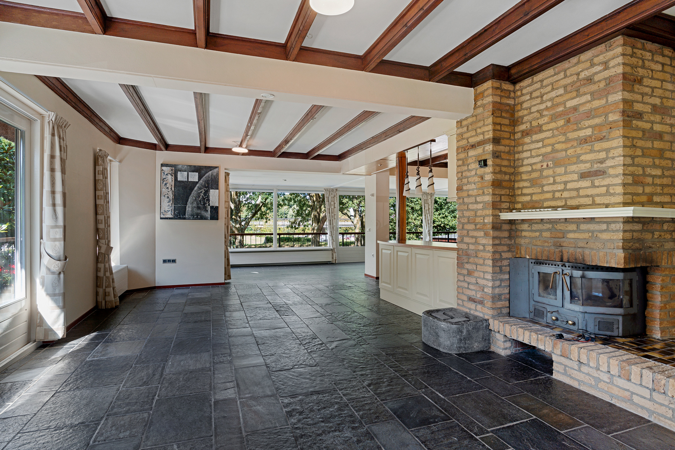 Via een brede trap bereikt u de verhoogde entree van de woning. De hal is langgerekt en functioneert als centrale as; direct rechts bevindt zich de zeer ruime woonkamer met open keuken. Deze leefruimte is opvallend licht dankzij de vele raampartijen aan drie zijden. Het hoge plafond met authentieke houten balken en een sfeervolle haard zorgen voor een warme uitstraling.