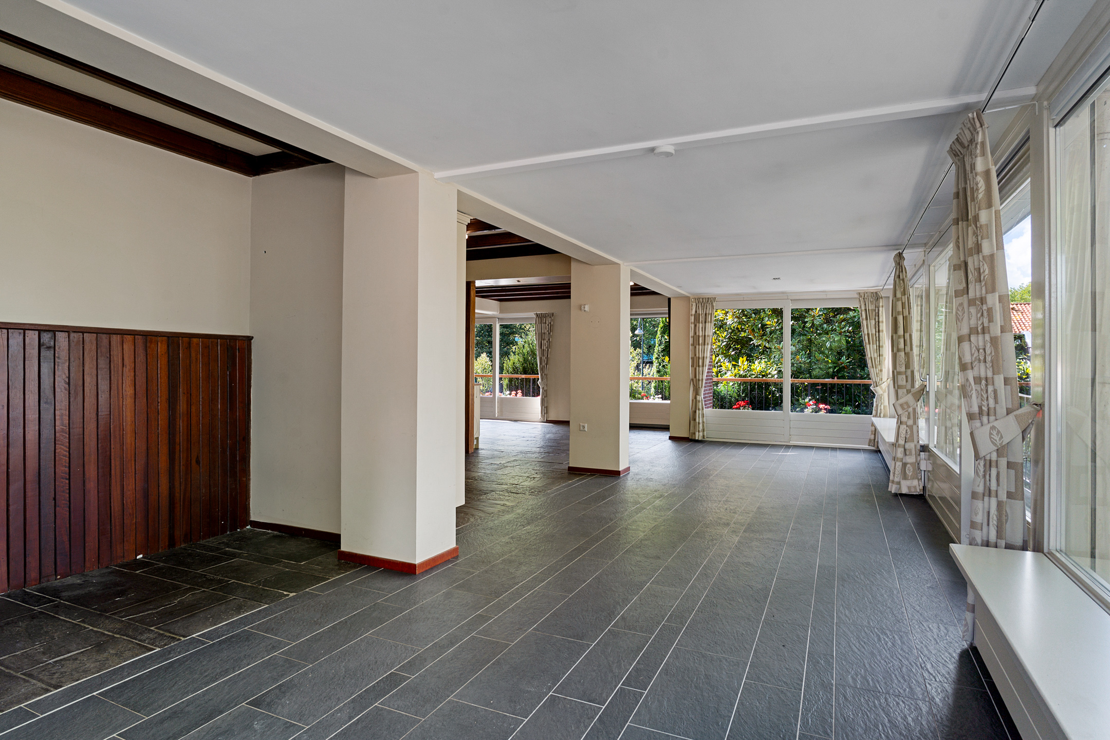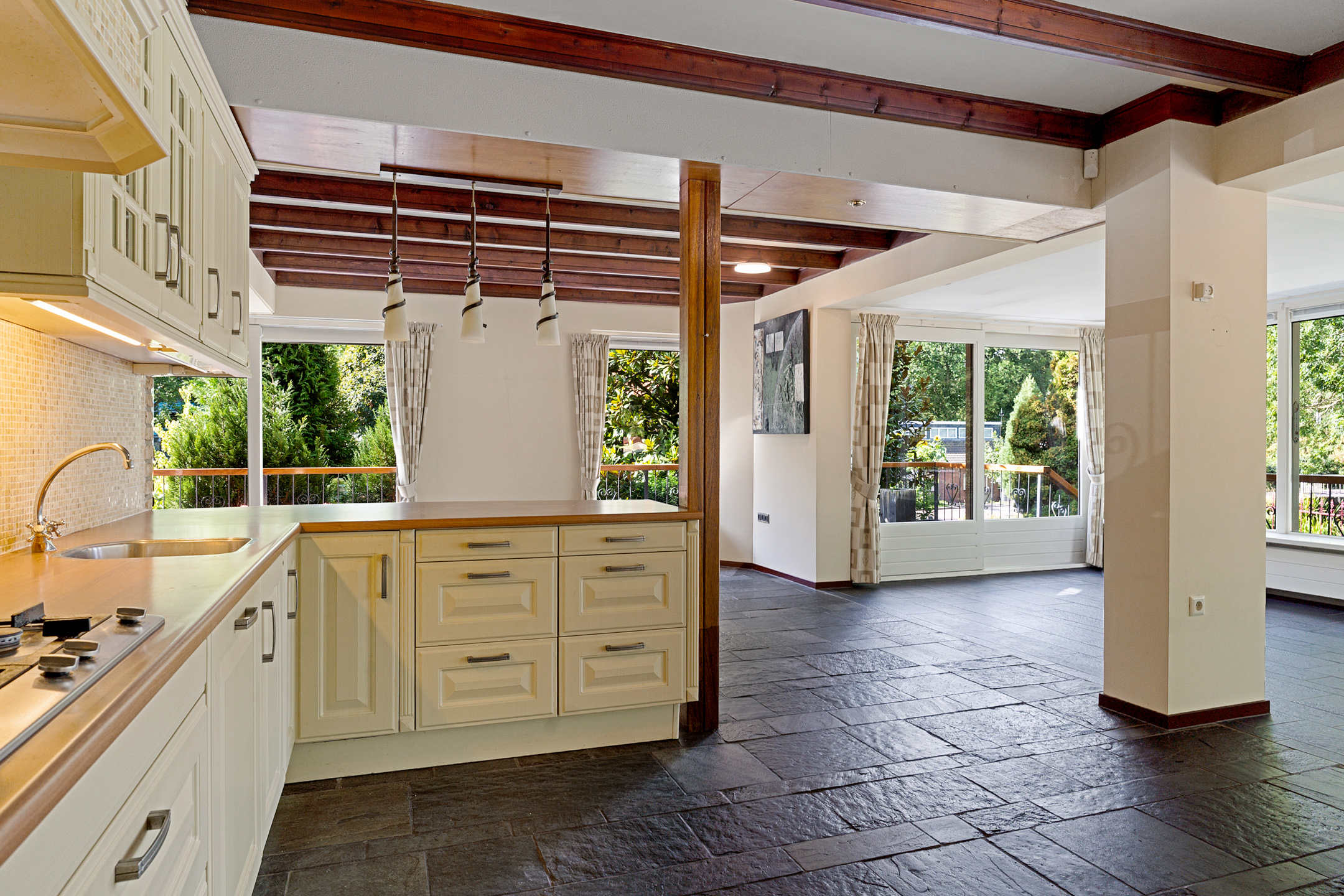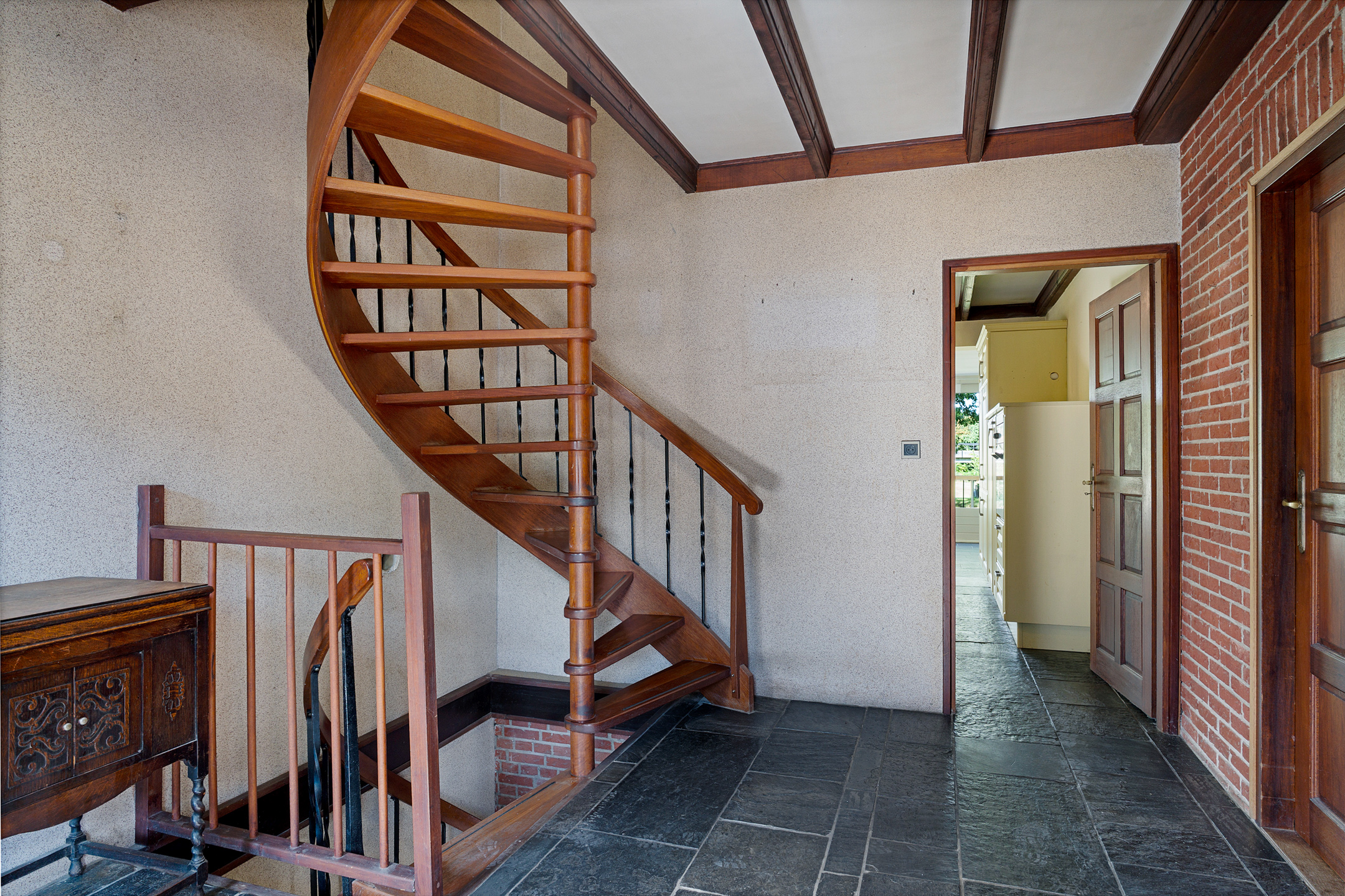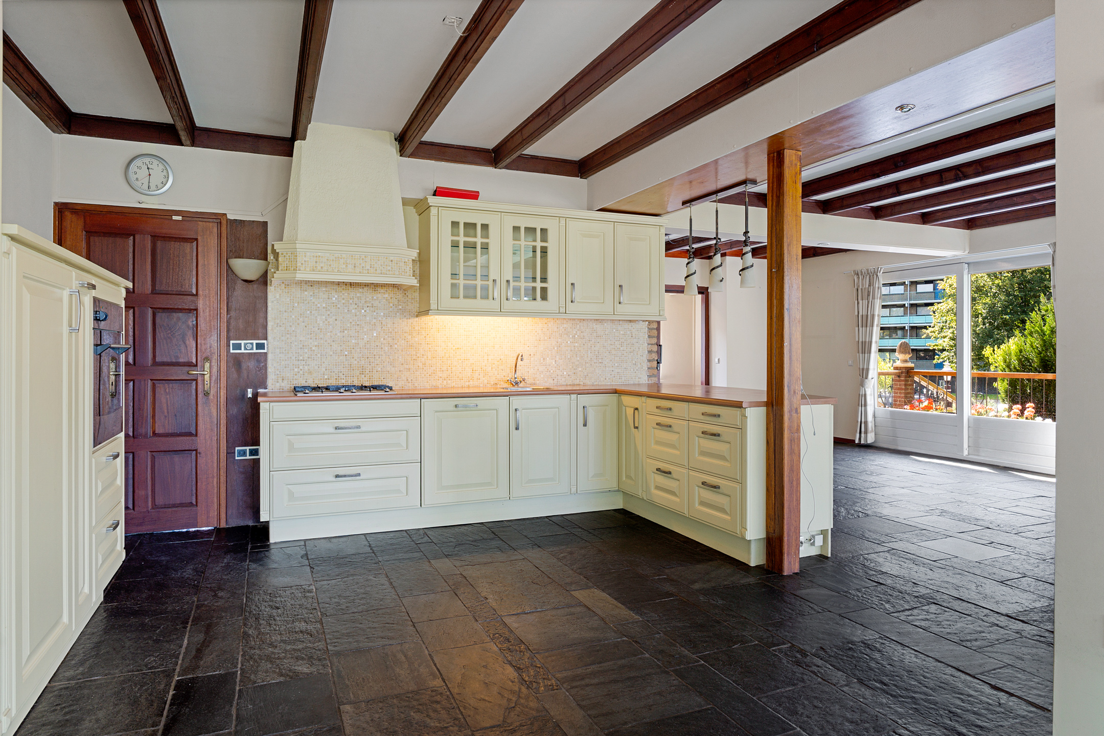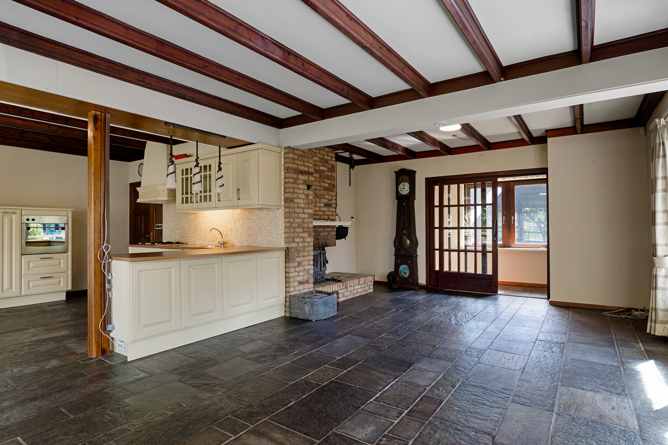 Via een brede trap bereikt u de verhoogde entree van de woning. De hal is langgerekt en functioneert als centrale as; direct rechts bevindt zich de zeer ruime woonkamer met open keuken. Deze leefruimte is opvallend licht dankzij de vele raampartijen aan drie zijden. Het hoge plafond met authentieke houten balken en een sfeervolle haard zorgen voor een warme uitstraling.