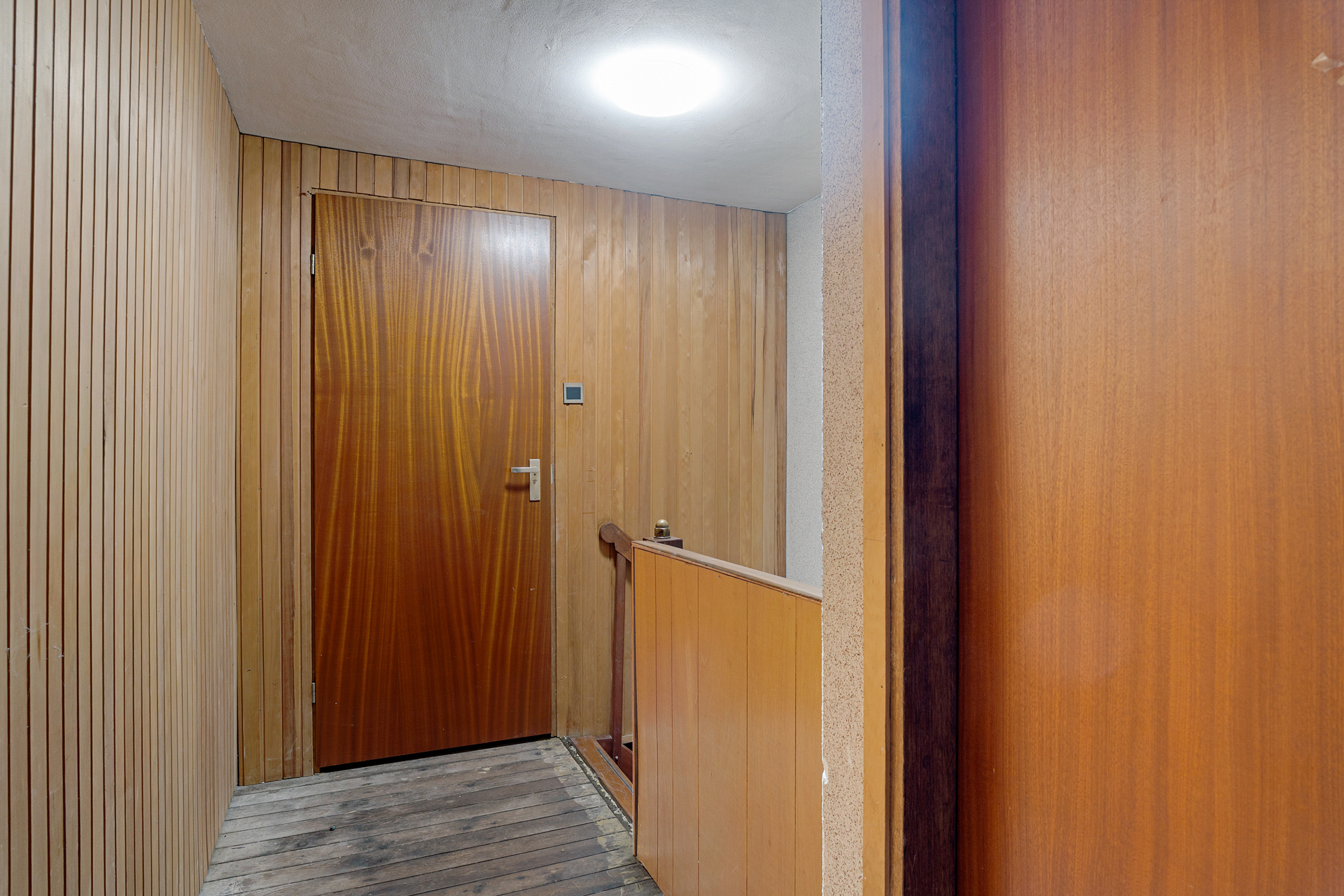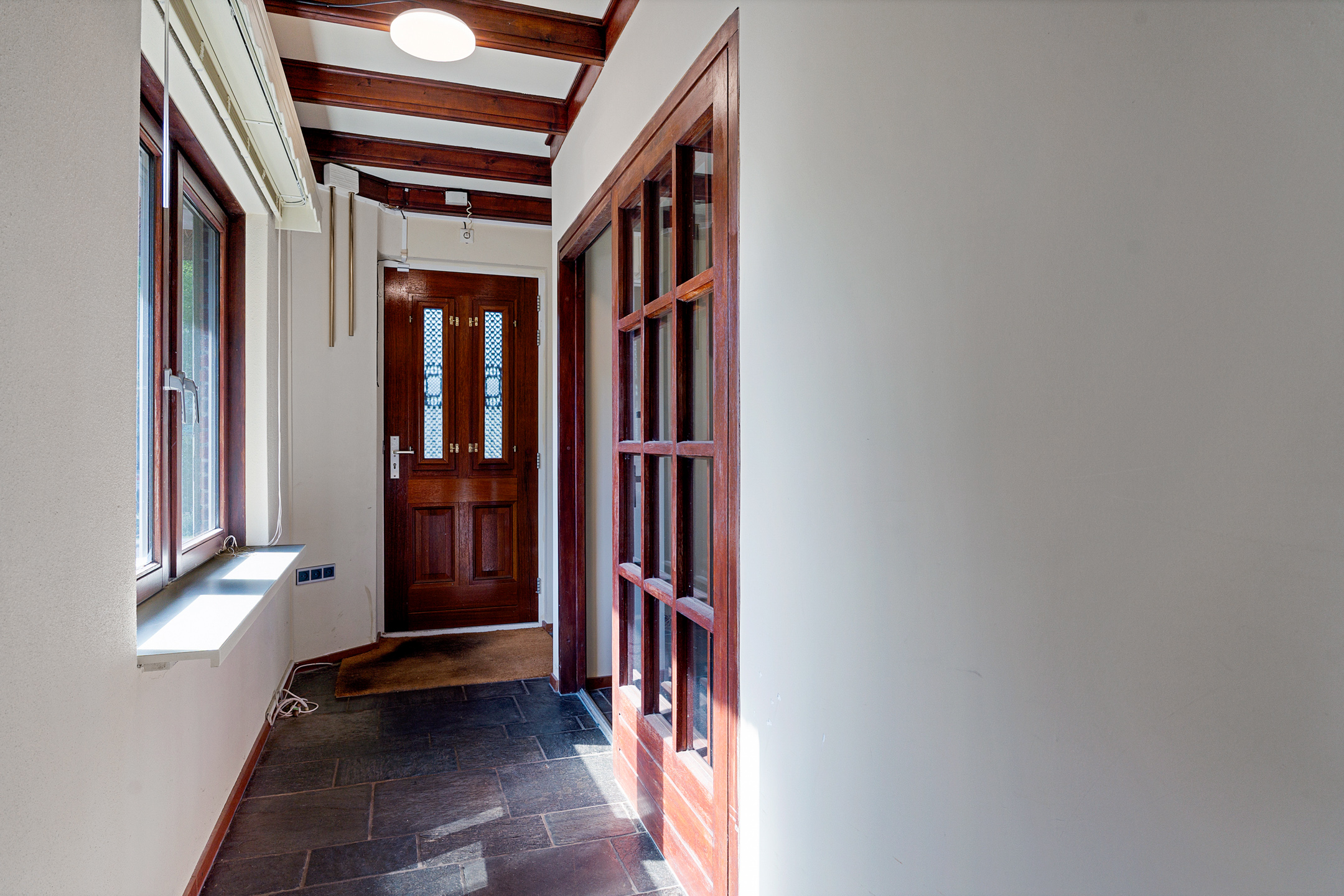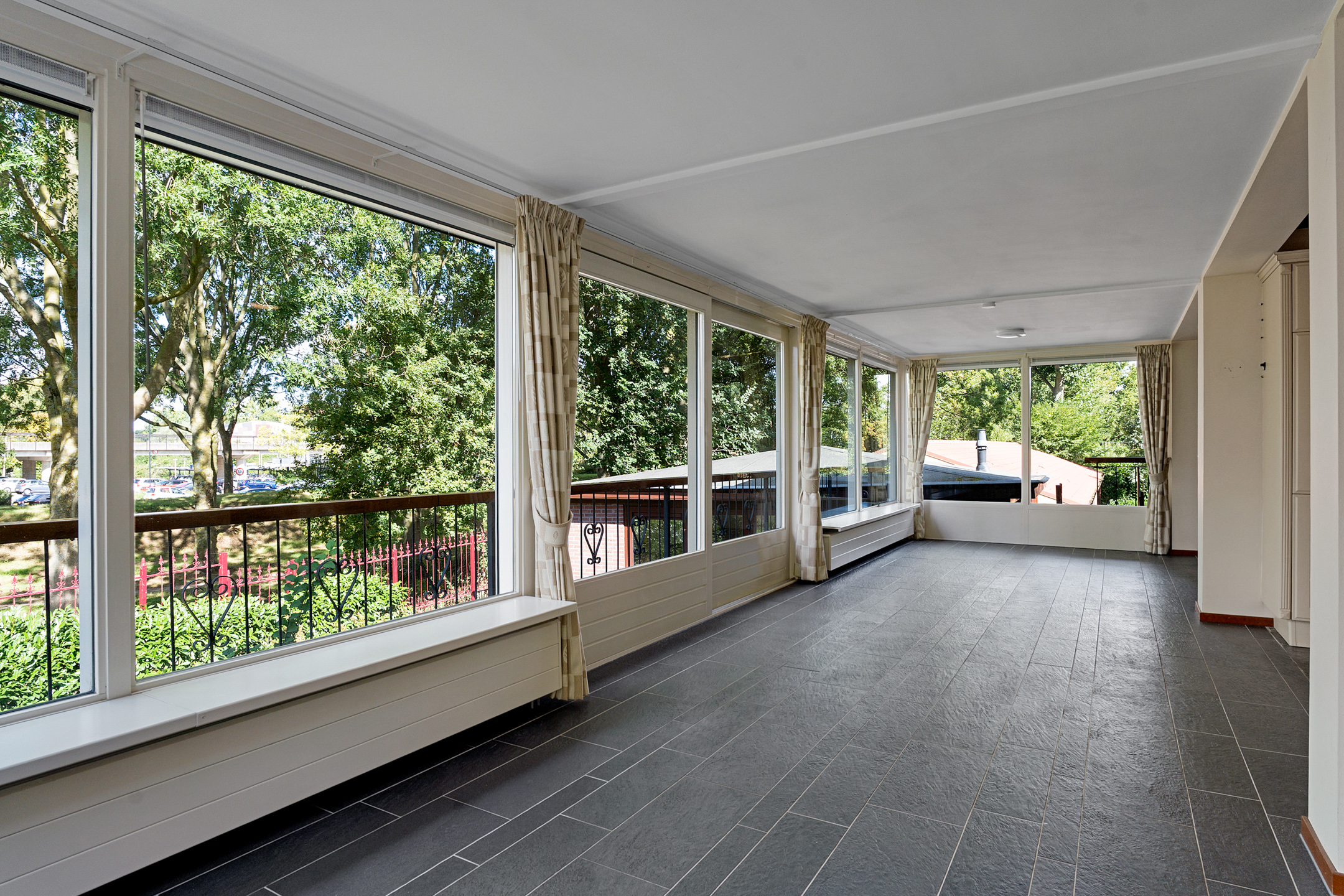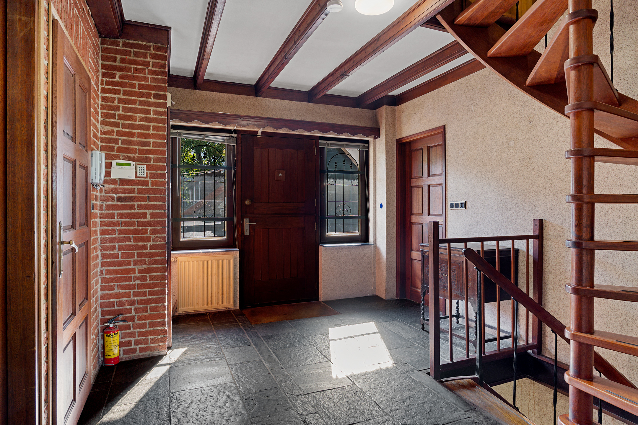 Via een brede trap bereikt u de verhoogde entree van de woning. De hal is langgerekt en functioneert als centrale as; direct rechts bevindt zich de zeer ruime woonkamer met open keuken. Deze leefruimte is opvallend licht dankzij de vele raampartijen aan drie zijden. Het hoge plafond met authentieke houten balken en een sfeervolle haard zorgen voor een warme uitstraling.
