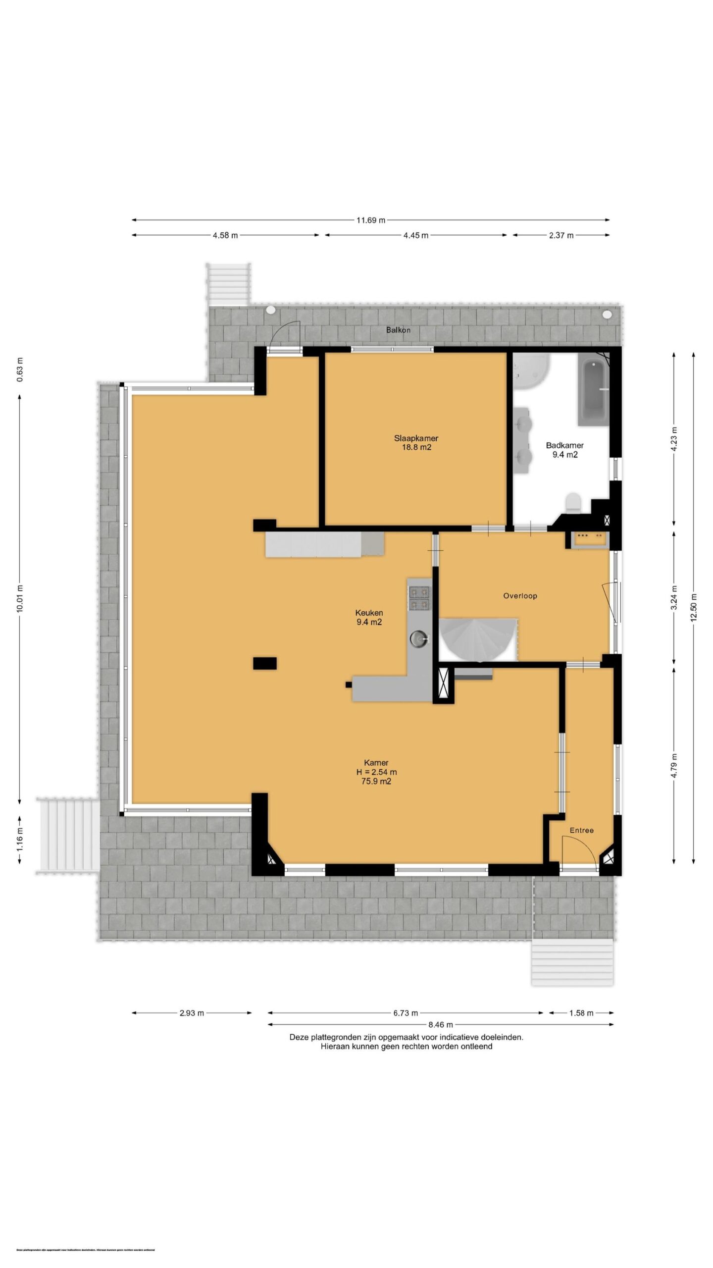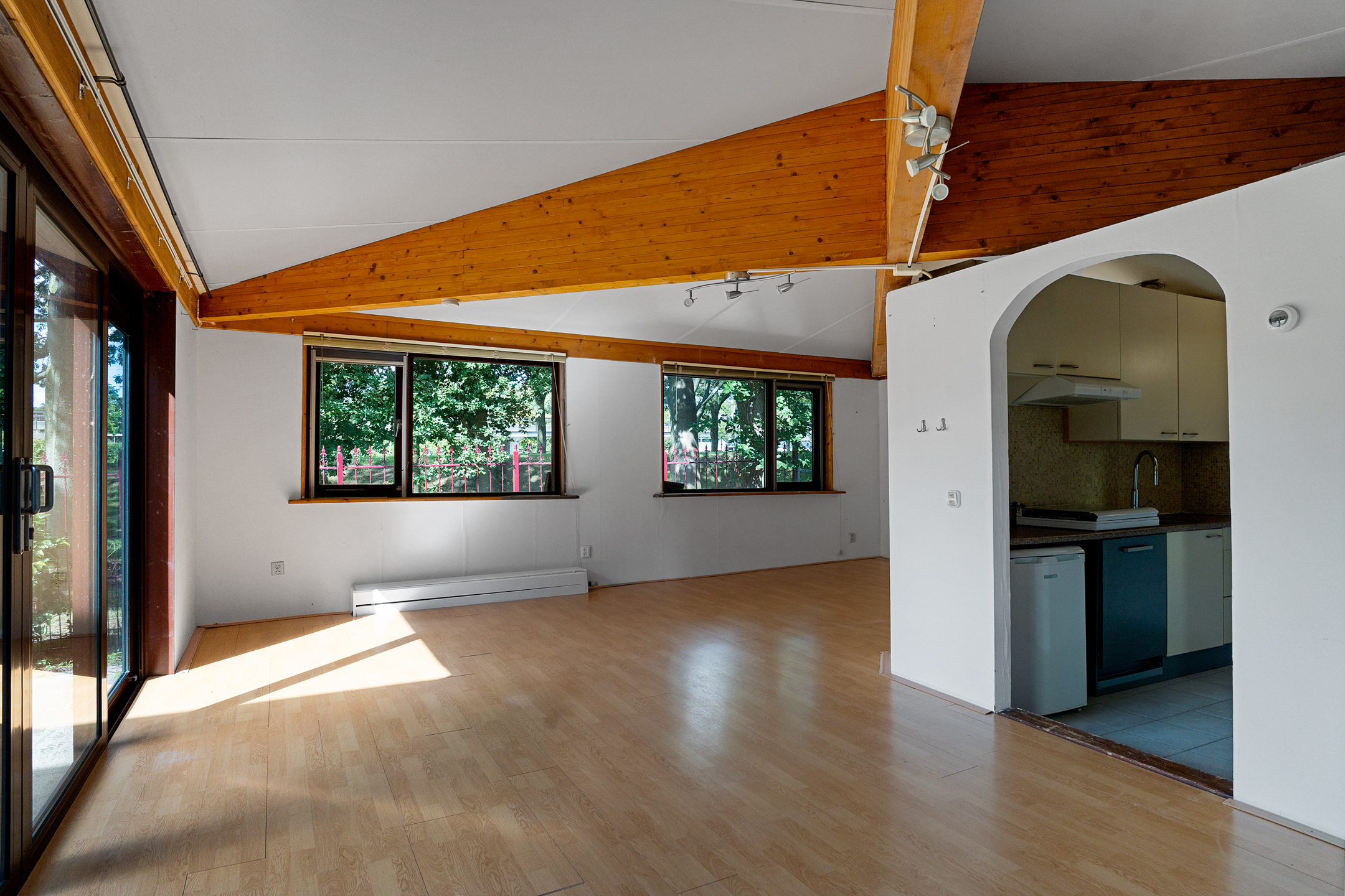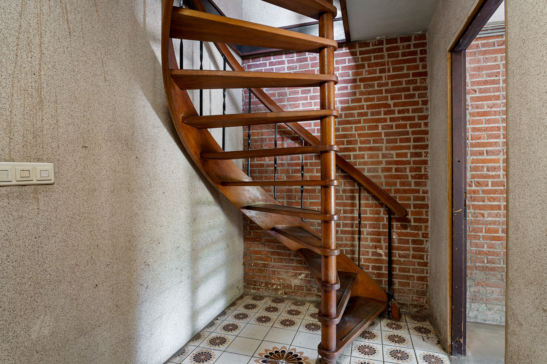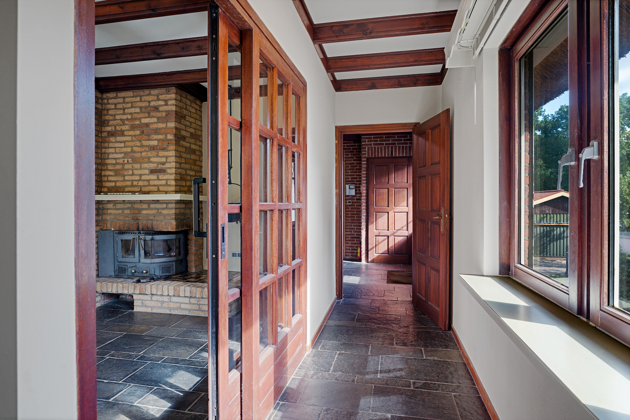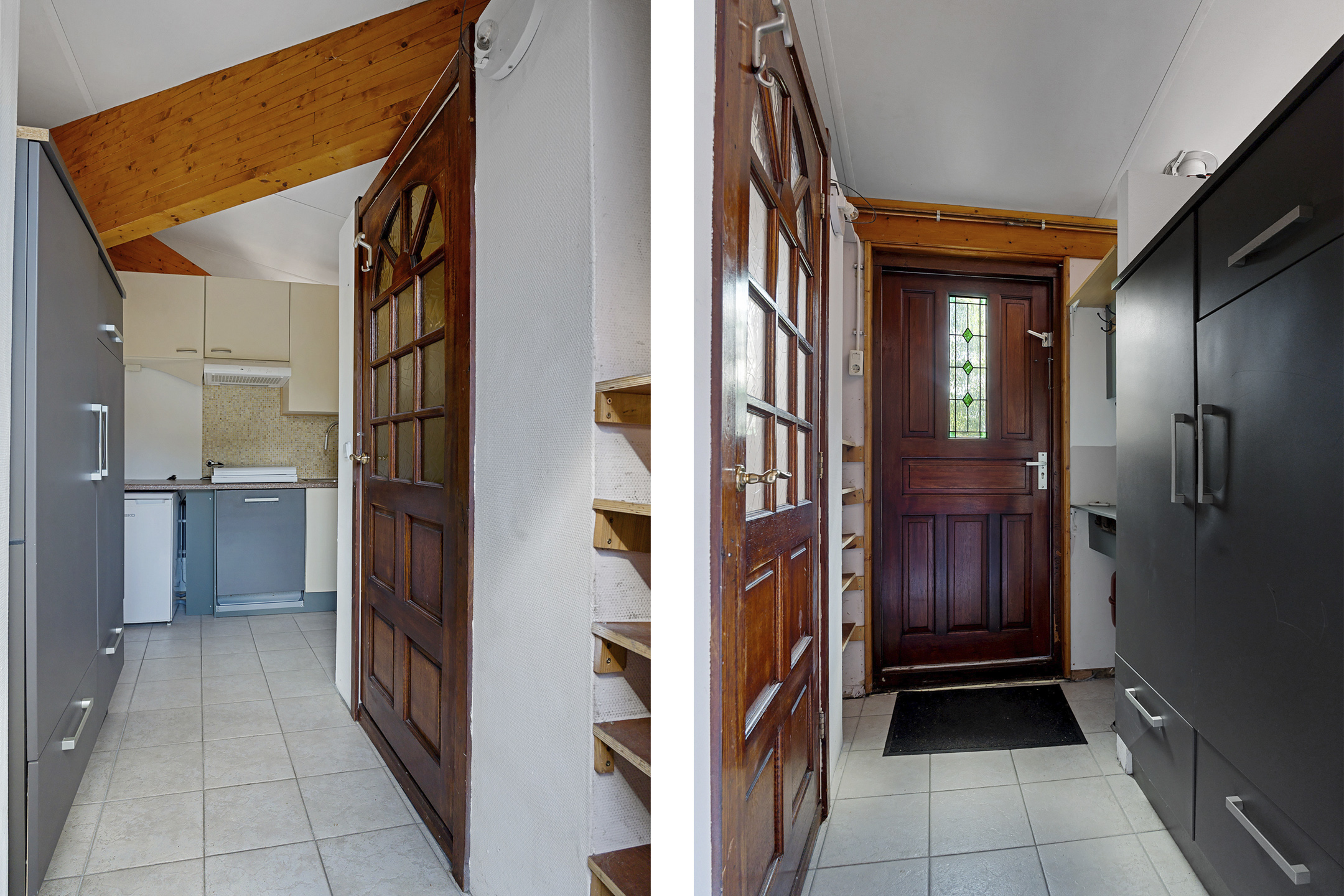 Via een brede trap bereikt u de verhoogde entree van de woning. De hal is langgerekt en functioneert als centrale as; direct rechts bevindt zich de zeer ruime woonkamer met open keuken. Deze leefruimte is opvallend licht dankzij de vele raampartijen aan drie zijden. Het hoge plafond met authentieke houten balken en een sfeervolle haard zorgen voor een warme uitstraling.