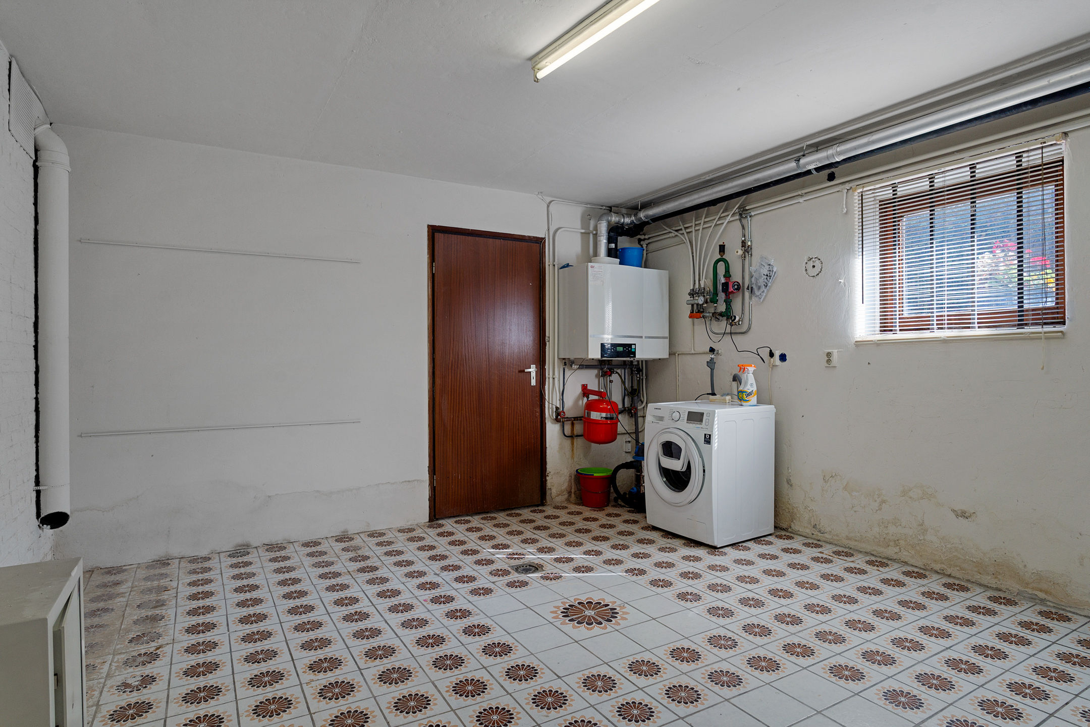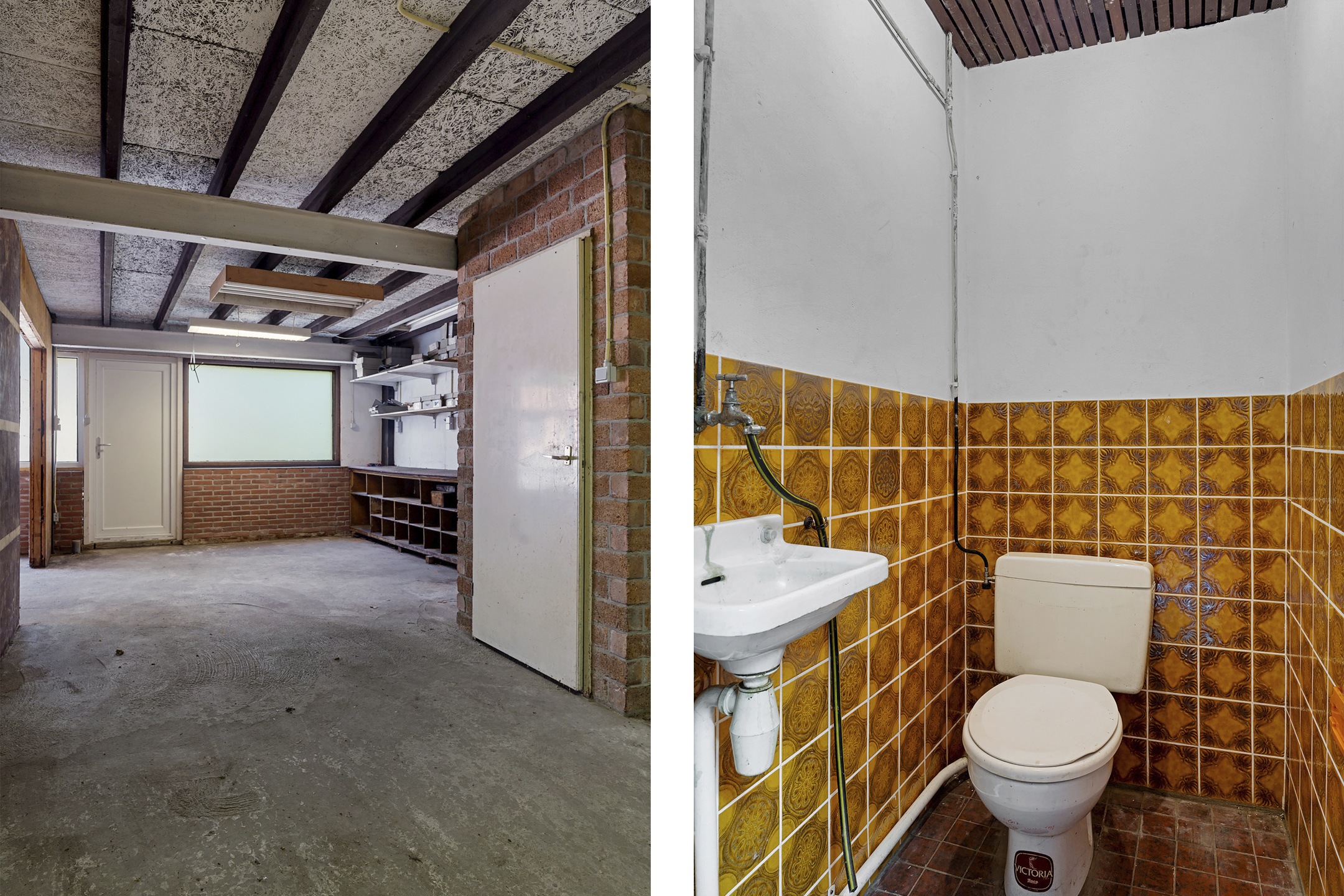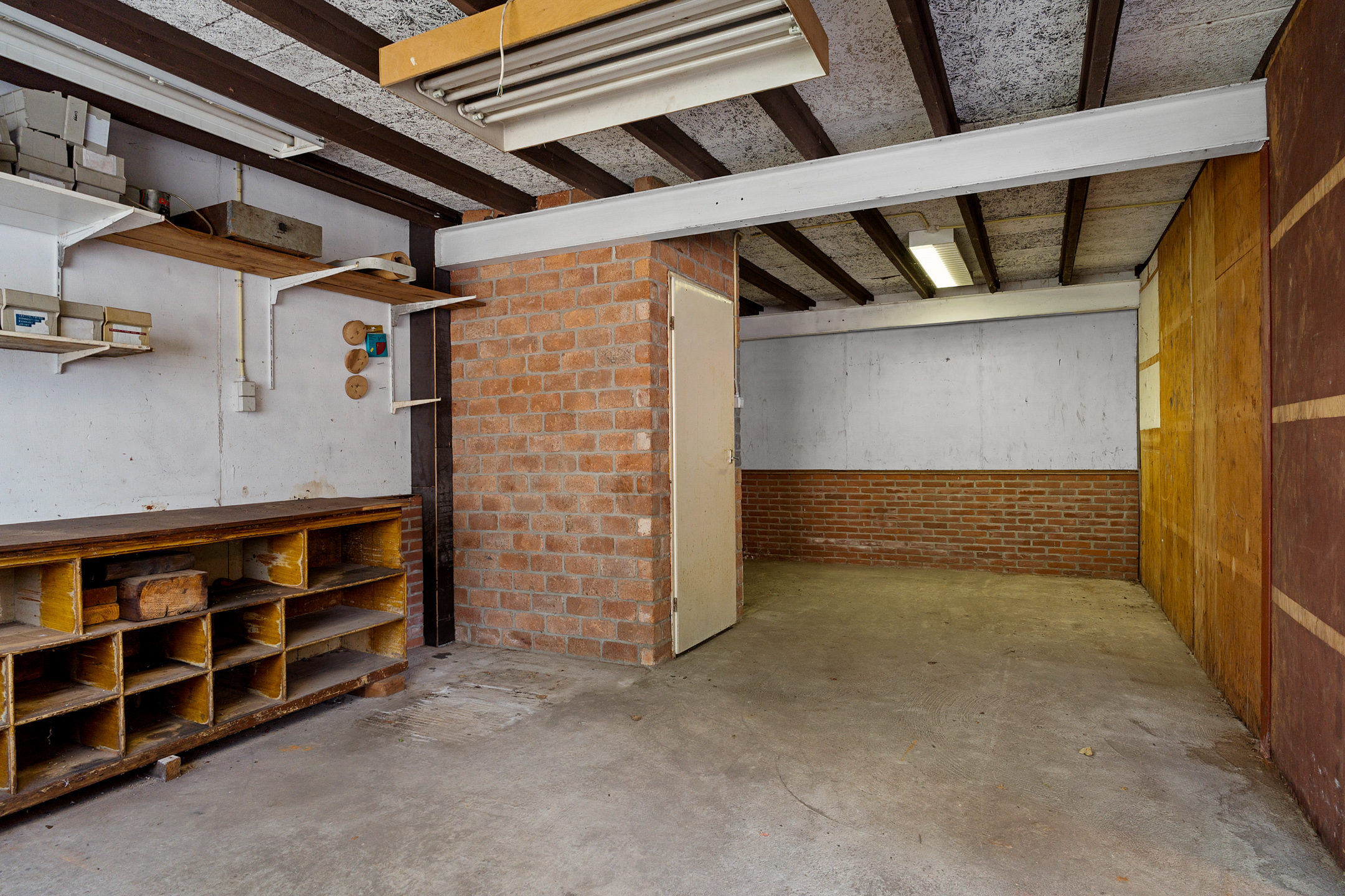 Via de trap op de eerste verdieping bereik je de begane grond dat in gebruik is als multifunctionele benedenverdieping. Hier bevinden zich twee grote ruimtes die momenteel als garage dienen, een derde ruimte in gebruik als berging, met aansluitingen voor wasmachine en droger en een extra toilet.