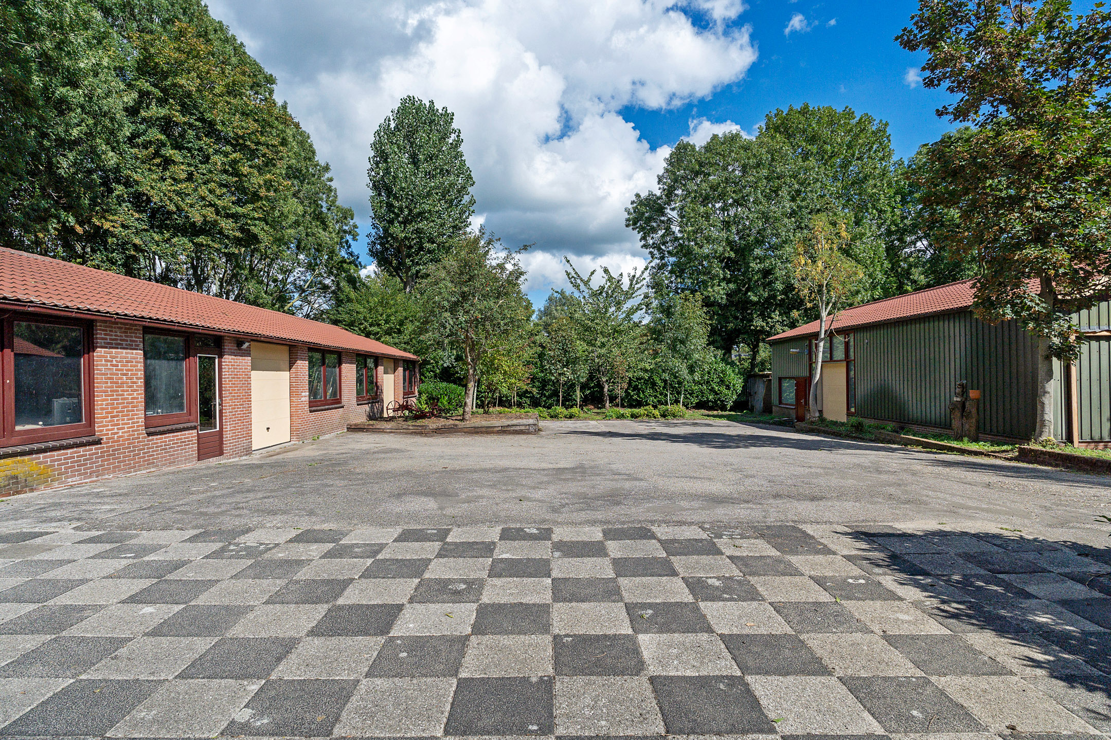 De binnenplaats tussen de woning en de bijgebouwen is volledig verhard en biedt parkeergelegenheid voor minimaal vier auto's op eigen terrein, met volop manoeuvreerruimte.
