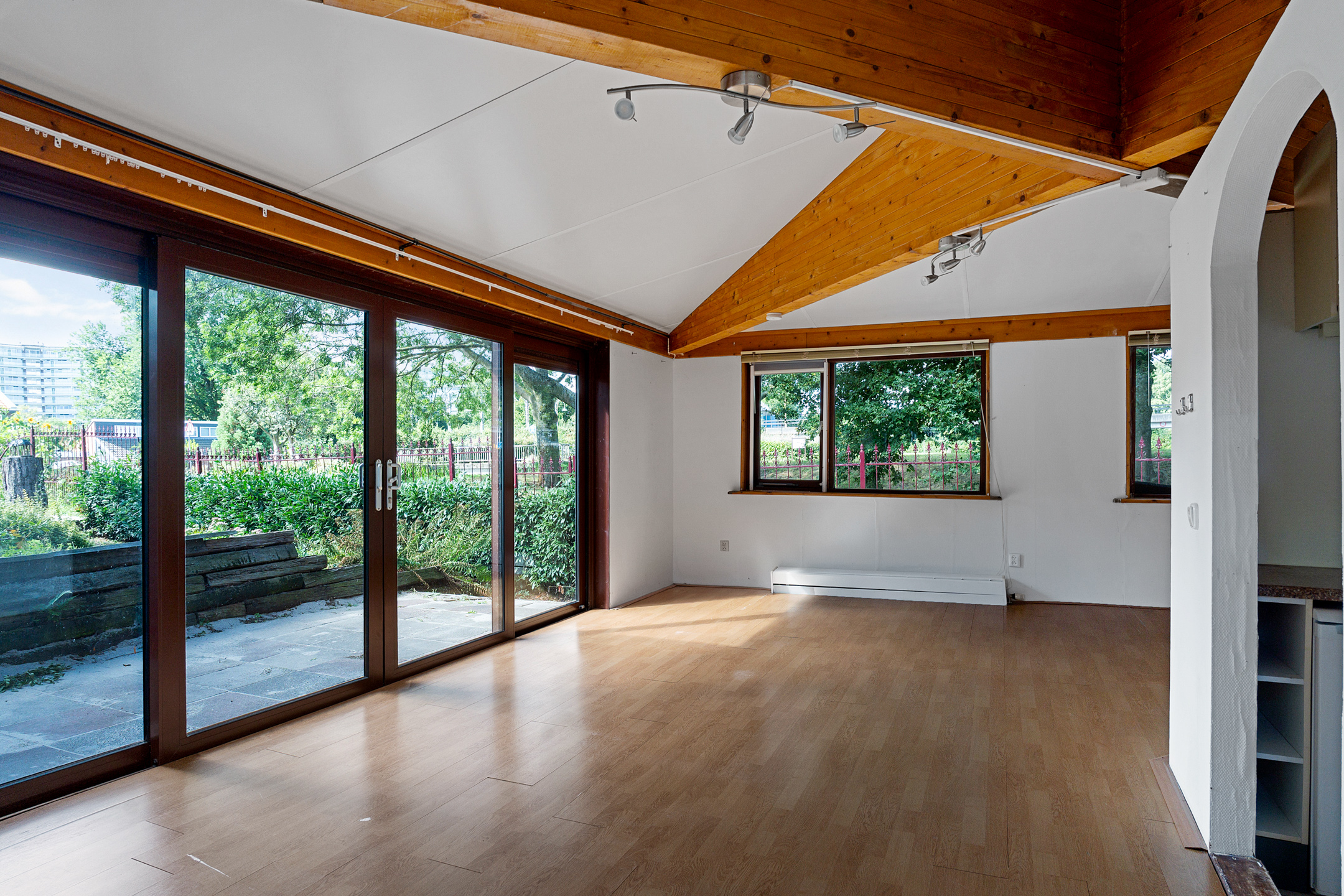 De keuken is centraal in de ruimte geplaatst en heeft een open verbinding met zowel de eet- als zithoek. Via een schuifpui heeft u toegang tot een ruim balkon, dat uitkijkt op de beschutte tuin aan het water – compleet met vlonderterras, volwassen groen en volop privacy.