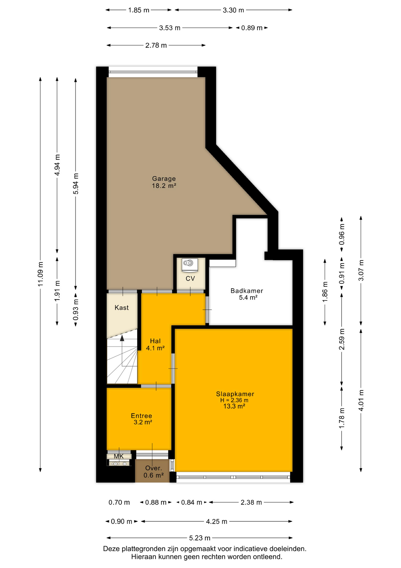 Via de hal en trapopgang bereik je direct alle functionele ruimtes. Aan de voorzijde bevindt zich slaapkamer 1, waardoor slapen op de begane grond moeiteloos mogelijk is. In de vaste kast naast de trap bevindt zich de stookruimte met Cv-installatie. Aan de achterzijde vind je de interne doorgang naar de ruime inpandige garage, voorzien van elektra, verwarming en water – een uitzonderlijke plus voor wie extra werkruimte zoekt.