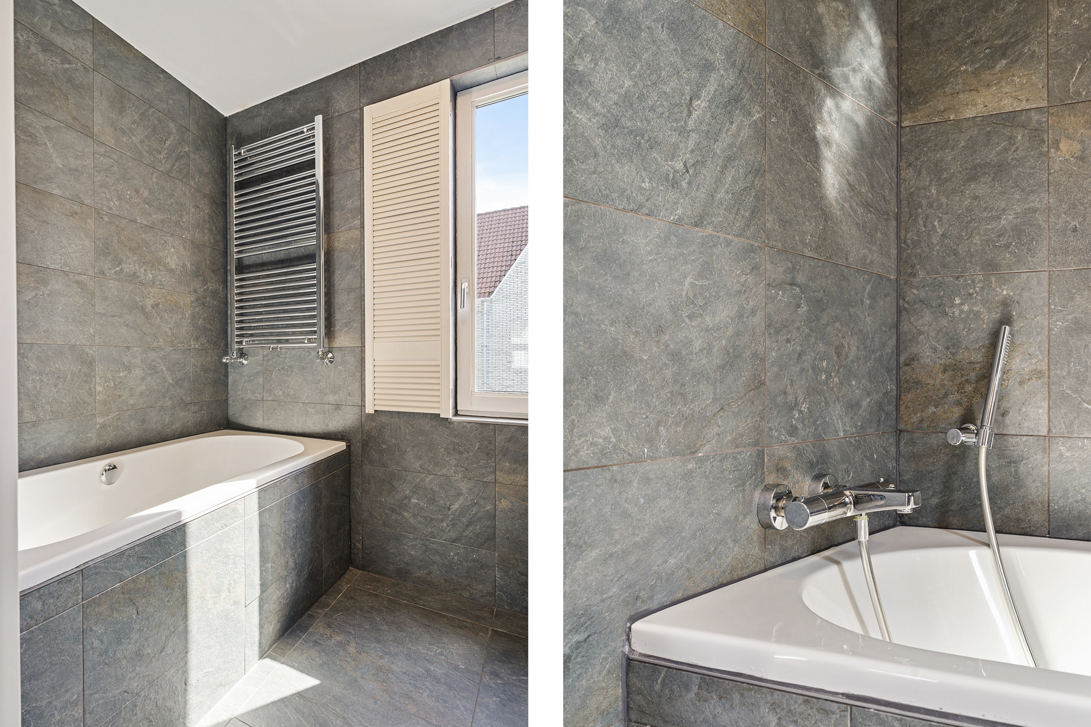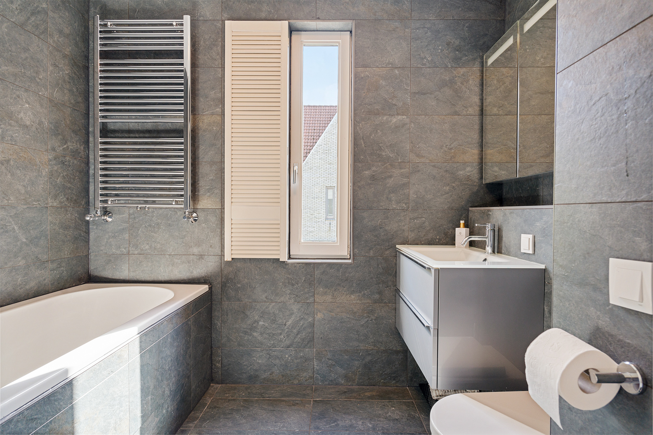Op de eerste verdieping vind je drie goed ingedeelde slaapkamers en een moderne badkamer (2019). Deze is volledig betegeld met stijlvolle, grote tegels en voorzien van een ligbad, aparte douche, wastafelmeubel en een tweede toilet.
