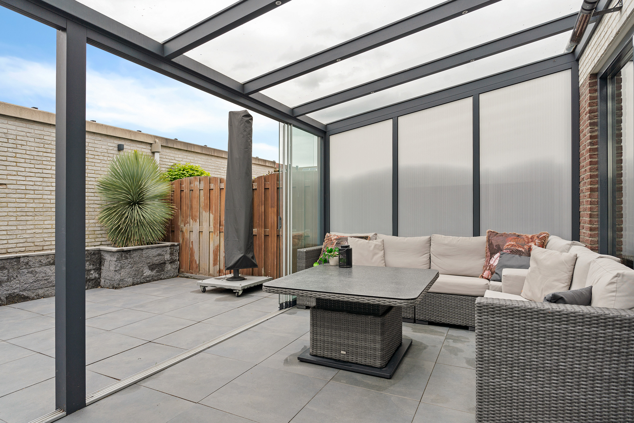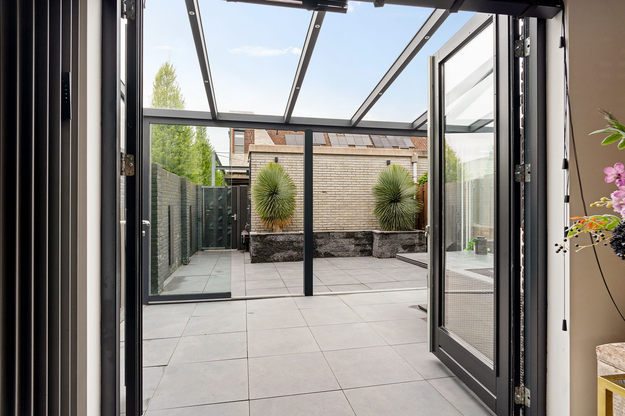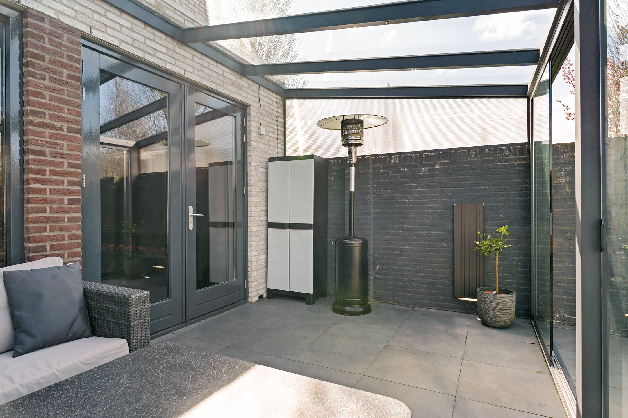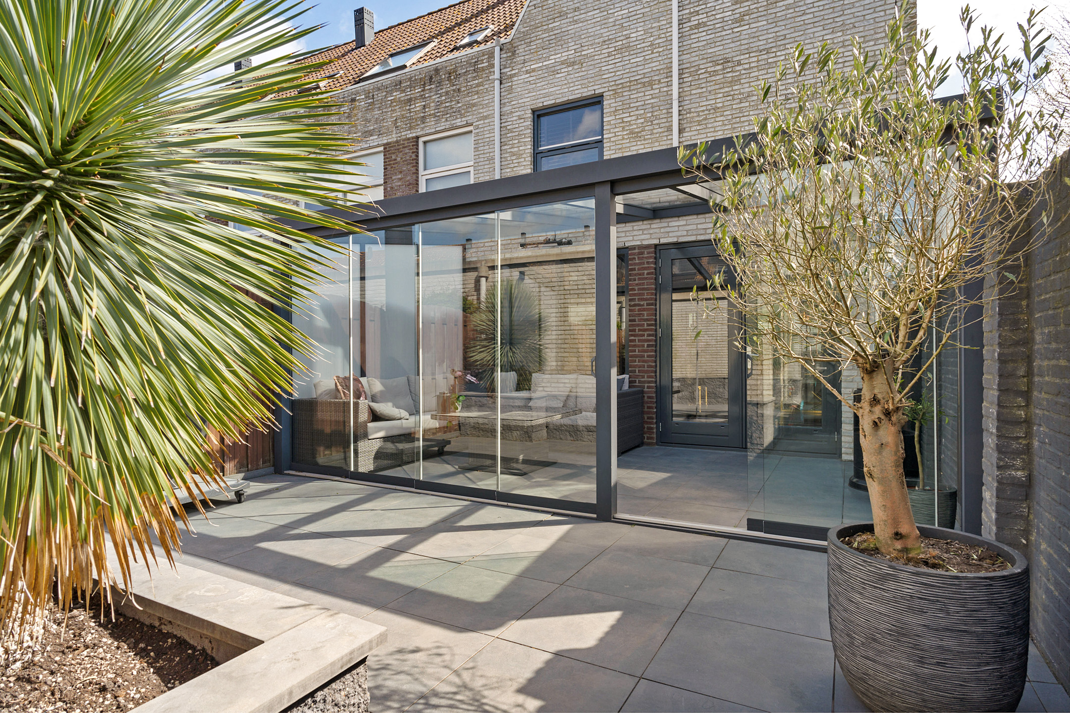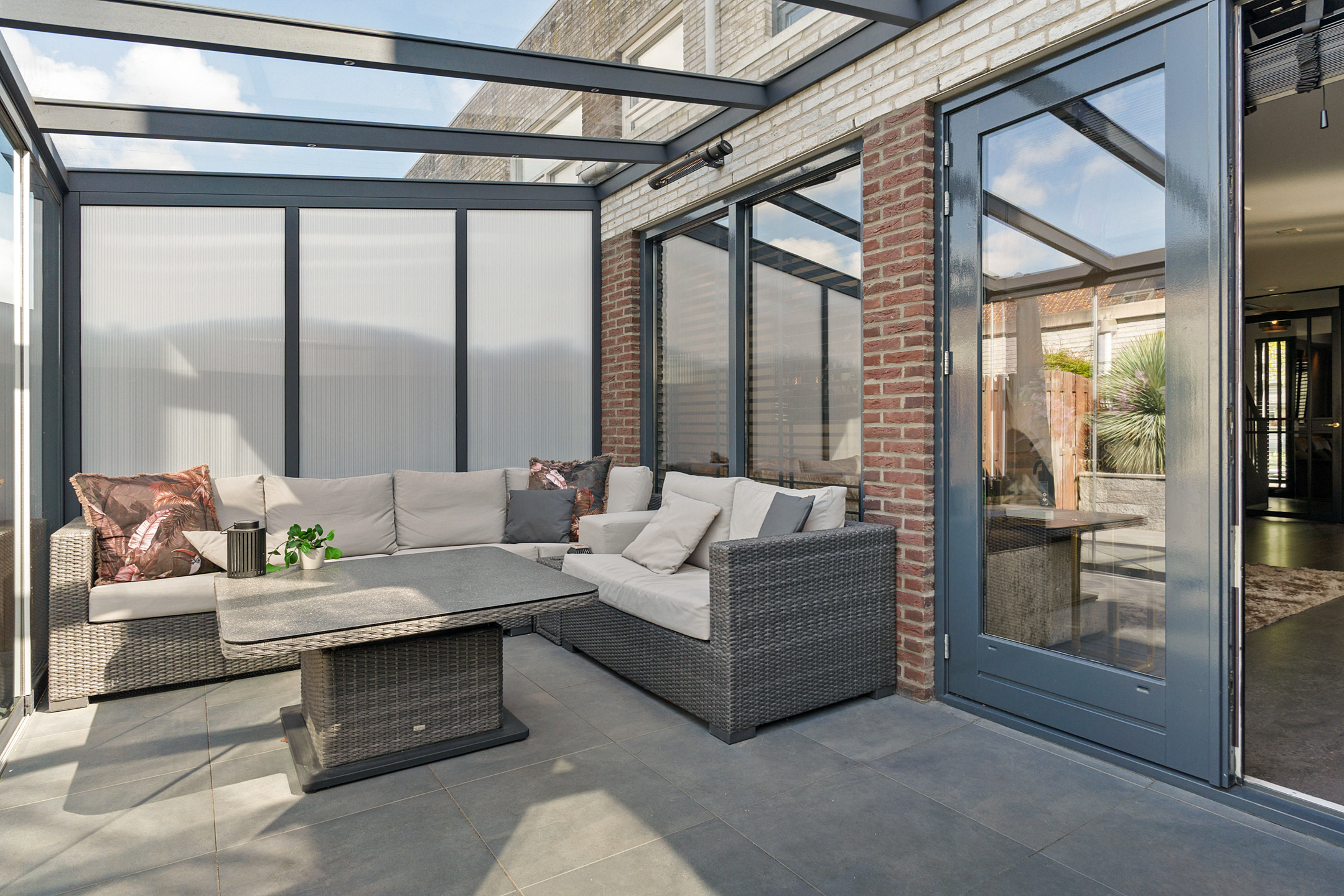 De aangebouwde serre biedt extra leefruimte en zorgt voor een natuurlijke overgang naar buiten.