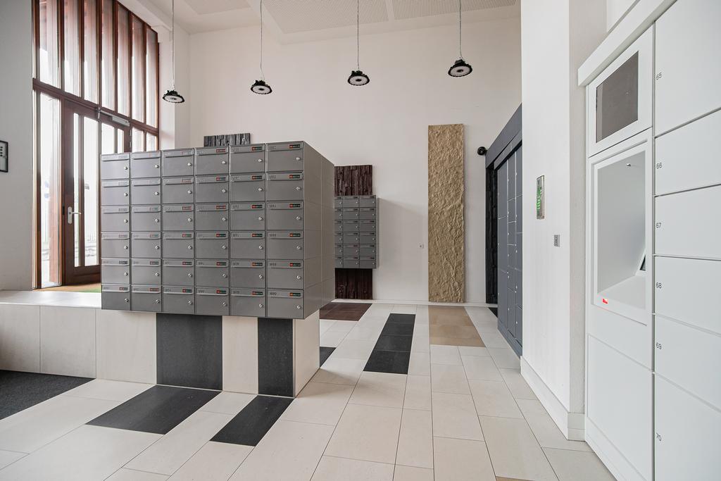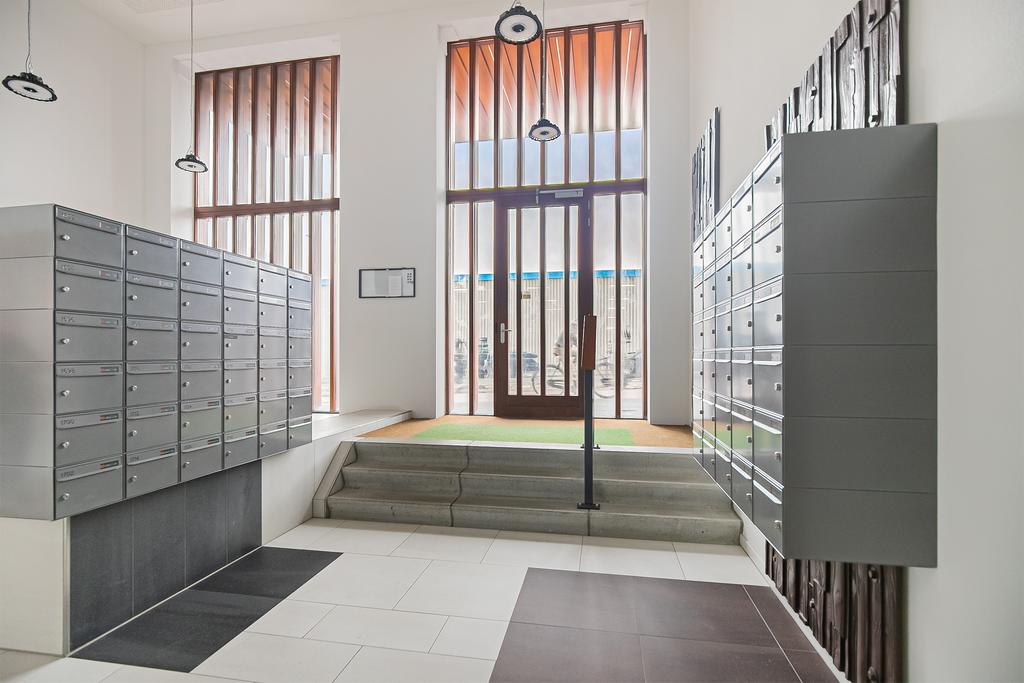 Centrale hal met bellentableau en brievenbussen op straatniveau. Afgesloten hal naar trappenhuis en 2 liften naar 11e etage.
