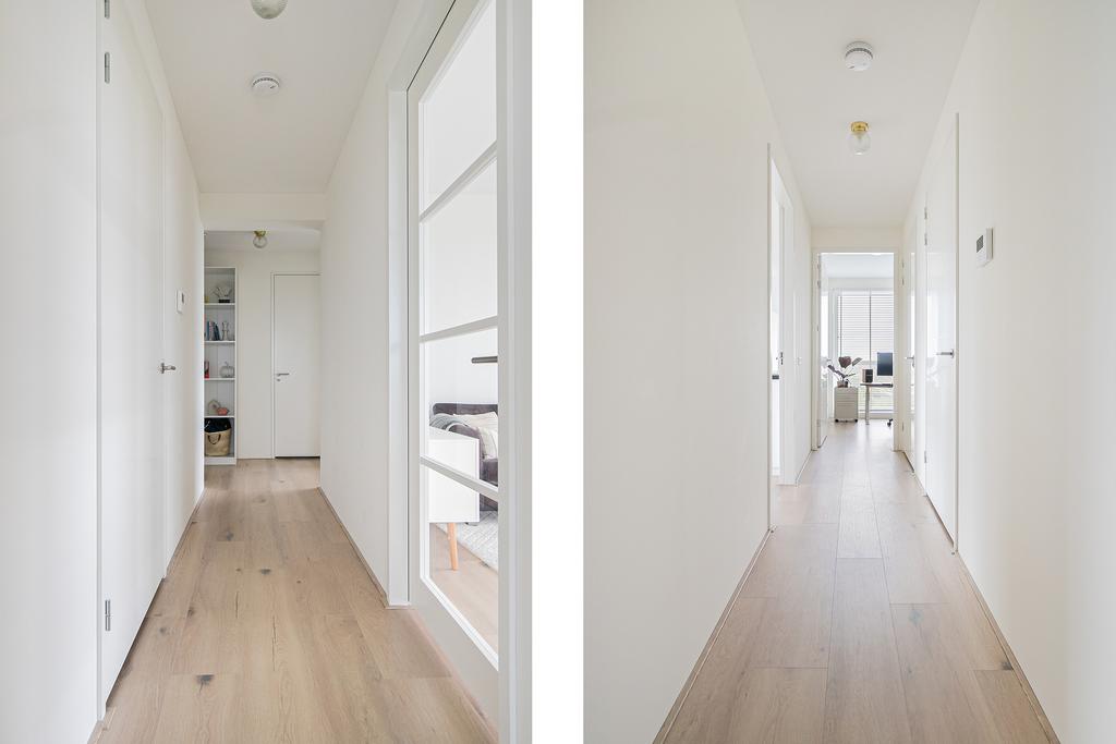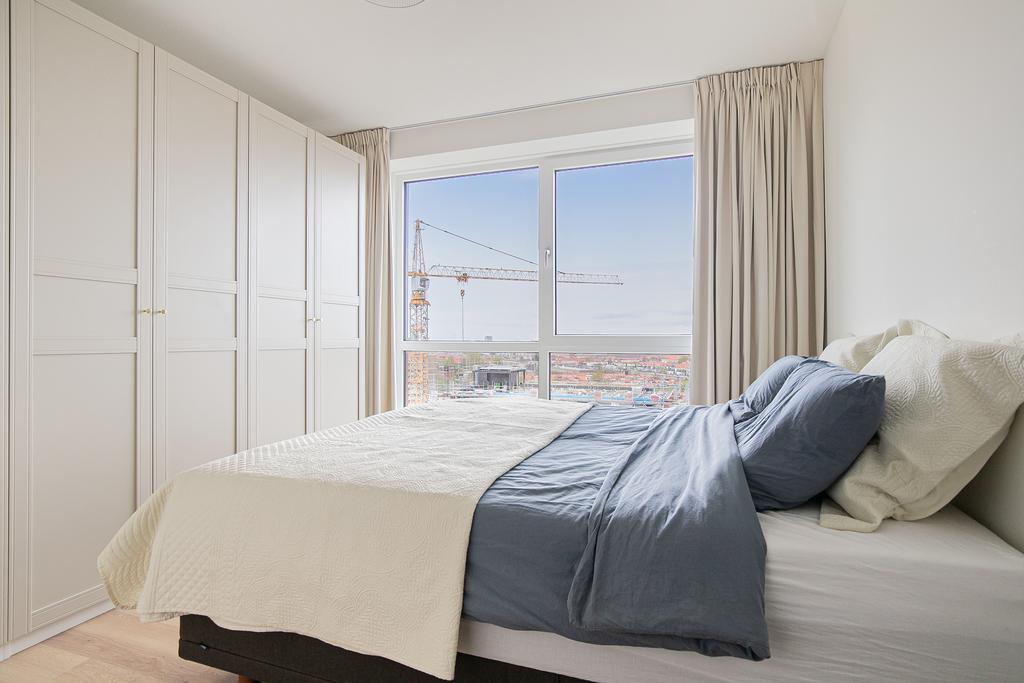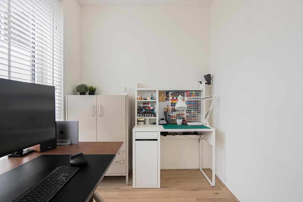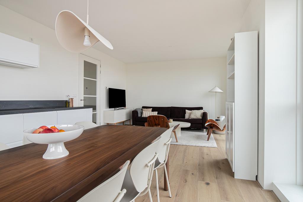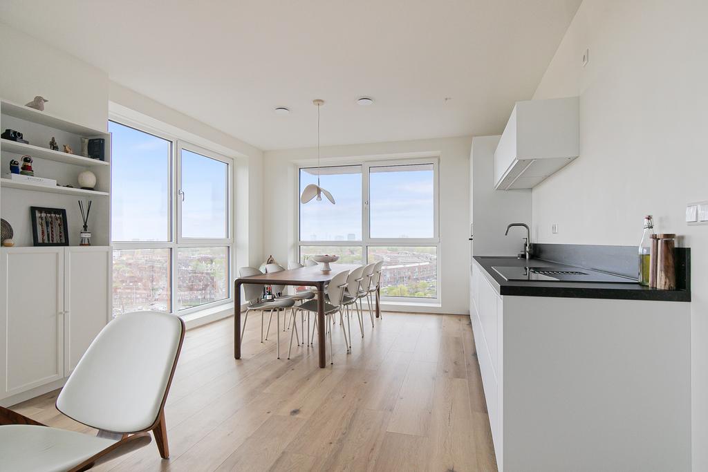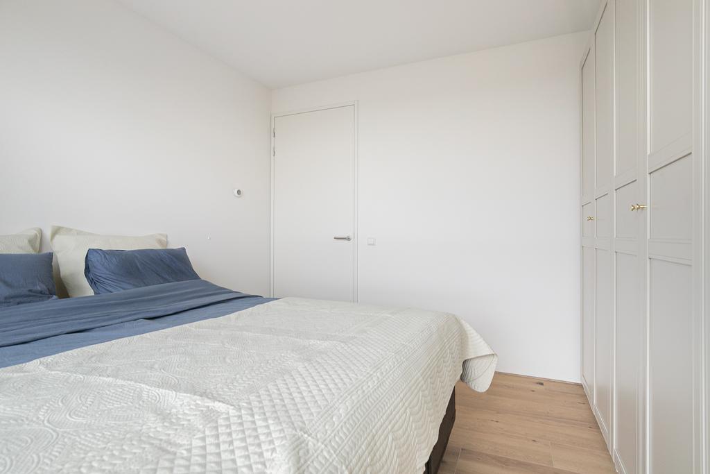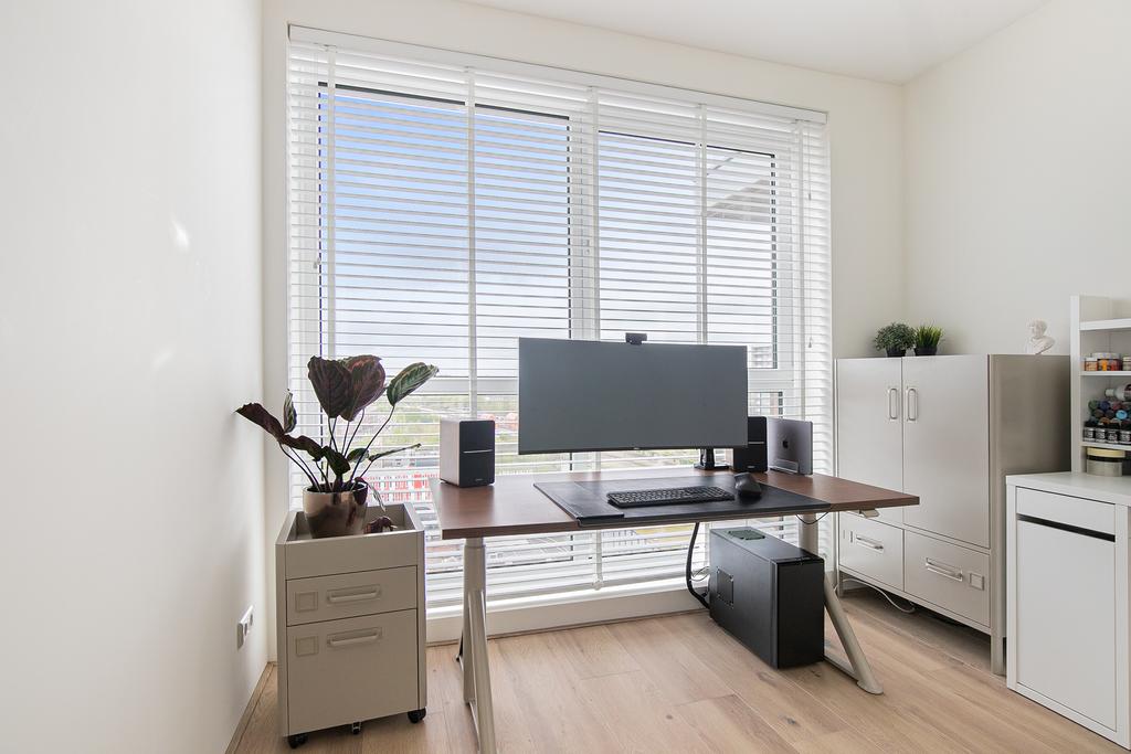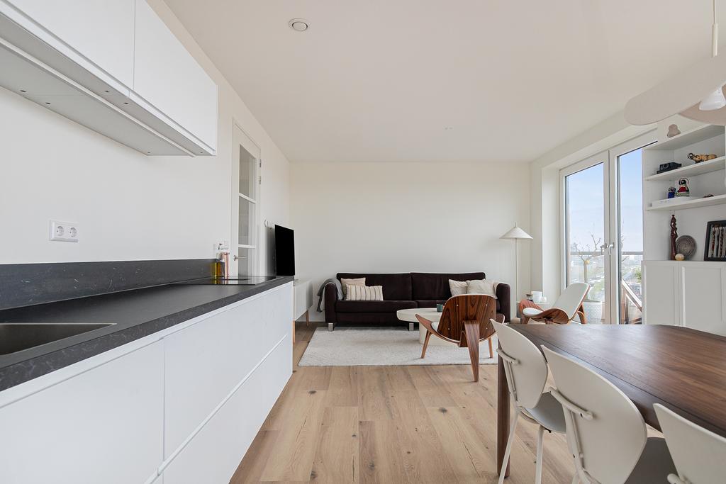De luxe open keuken heeft een moderne afwerking en is voorzien van een inductiekookplaat met een ingebouwde afzuiginstallatie, een oven en een vaatwasser. Aan de achterzijde van het appartement bevindt zich slaapkamer 2, welke op dit moment ingericht is als werkkamer.
