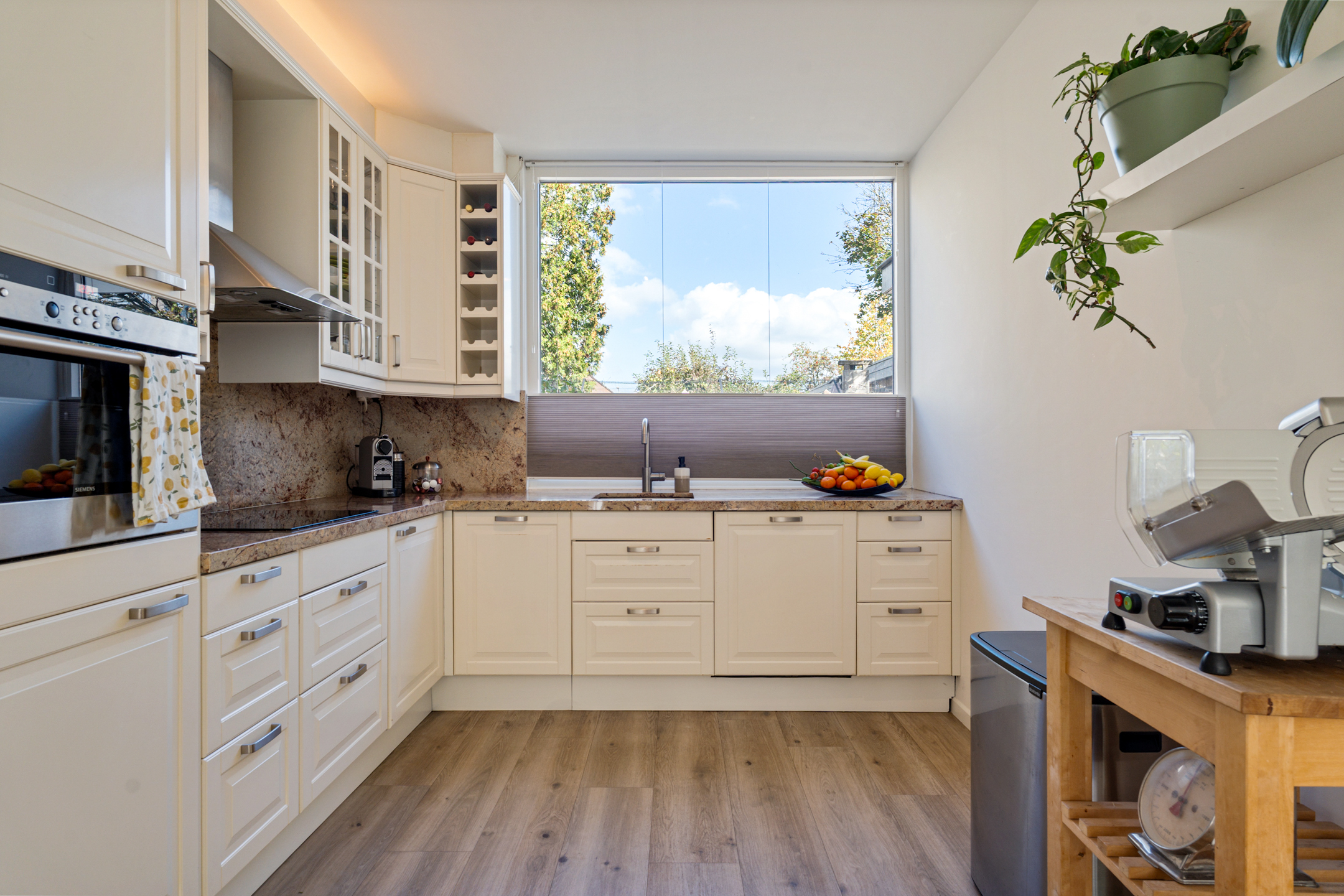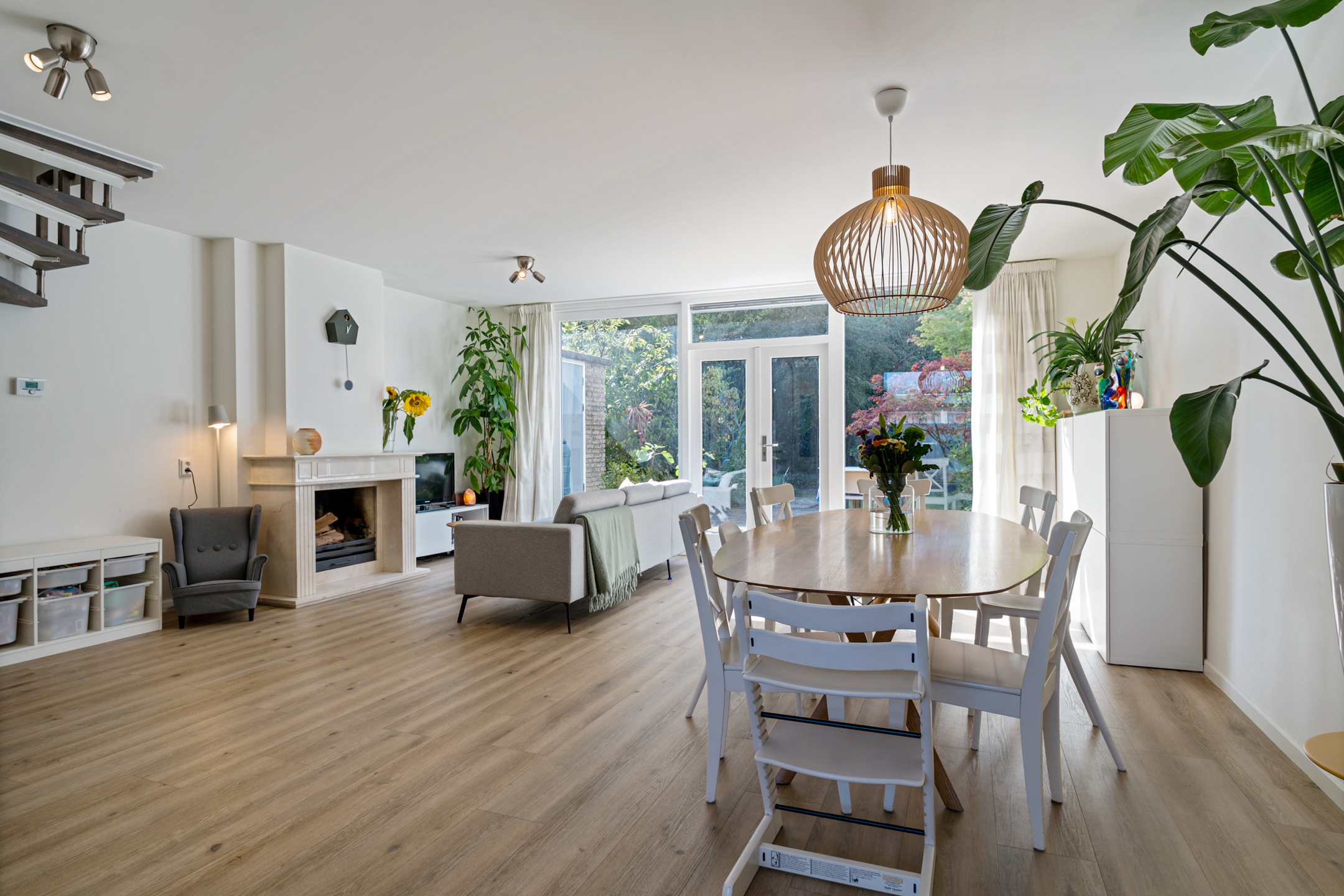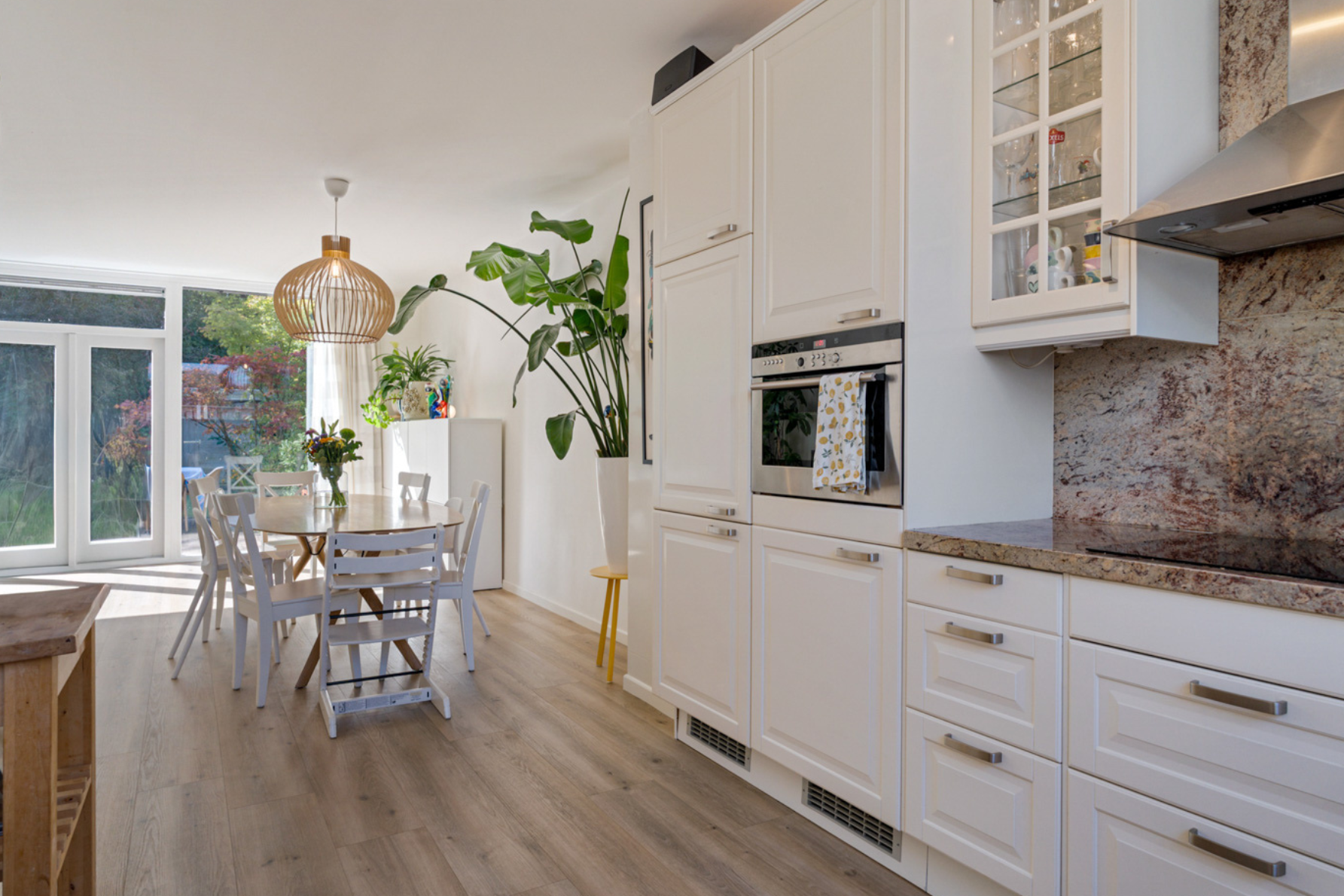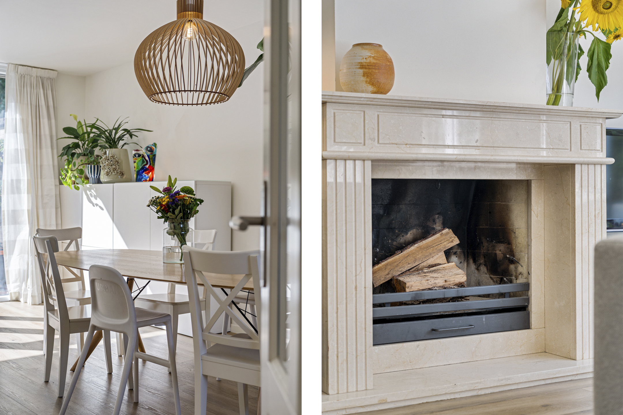 De royale woonkamer straalt warmte en stijl uit, met een sfeervolle haard, een open indeling en grote raampartijen aan de tuinzijde. Aan de voorzijde ligt de moderne keuken, uitgerust met een inductiekookplaat met geïntegreerde afzuiging, oven, vaatwasser, koelkast en een vriezer.