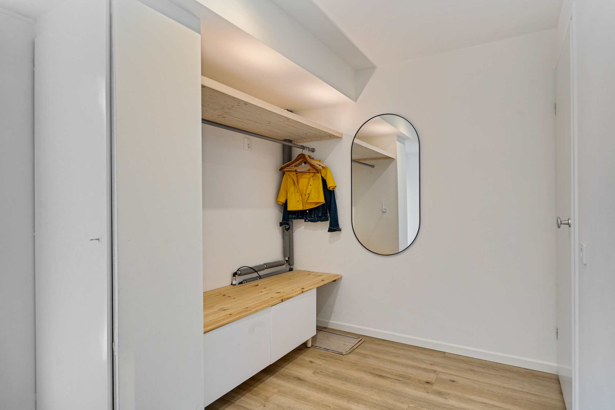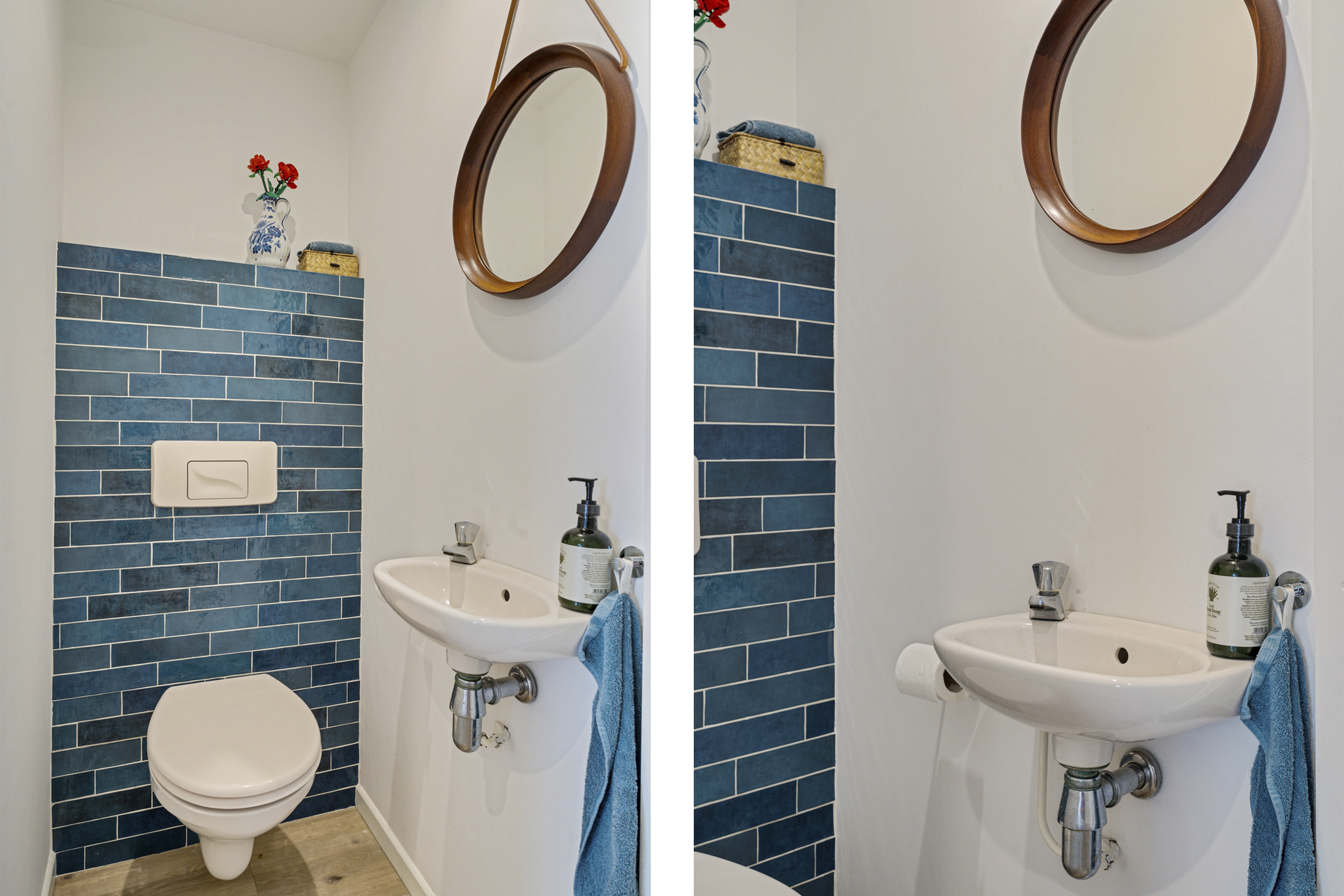 Via de entree kom je binnen in een strak afgewerkte hal met modern toilet, meterkast en garderoberuimte. Het separate toilet is voorzien van een handwasbakje, wandcloset en modern tegelwerk. De begane grond heeft een moderne vloer met vloerverwarming, wat zorgt voor extra comfort.