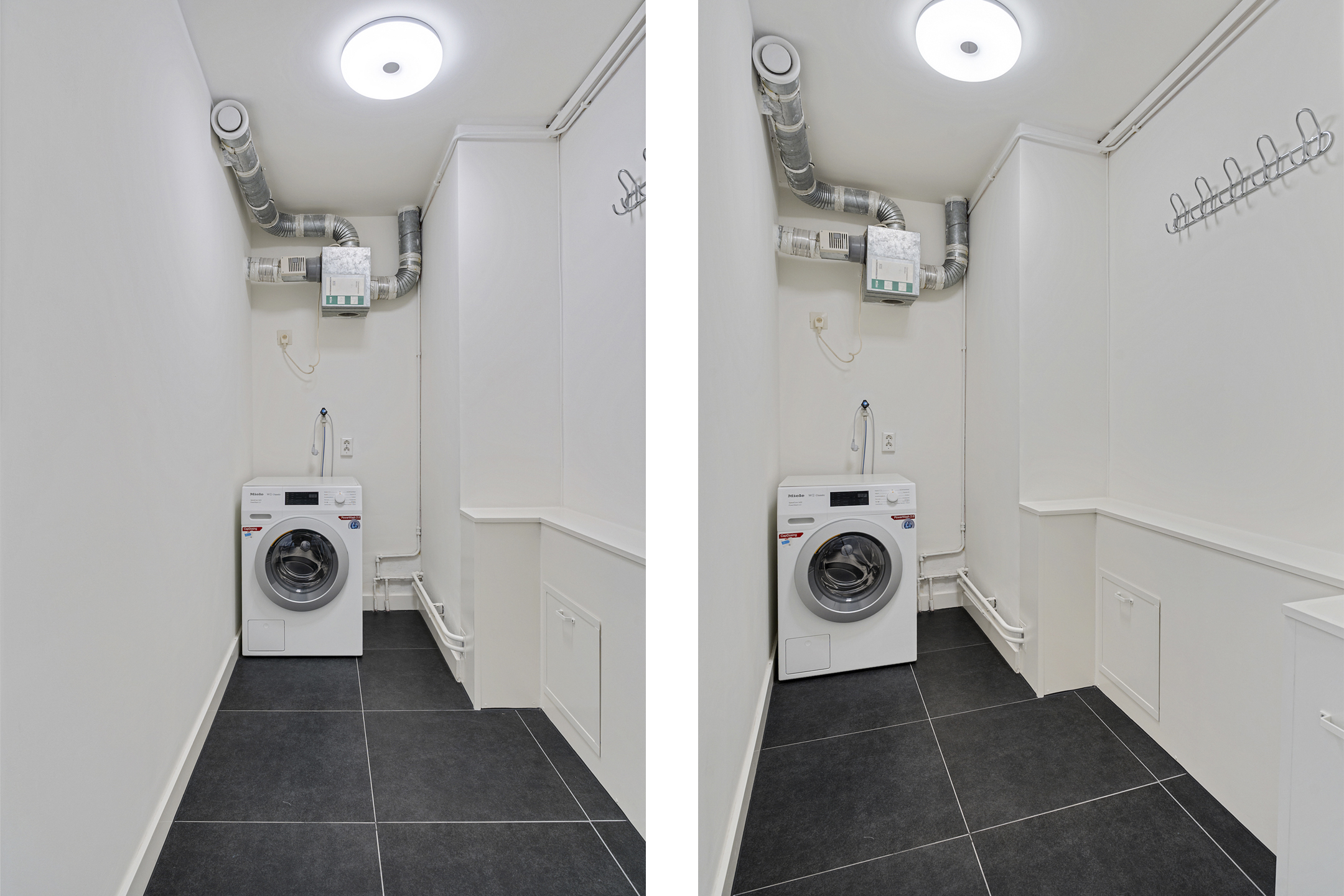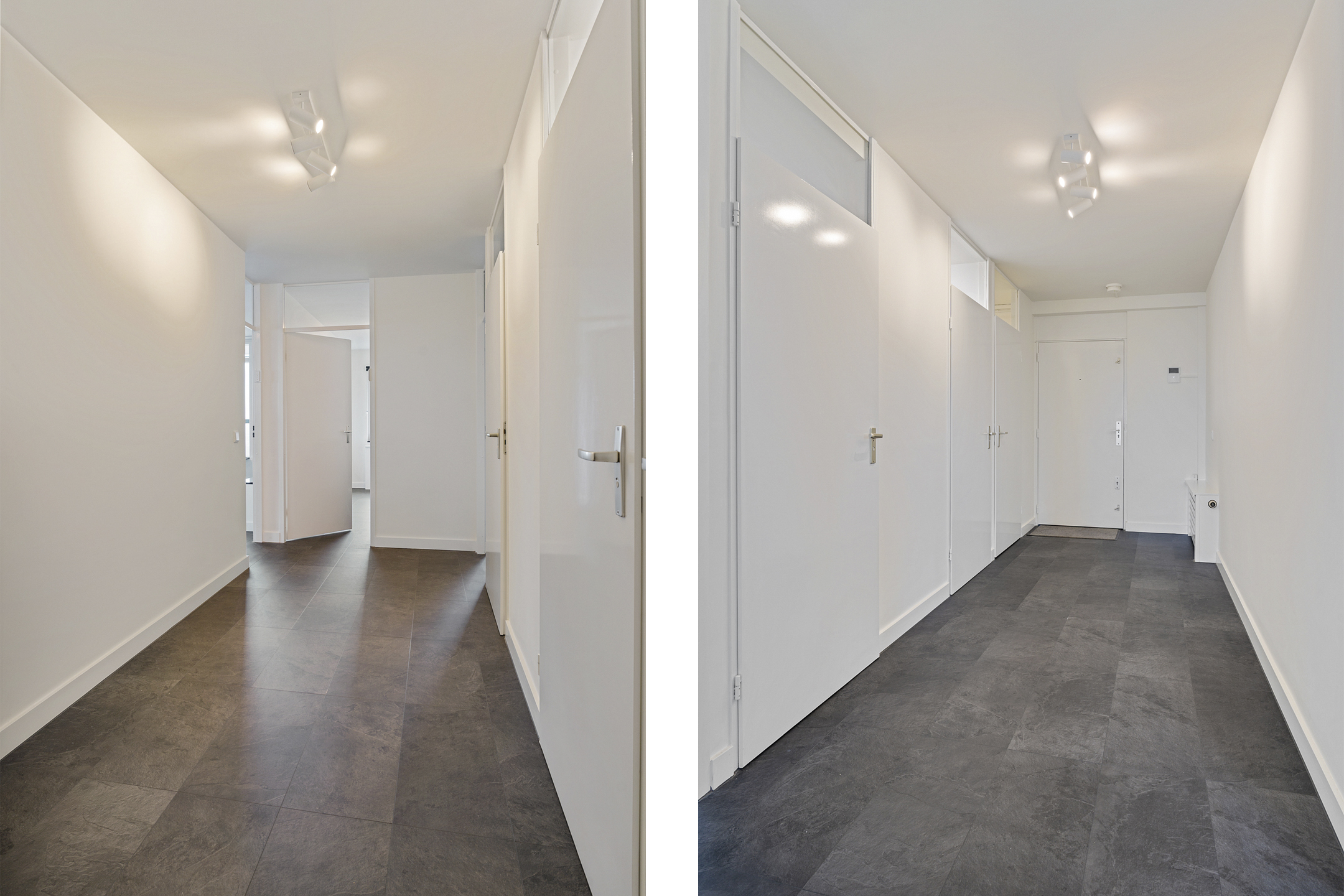 Via de rustige algemene hal bereik je de nette voordeur van het appartement. De ruime hal geeft toegang tot alle vertrekken. Direct aan de rechterzijde bevindt zich de inpandige berging, keurig afgewerkt en voorzien van een tegelvloer, wasmachineaansluiting en de mechanische ventilatie.