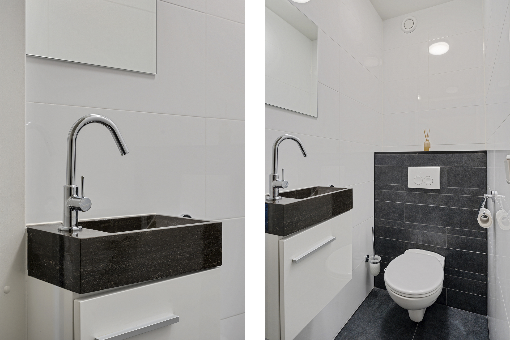 Naast de berging ligt het separate toilet, volledig betegeld en uitgevoerd met een wandcloset en een handwasbakje met meubel.