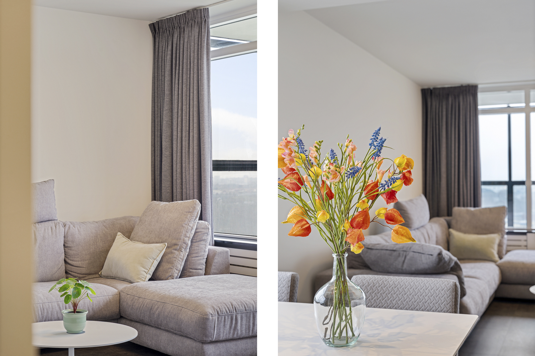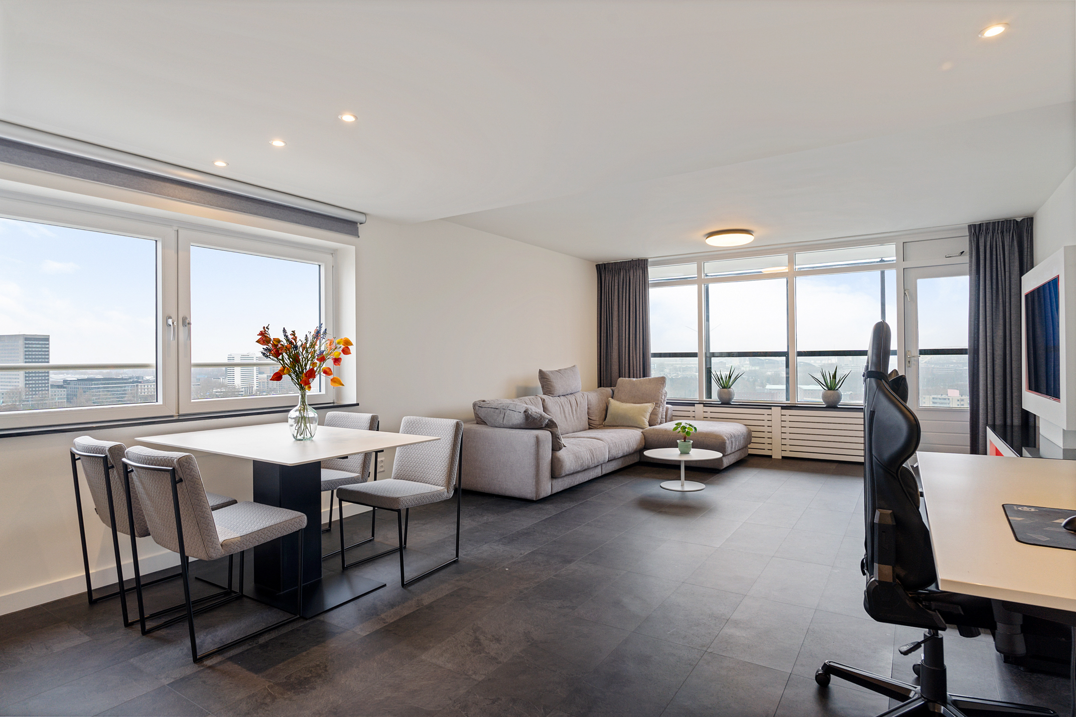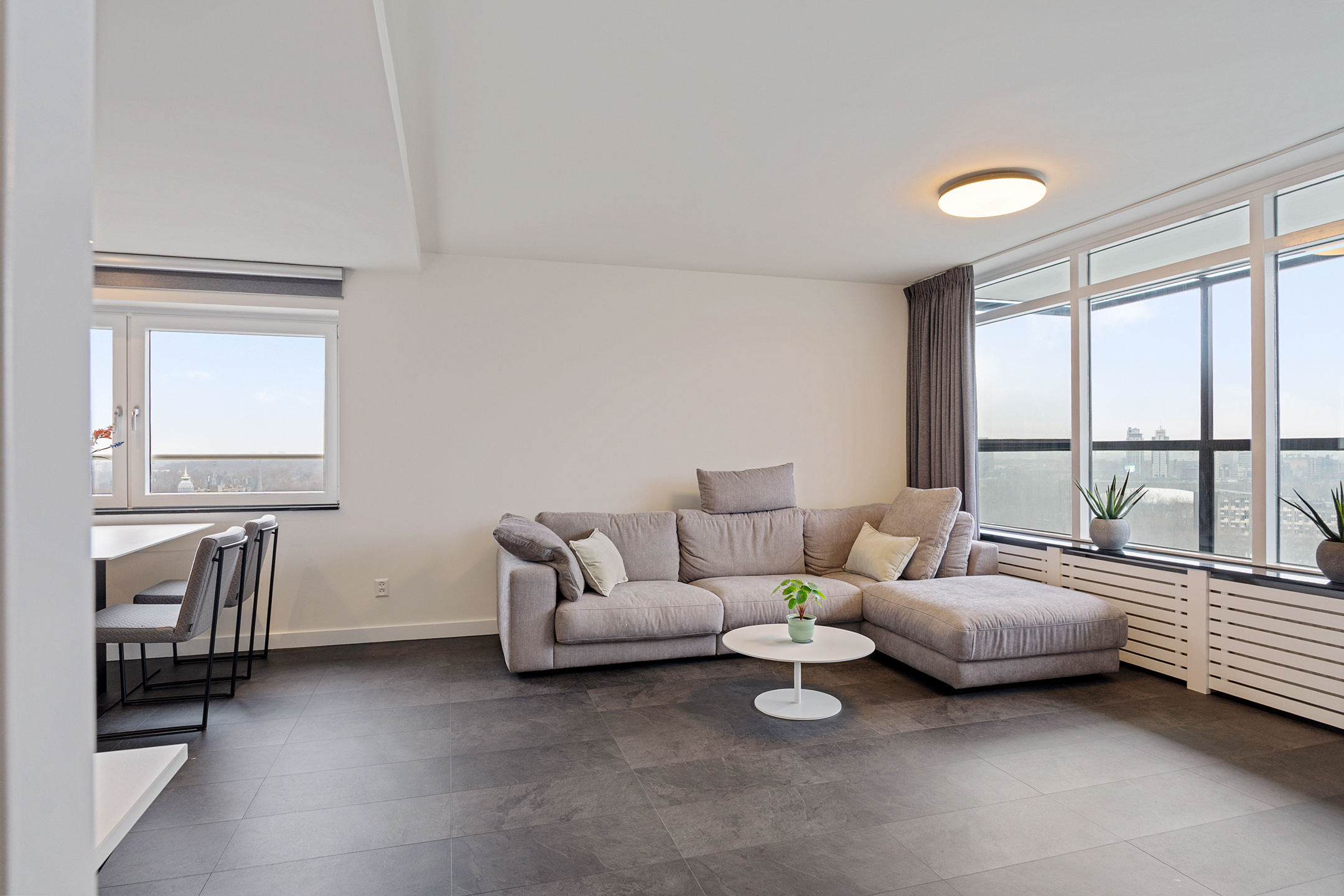 Via de grote ramen in de woonkamer kijk je uit op het royale balkon en het weidse panorama. Het balkon is voorzien van een glazen scherm, waardoor je hier beschut zit en volop kunt genieten van het uitzicht, de rust en de dynamiek van de stad.