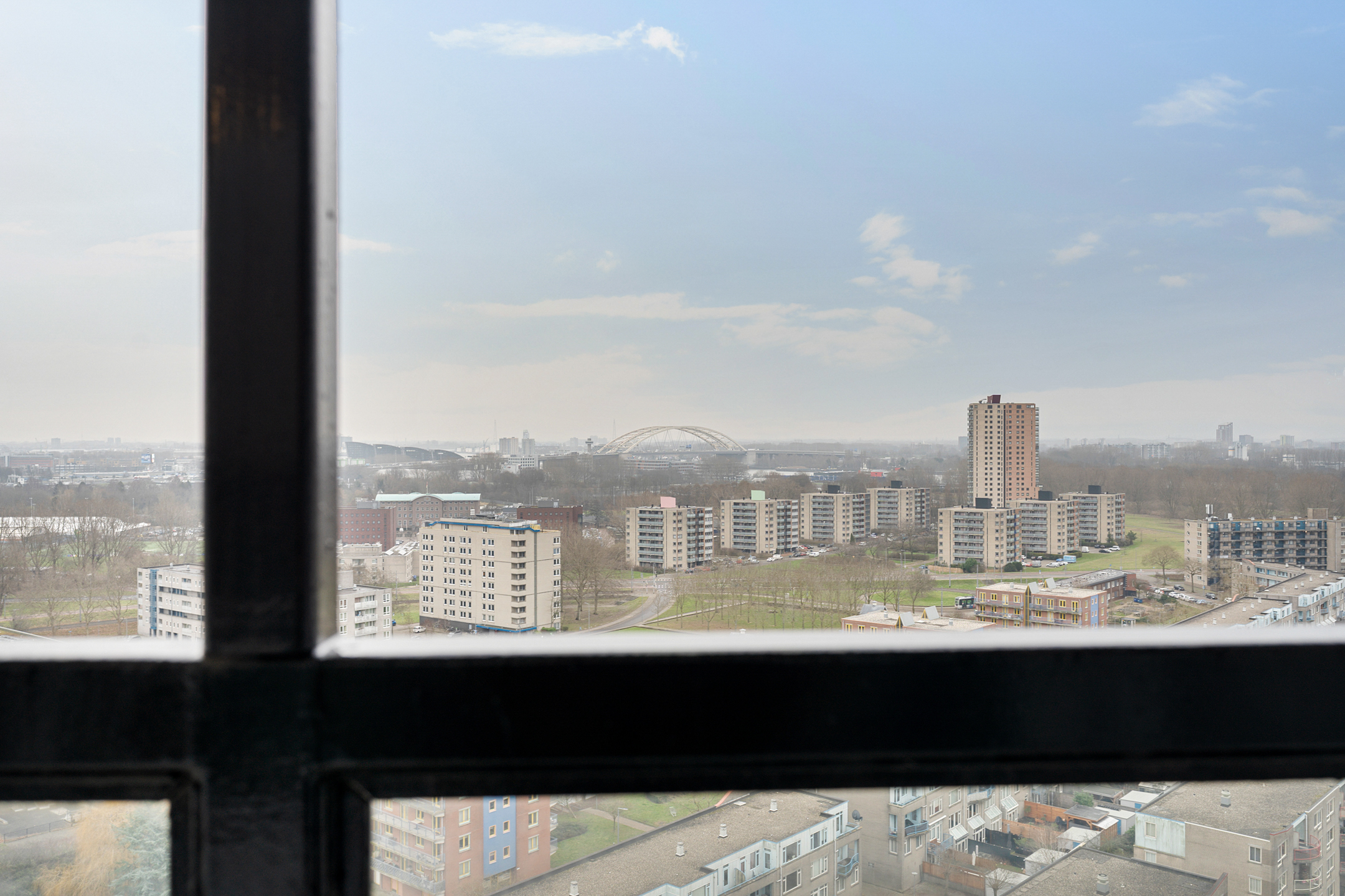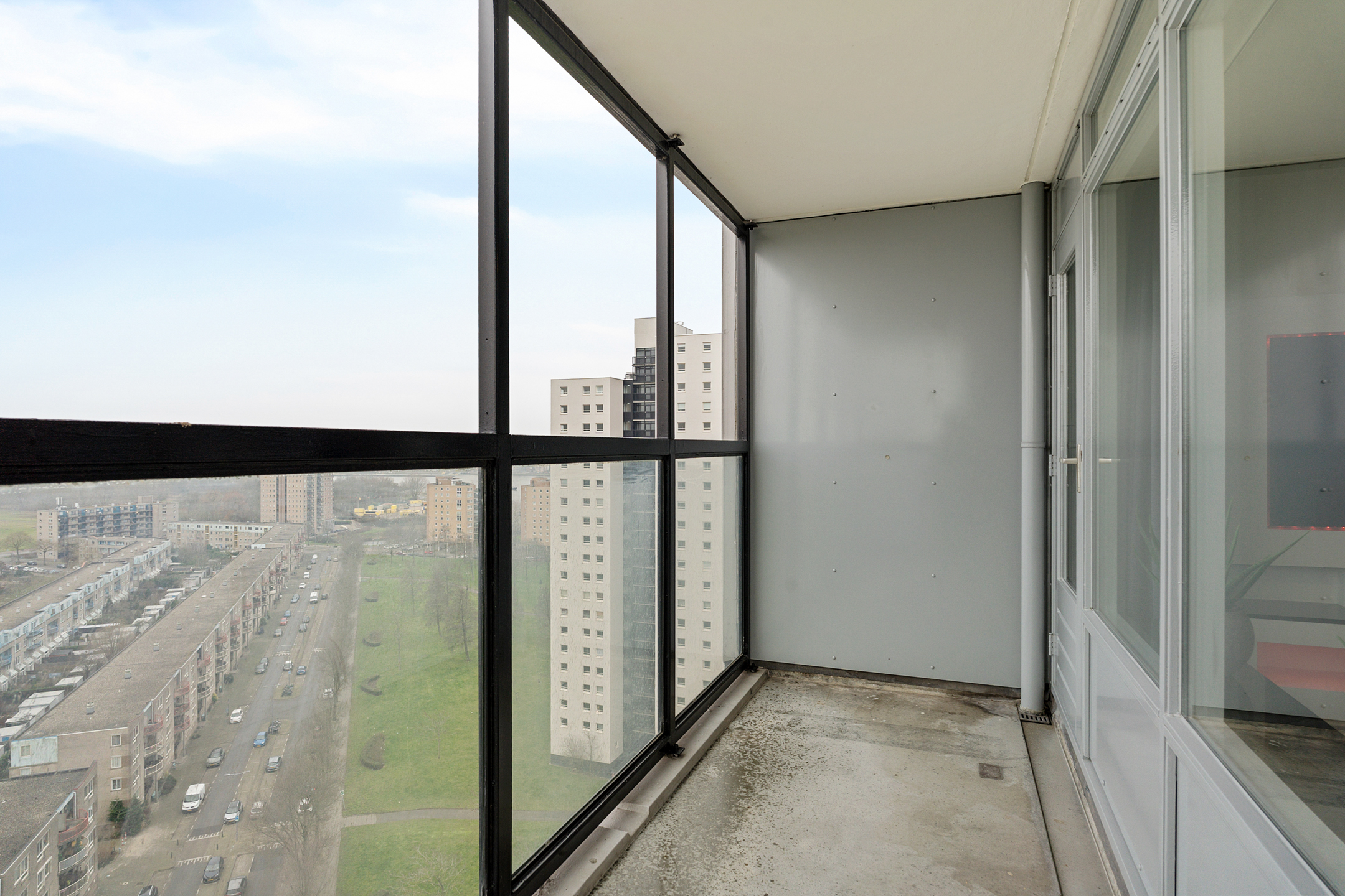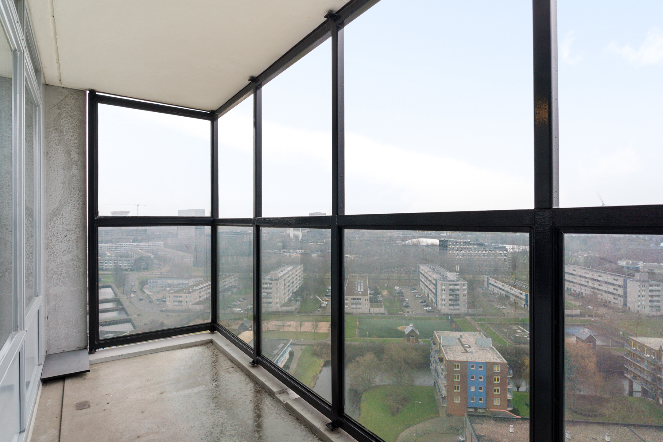 Via de grote ramen in de woonkamer kijk je uit op het royale balkon en het weidse panorama. Het balkon is voorzien van een glazen scherm, waardoor je hier beschut zit en volop kunt genieten van het uitzicht, de rust en de dynamiek van de stad.