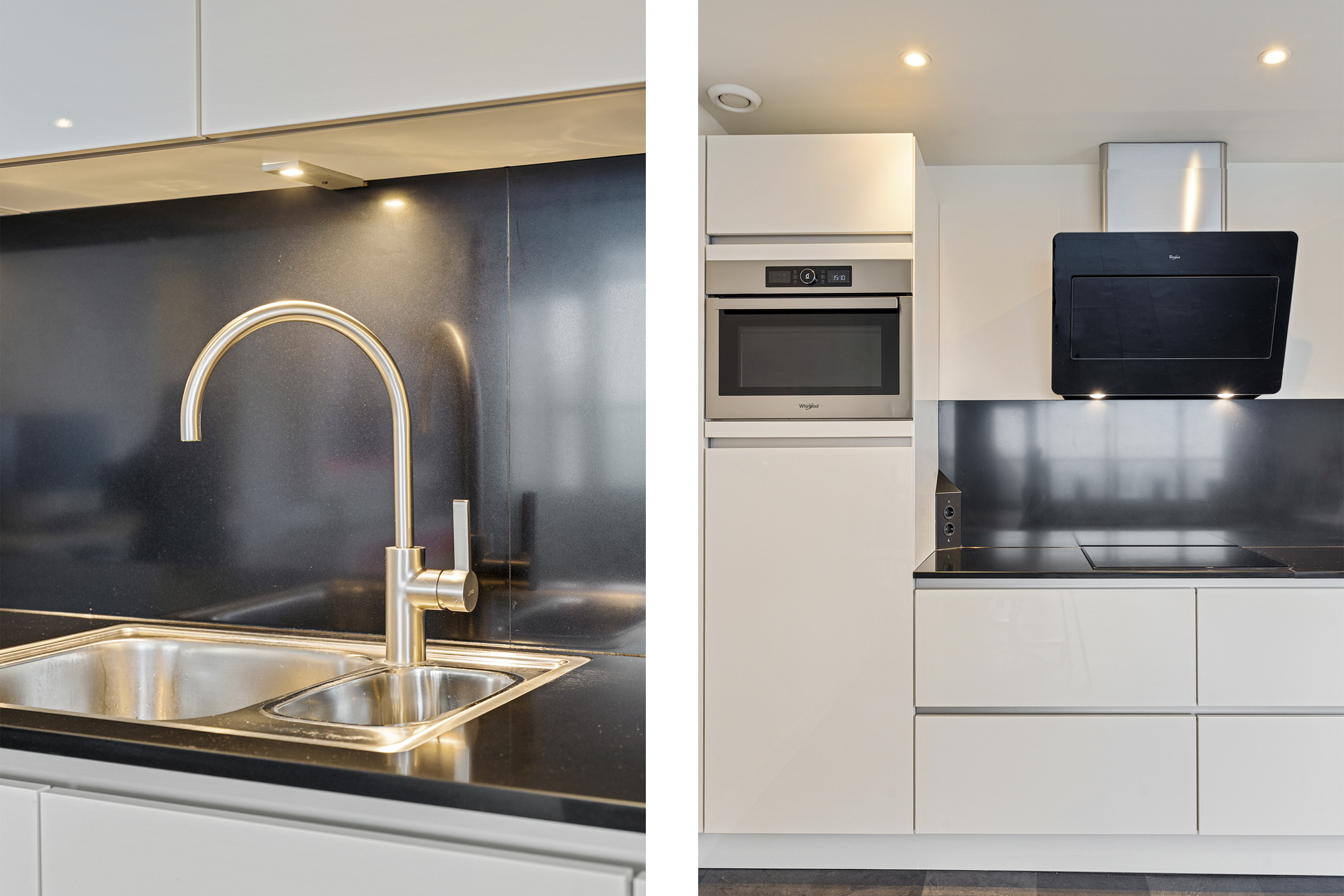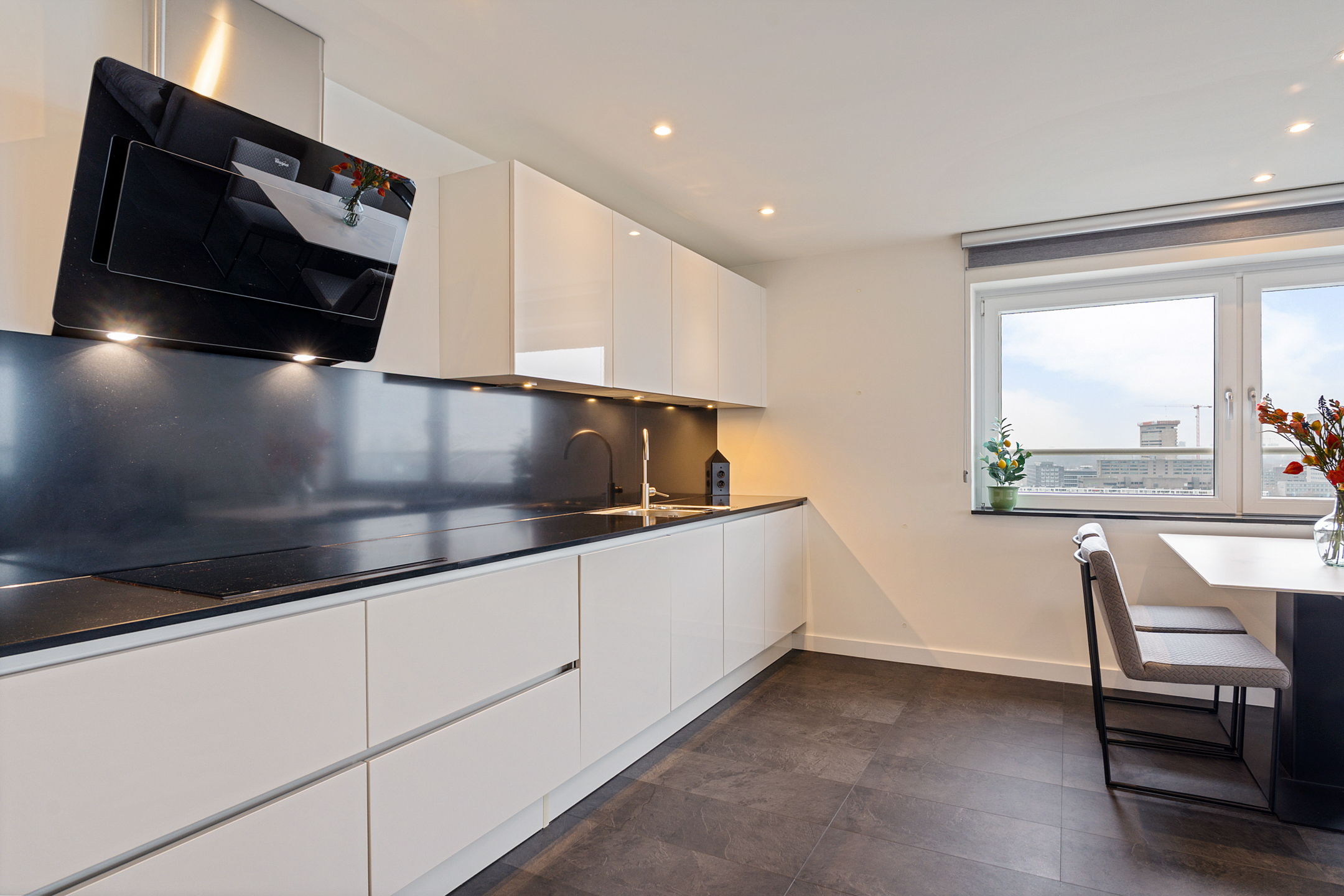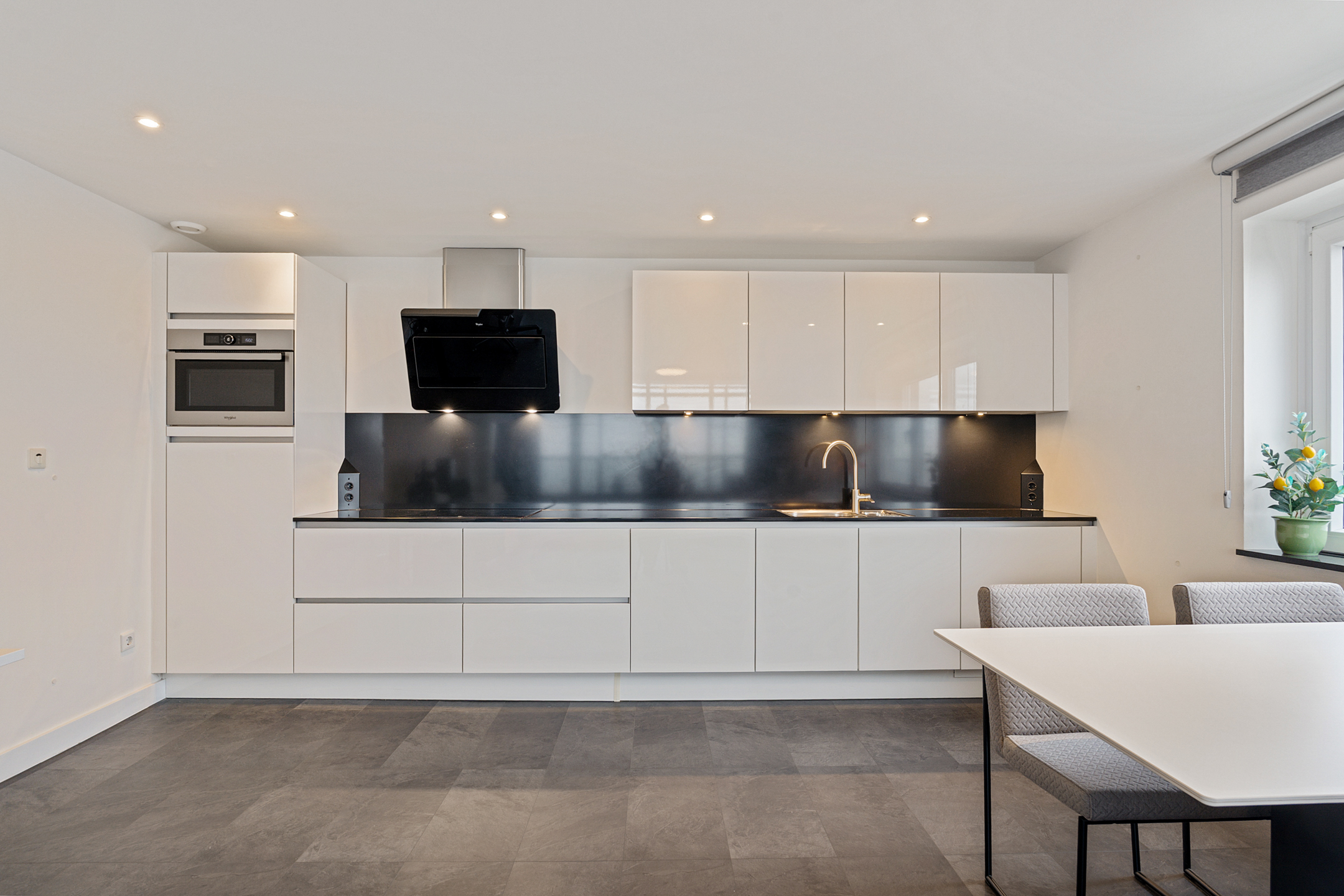 De ruime woonkamer staat in open verbinding met de keuken in wandopstelling. De keuken is compleet uitgerust met diverse inbouwapparatuur, waaronder een koelkast, combi-oven, inductiekookplaat, vaatwasser, vriezer, afzuigkap en een dubbele spoelbak. Dankzij de grote raampartijen ontvangt de keuken van twee zijden daglicht en geniet je ook hier van het fraaie uitzicht.