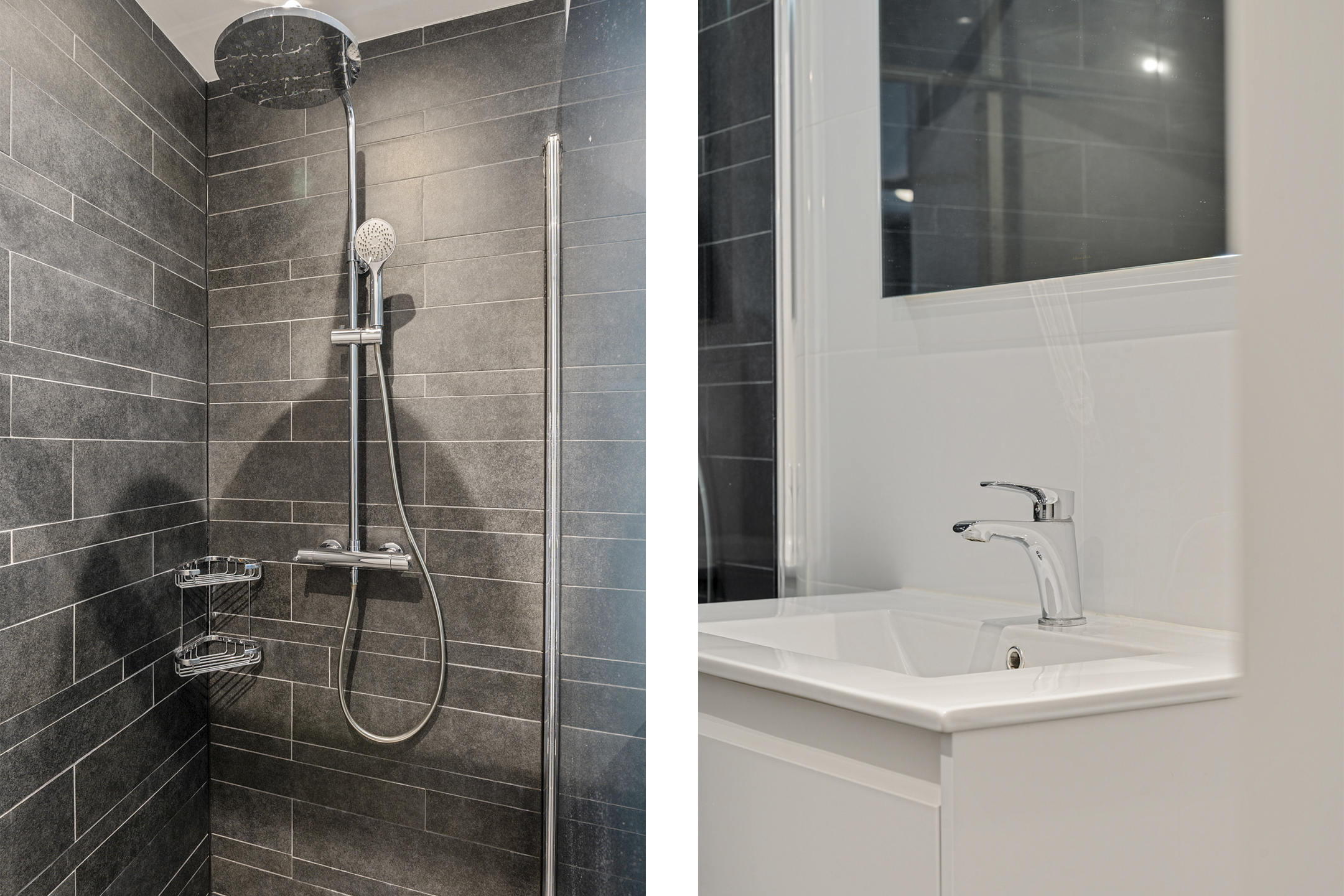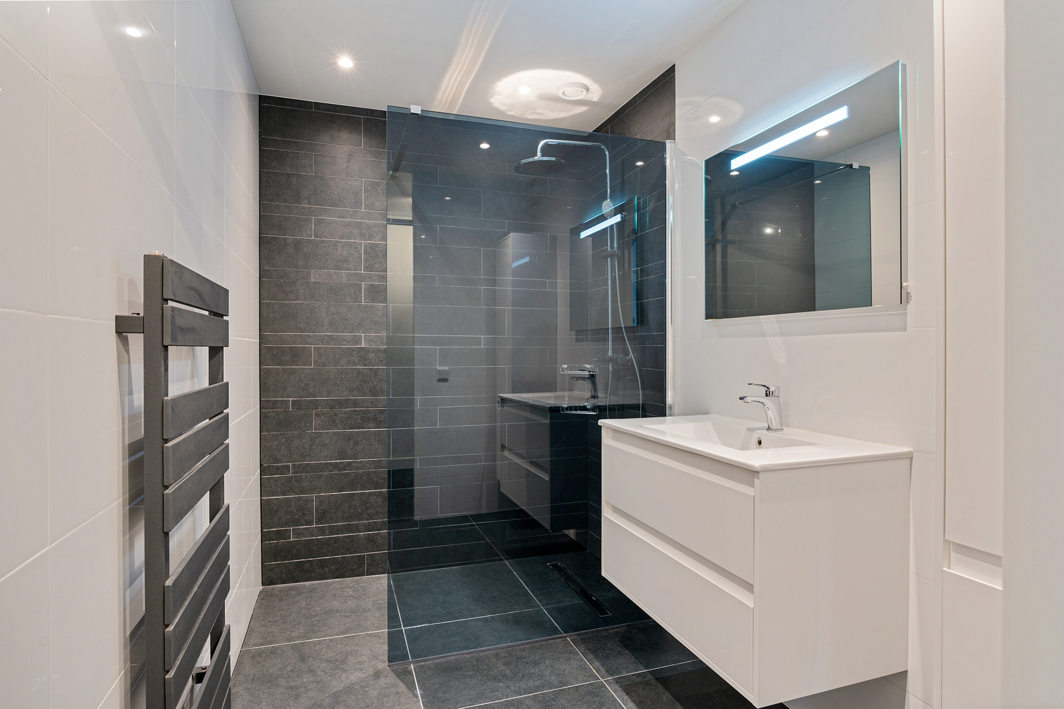 De moderne badkamer is royaal van formaat en strak afgewerkt. Door het gebruik van verschillende wand- en vloertegels oogt de ruimte eigentijds en verzorgd. De inloopdouche is voorzien van een verduisterd hardglazen douchescherm. Daarnaast beschik je hier over een designradiator, wastafel met meubel, spiegel met verlichting, een praktische kast en spotjes in het plafond.