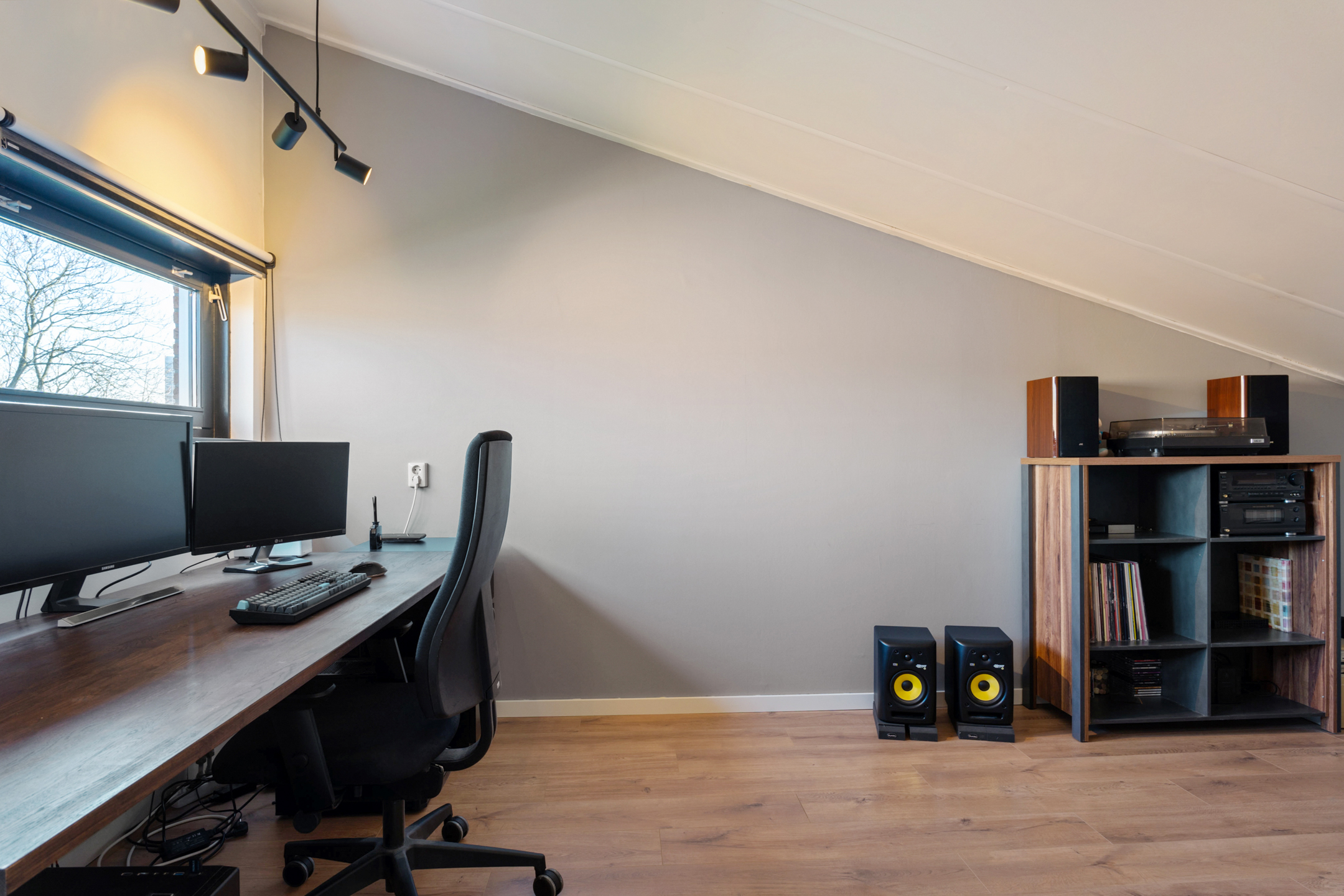 Op zolder vind je een royale overloop met veel bergruimte en een aparte kast voor de wasmachine- en droger-opstelling. De vierde slaapkamer is ruim, licht en voorzien van extra bergruimte achter de knieschotten – ideaal voor koffers, seizoensspullen of gewoon wat extra overzicht. Eveneens is er de mogelijkheid om een vijfde slaapkamer of kantoorruimte te creëren door het plaatsen van een dakkapel.