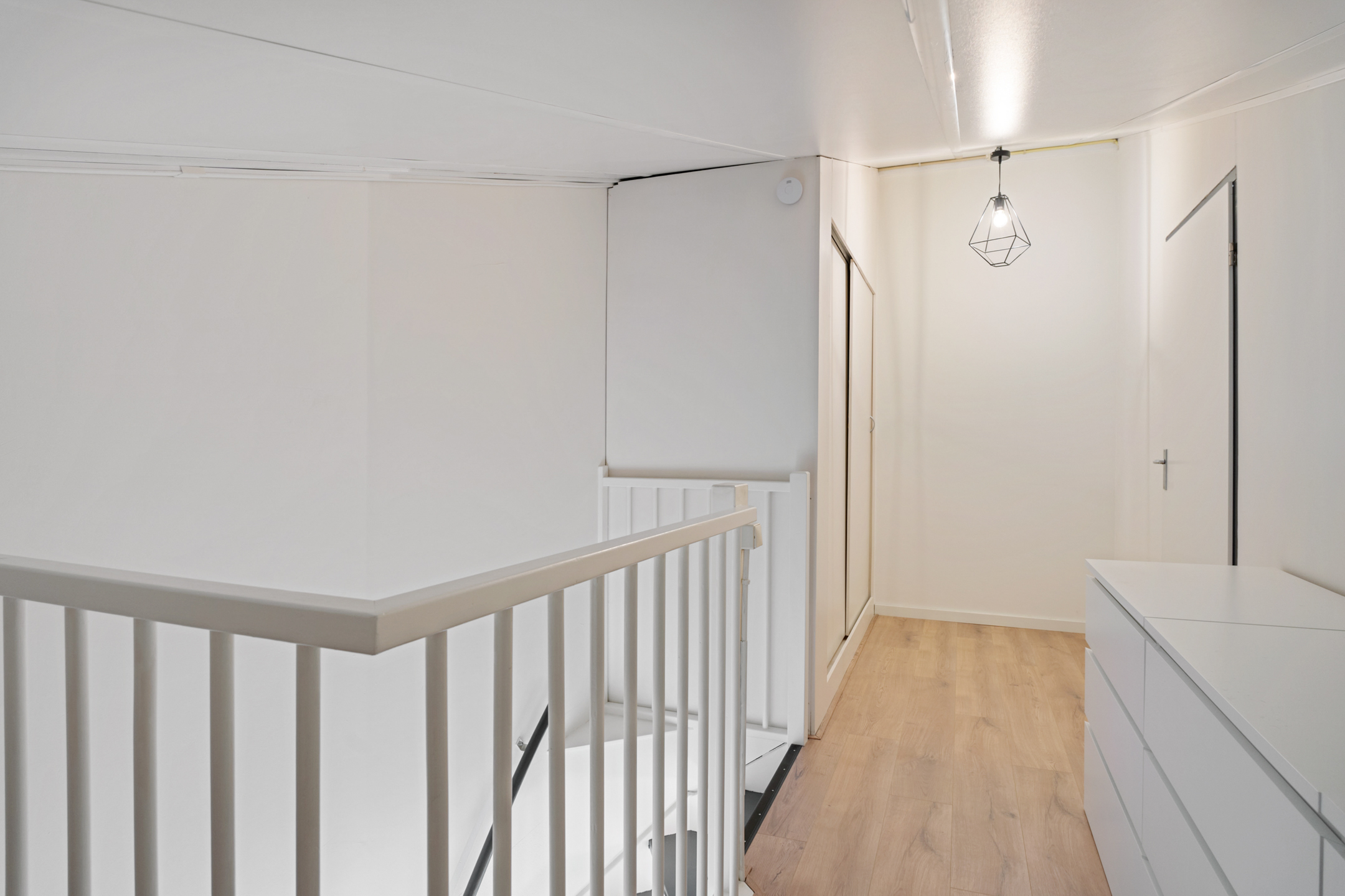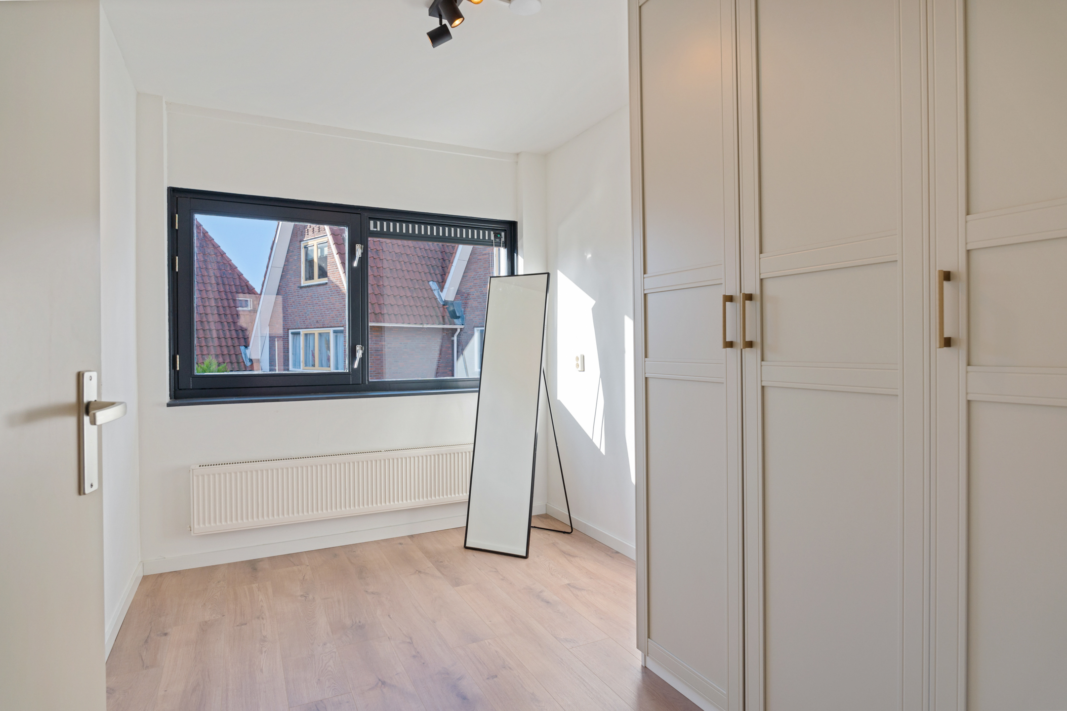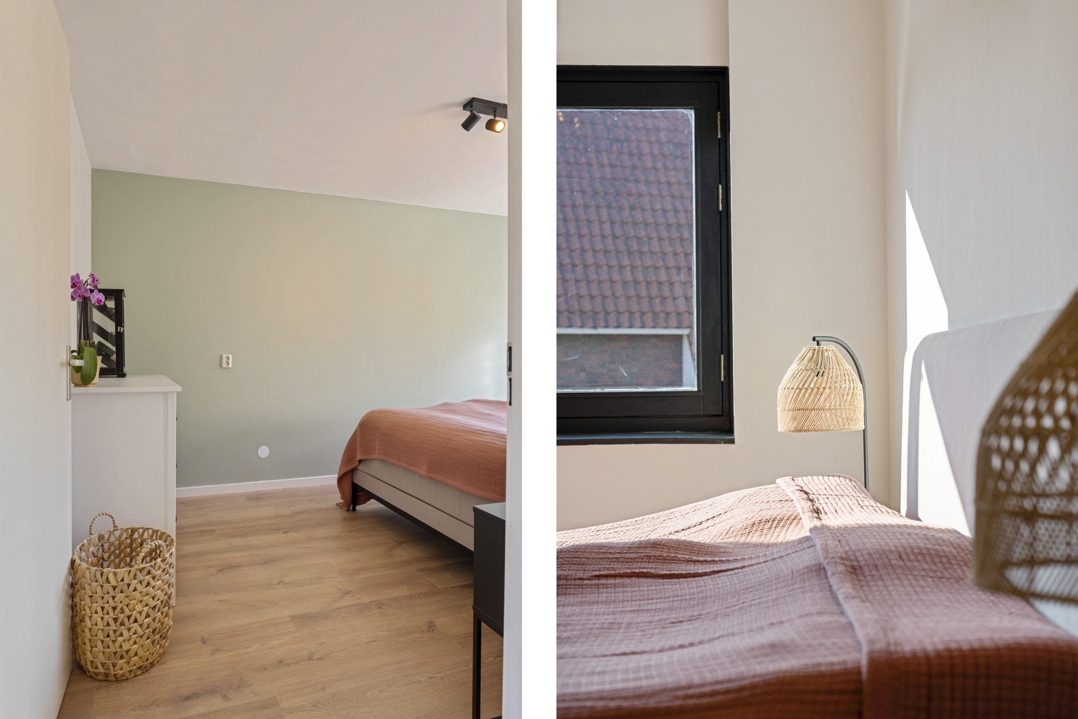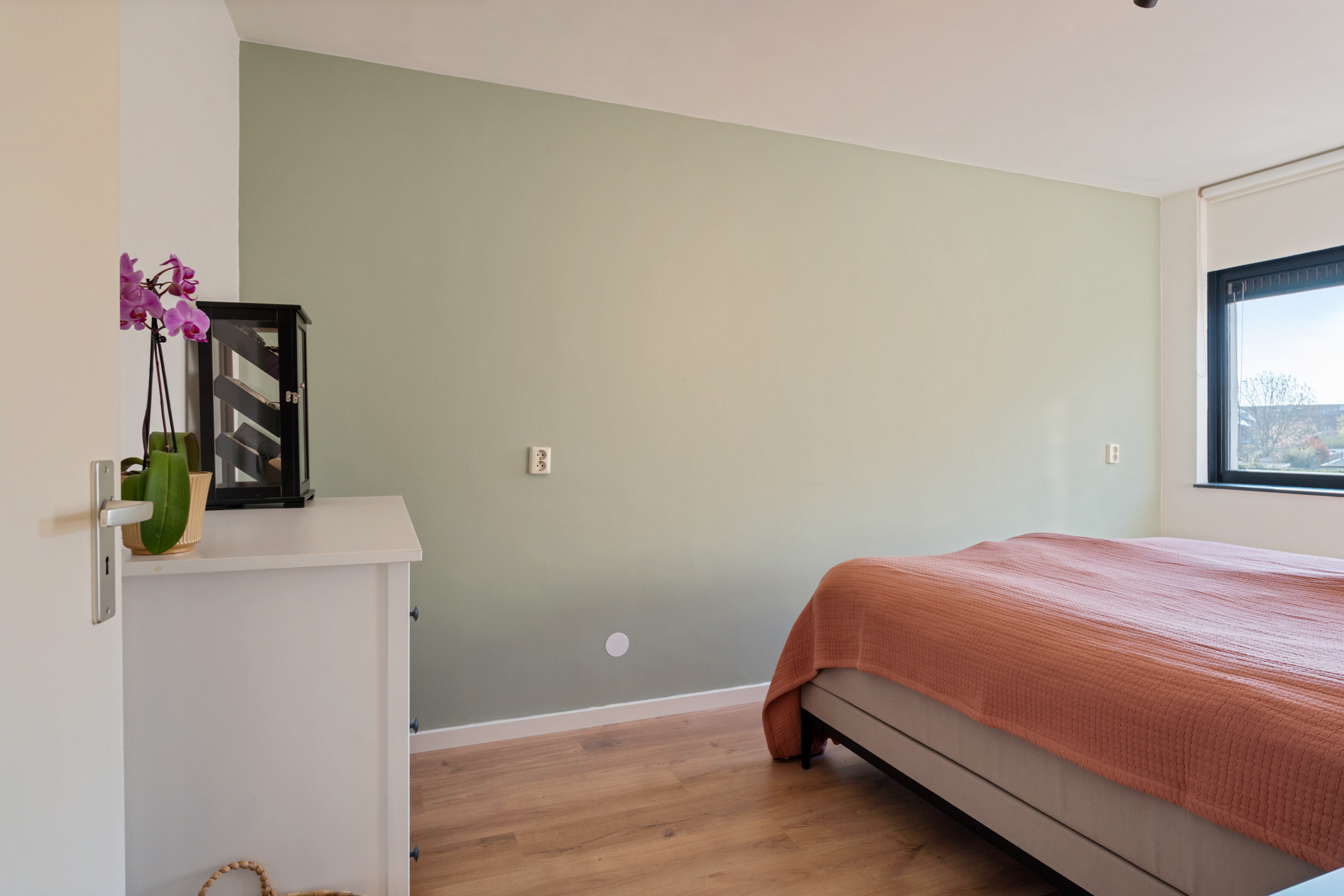 Op de overloop valt het grote raam op dat zorgt voor veel natuurlijk licht. Je vindt hier drie slaapkamers, allemaal goed van formaat. De lichte kamer aan de voorzijde is ideaal als kinder-, werk- of logeerkamer. Aan de achterzijde bevinden zich de royale hoofdslaapkamer en nog een ruime kamer.