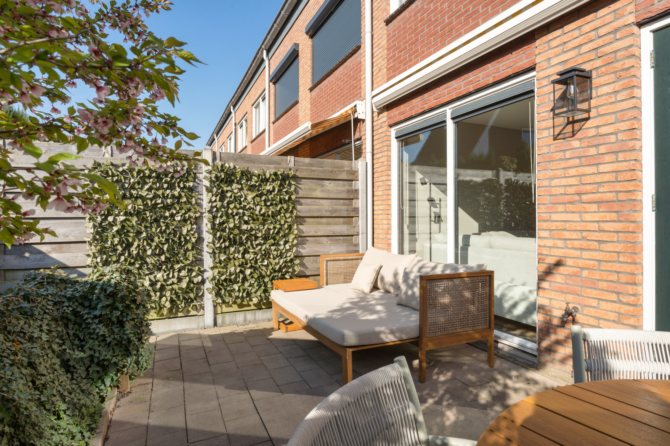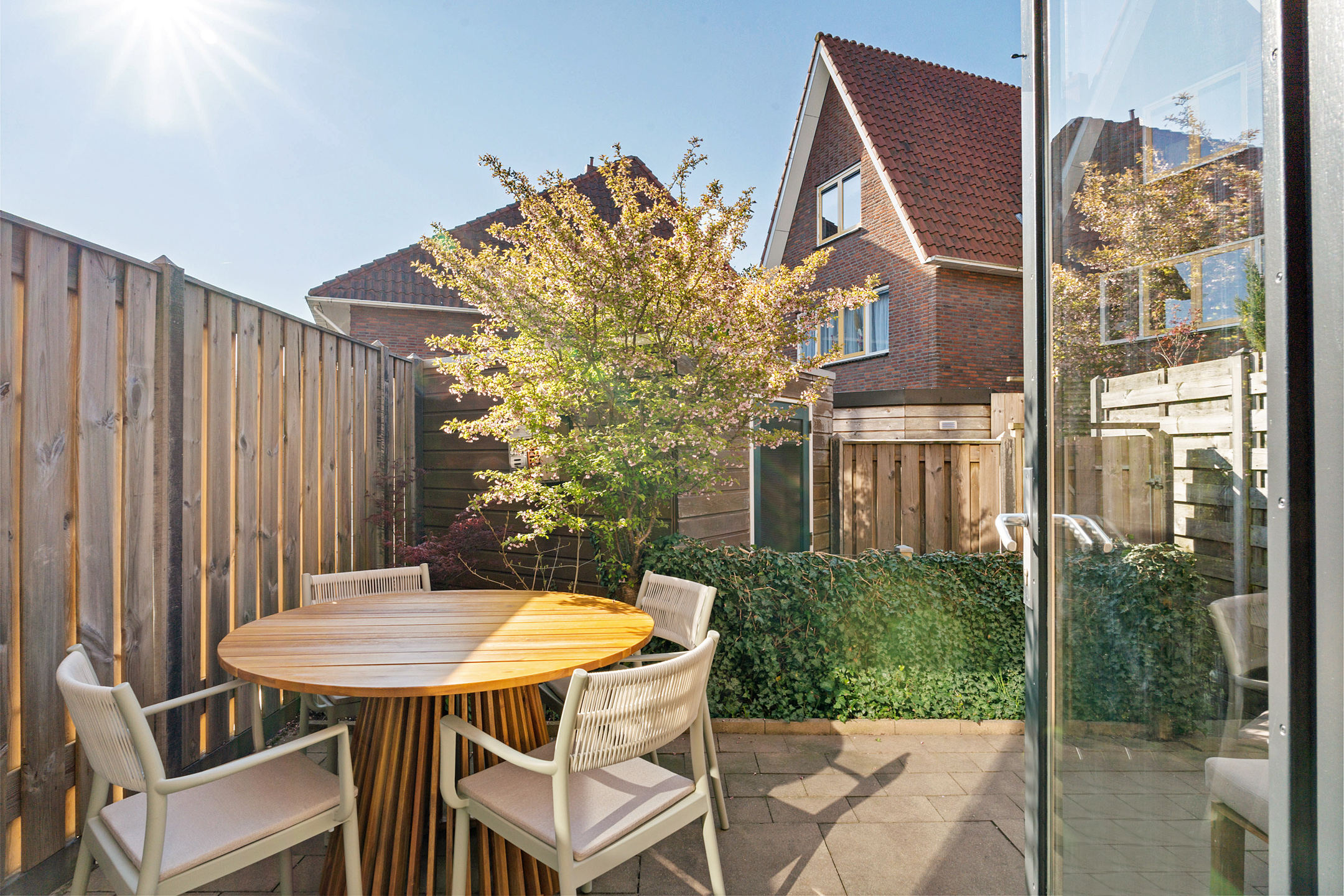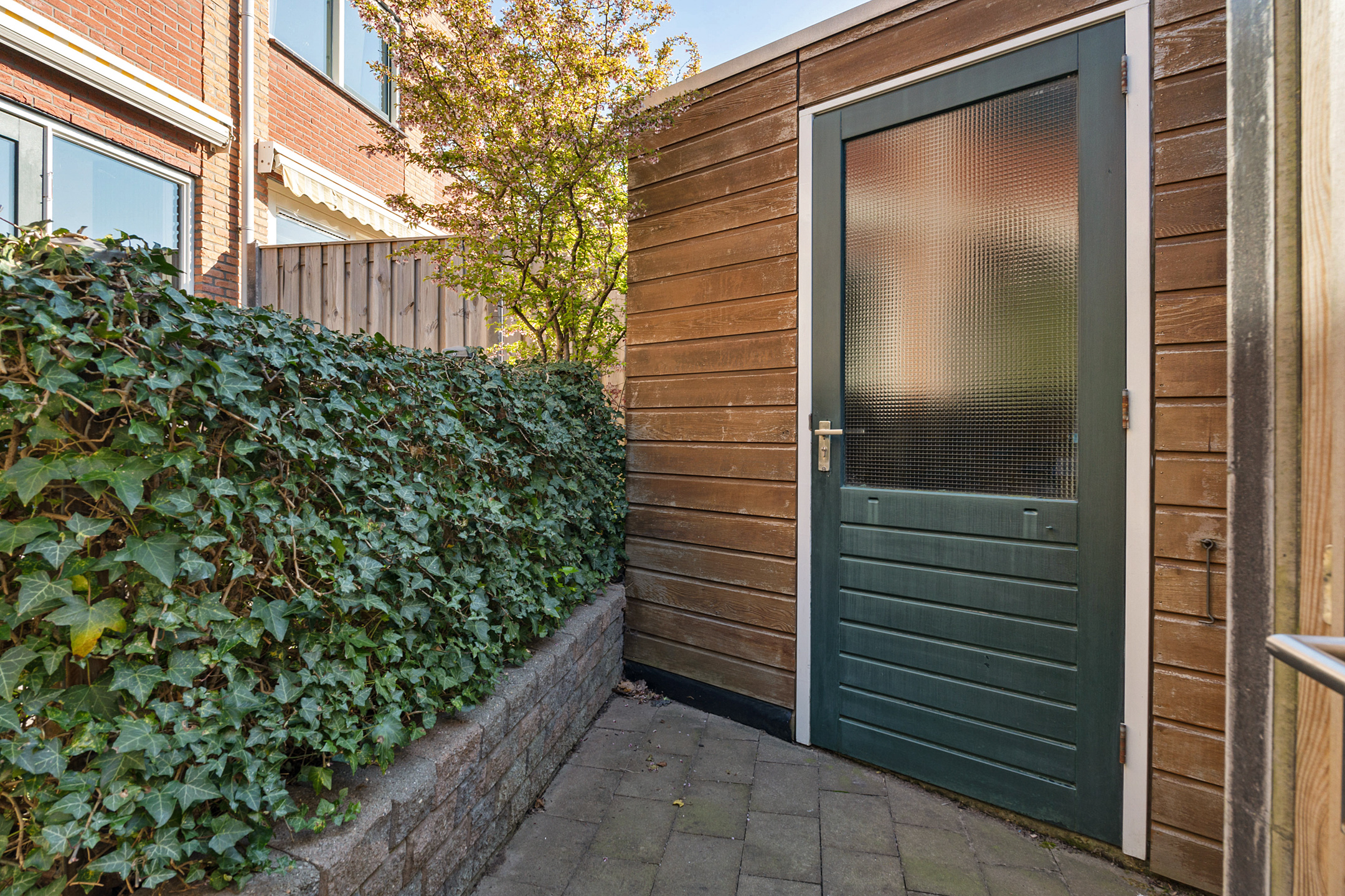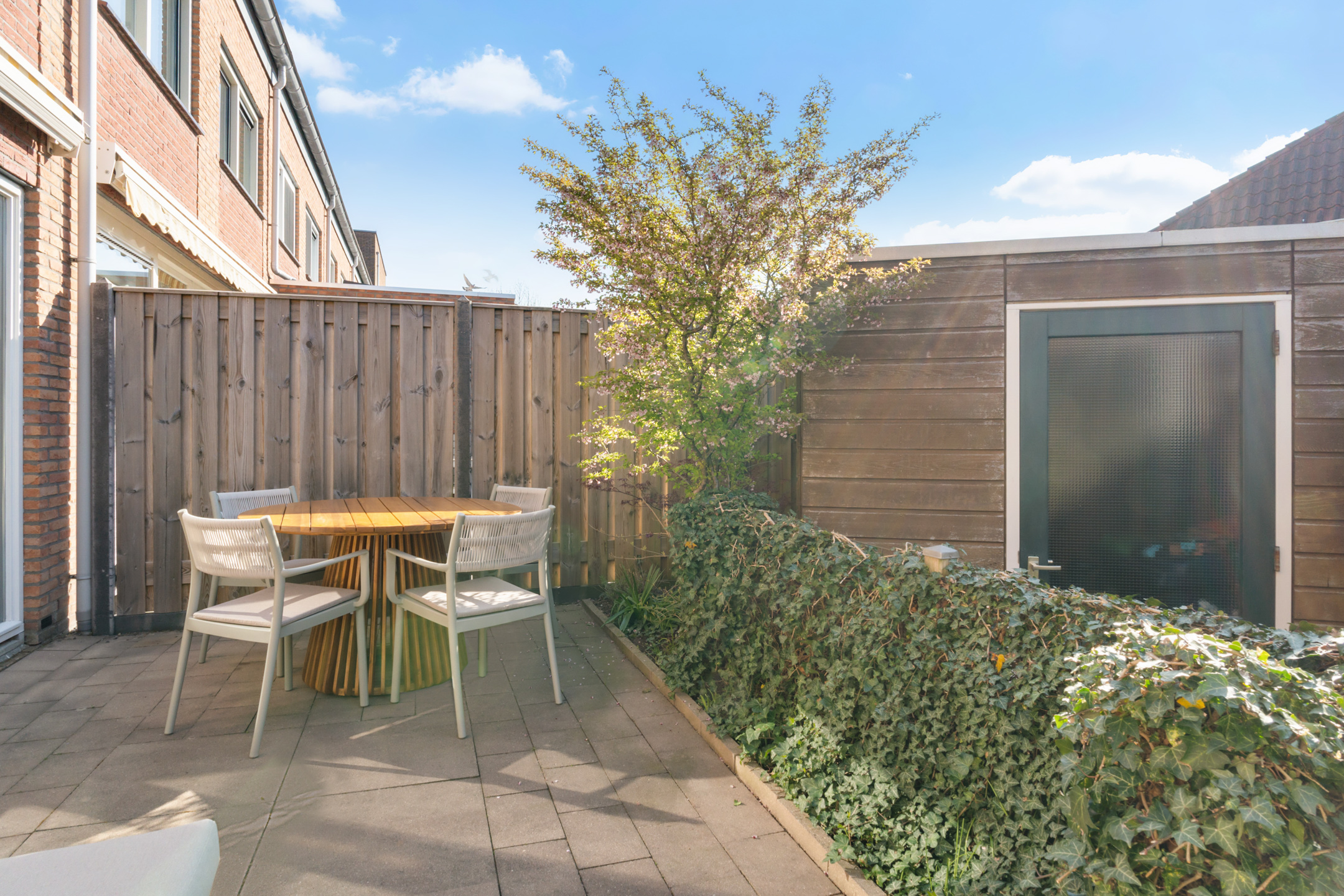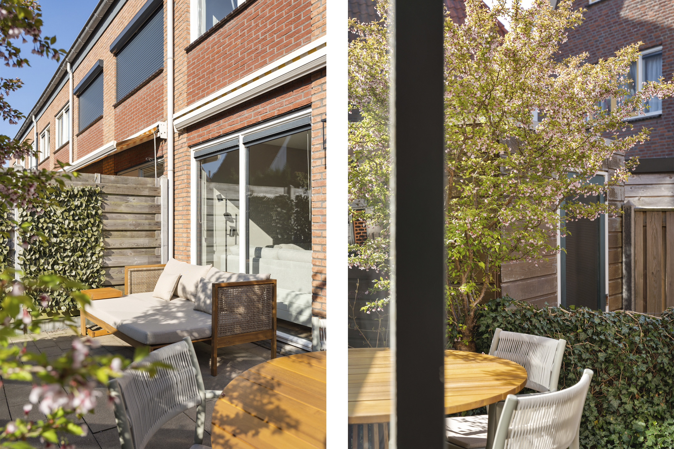 Aan de achterzijde ligt een zonnige tuin van circa 30 m² op het zuidoosten – een heerlijke plek voor je eerste kop koffie of lange zomeravonden. Het speelse hoogteverschil geeft de tuin net dat beetje extra sfeer. Verder beschik je over een handmatig zonnescherm, een praktische achterom en een vrijstaande houten berging met elektra – perfect voor fietsen, tuinspullen of een kleine werkplek.