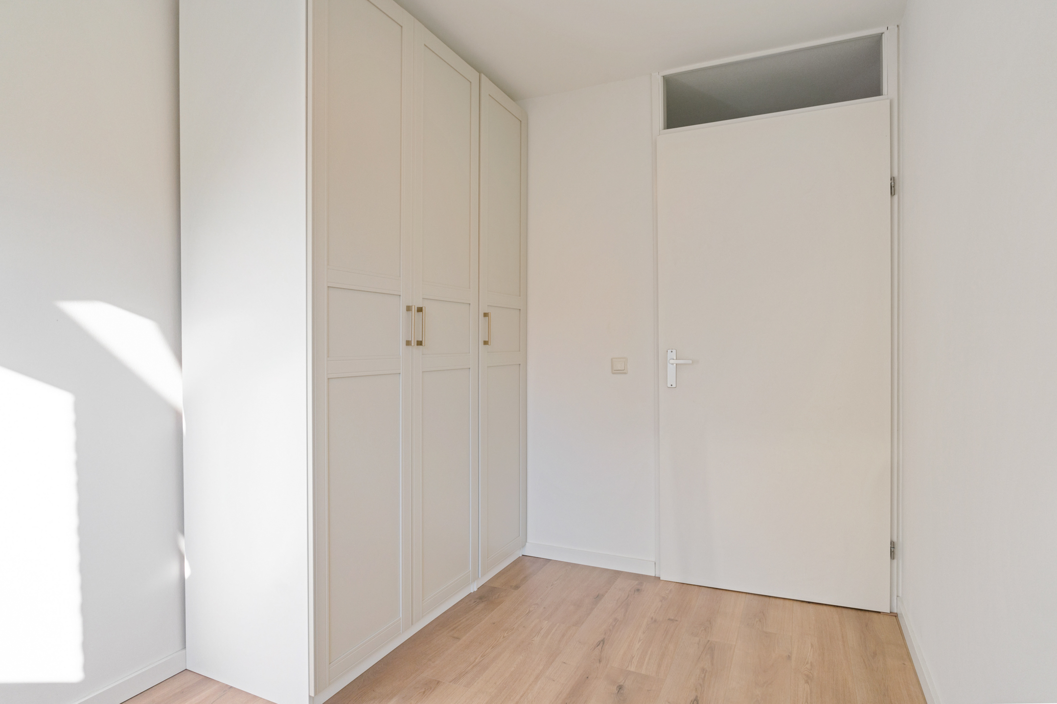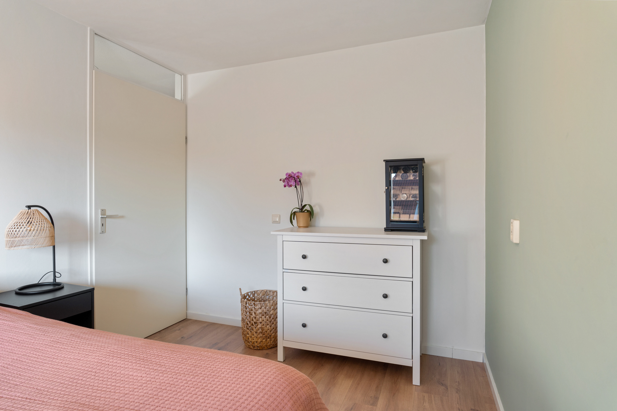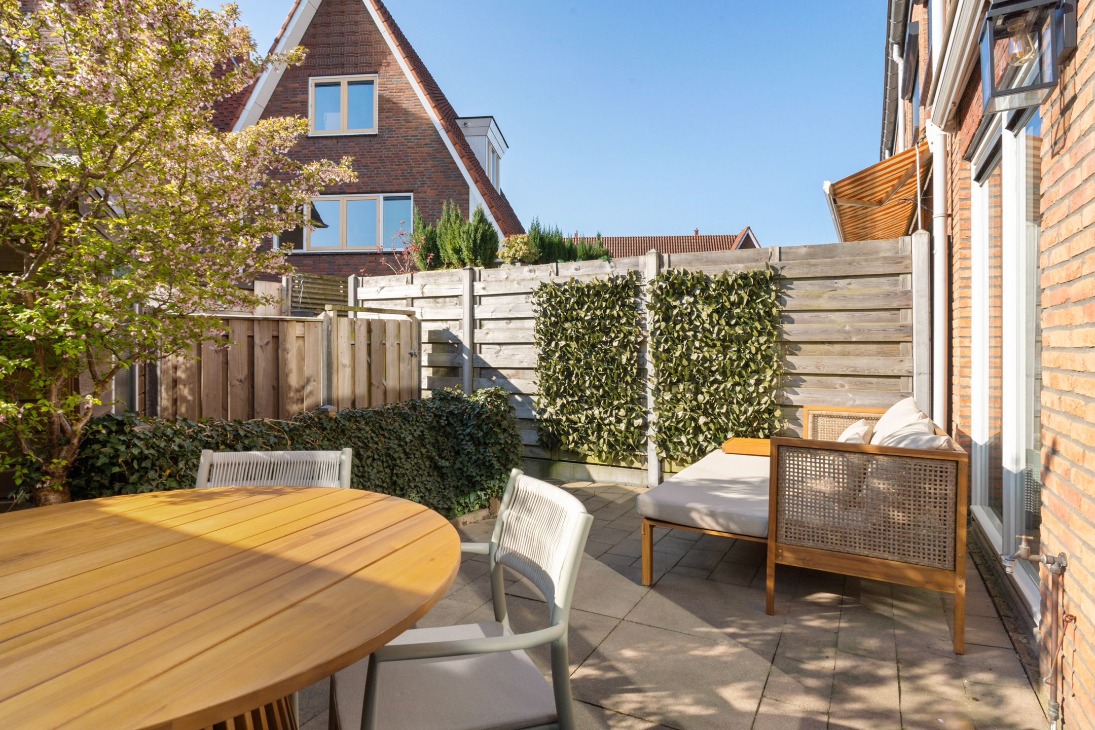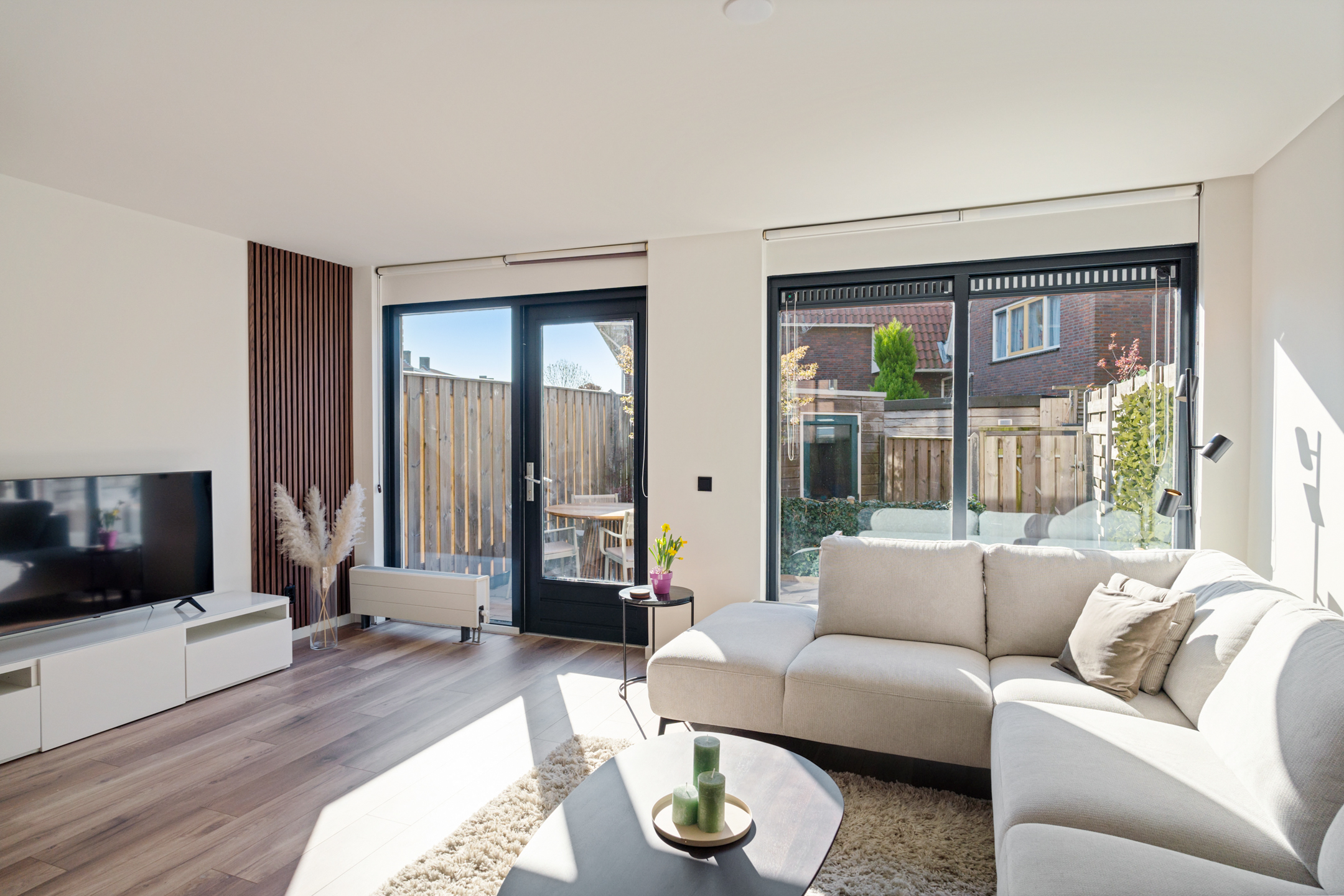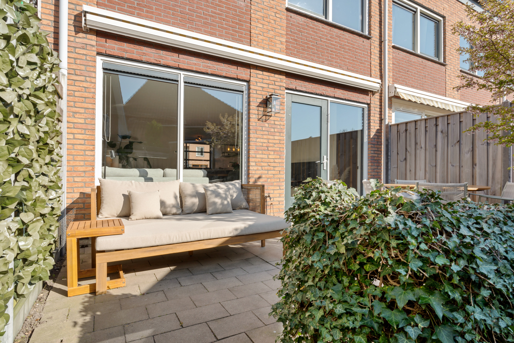 Aan de achterzijde ligt een zonnige tuin van circa 30 m² op het zuidoosten – een heerlijke plek voor je eerste kop koffie of lange zomeravonden. Het speelse hoogteverschil geeft de tuin net dat beetje extra sfeer. Verder beschik je over een handmatig zonnescherm, een praktische achterom en een vrijstaande houten berging met elektra – perfect voor fietsen, tuinspullen of een kleine werkplek.