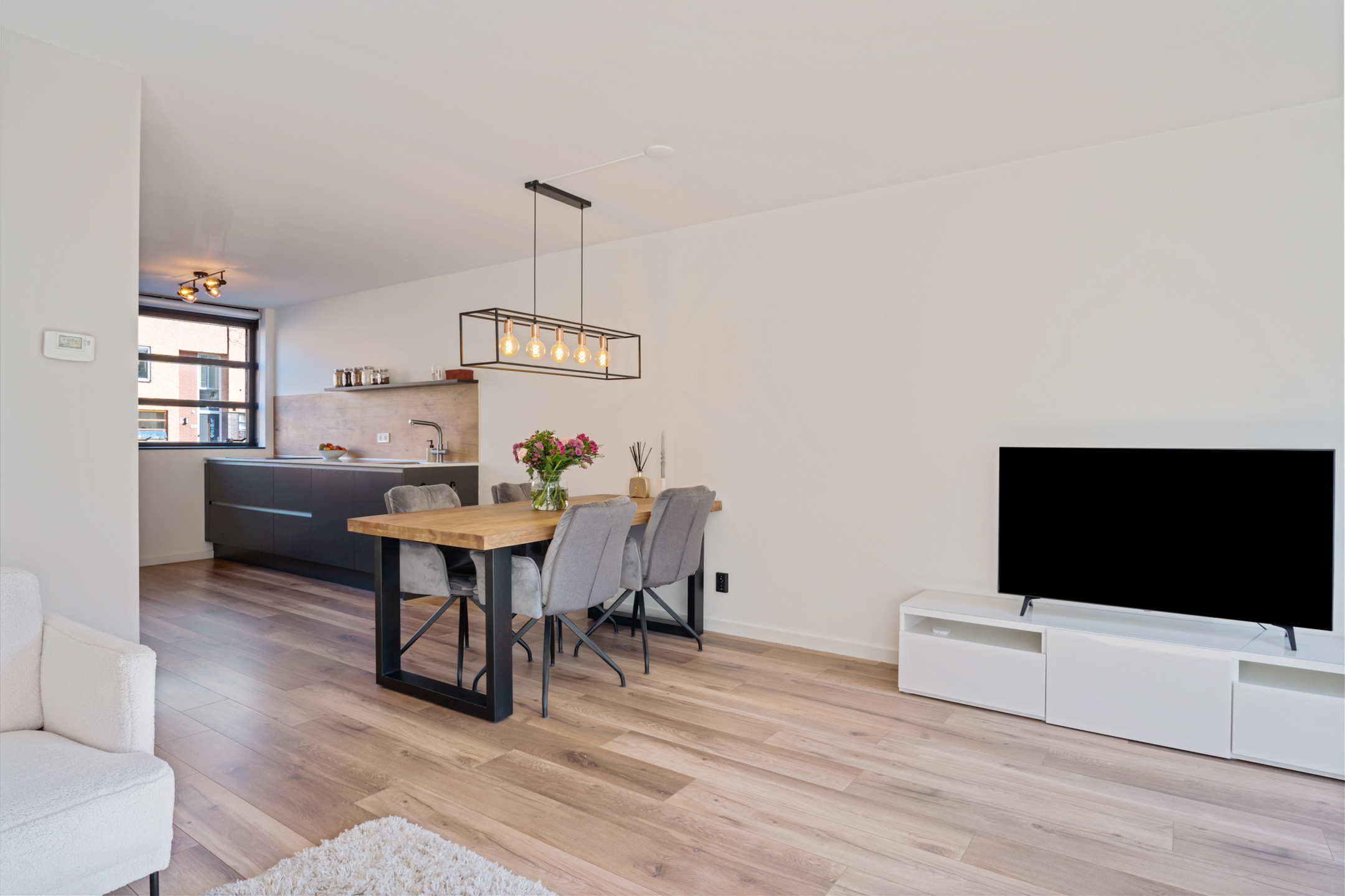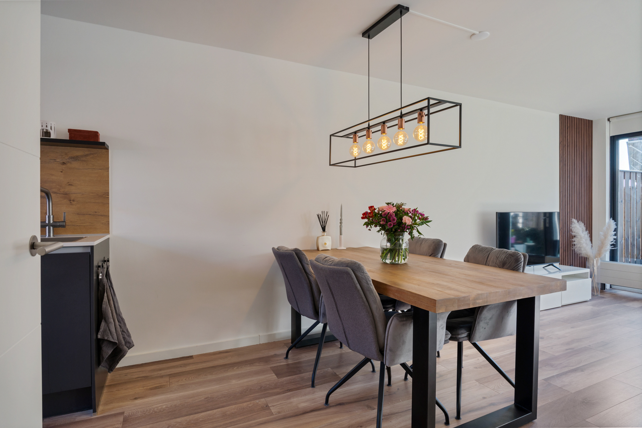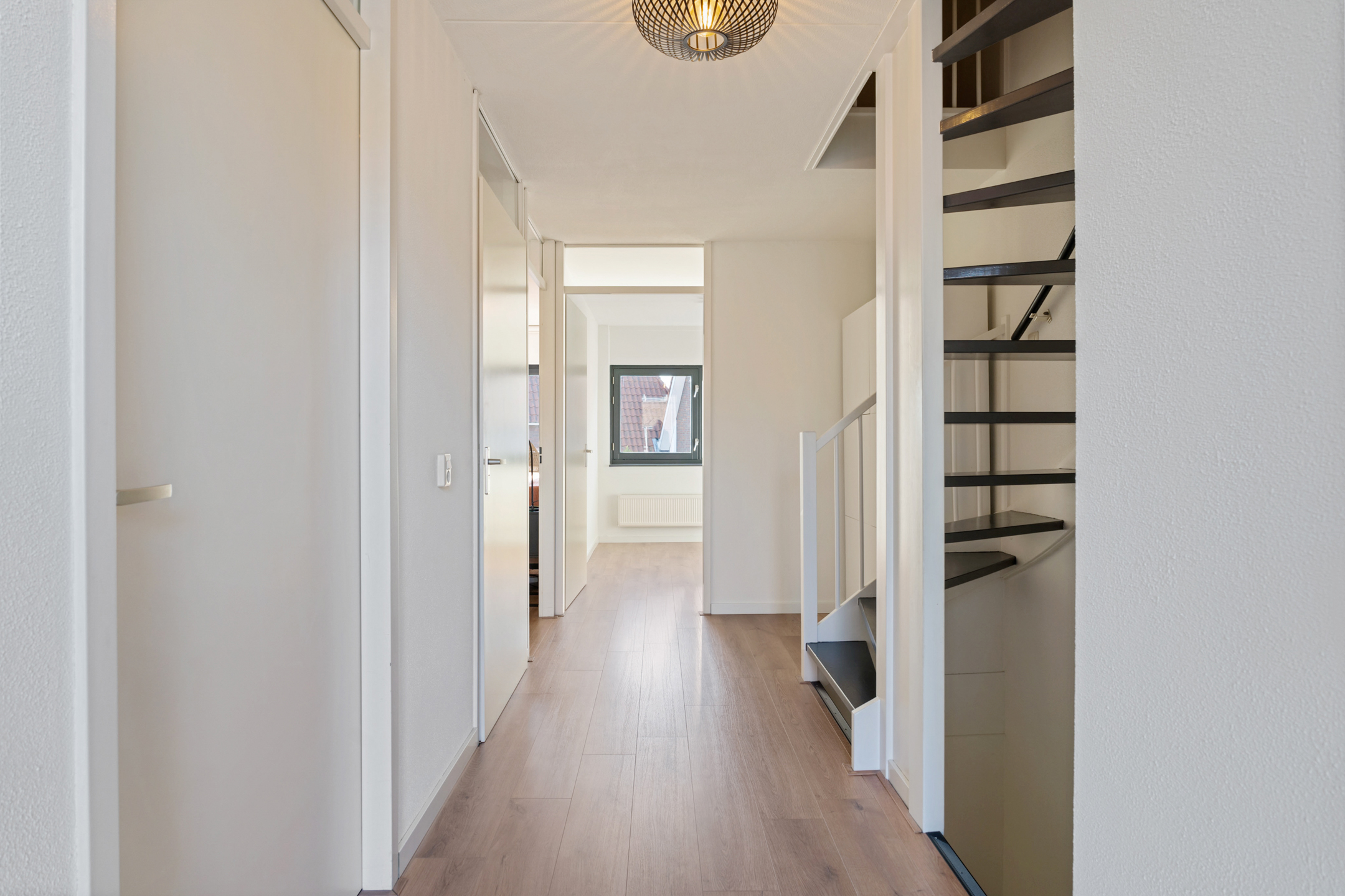 Je komt binnen in een ruime hal met toegang tot de vernieuwde meterkast (8 groepen met aardlekschakelaar), een modern toilet met fonteintje gerenoveerd in 2024 en een handige trapkast. De woonkamer is licht en ruim, met grote ramen en een fijne indeling. Aan de achterzijde vind je de open keuken uit 2020: strak, modern en compleet.