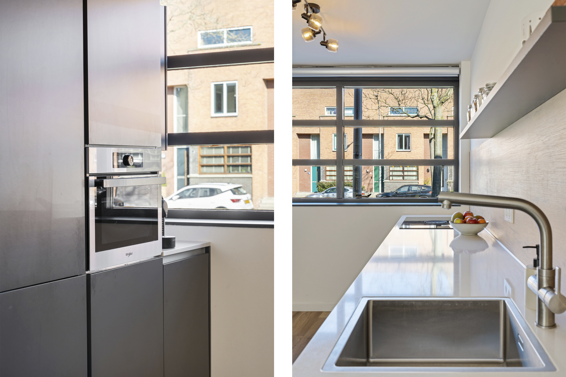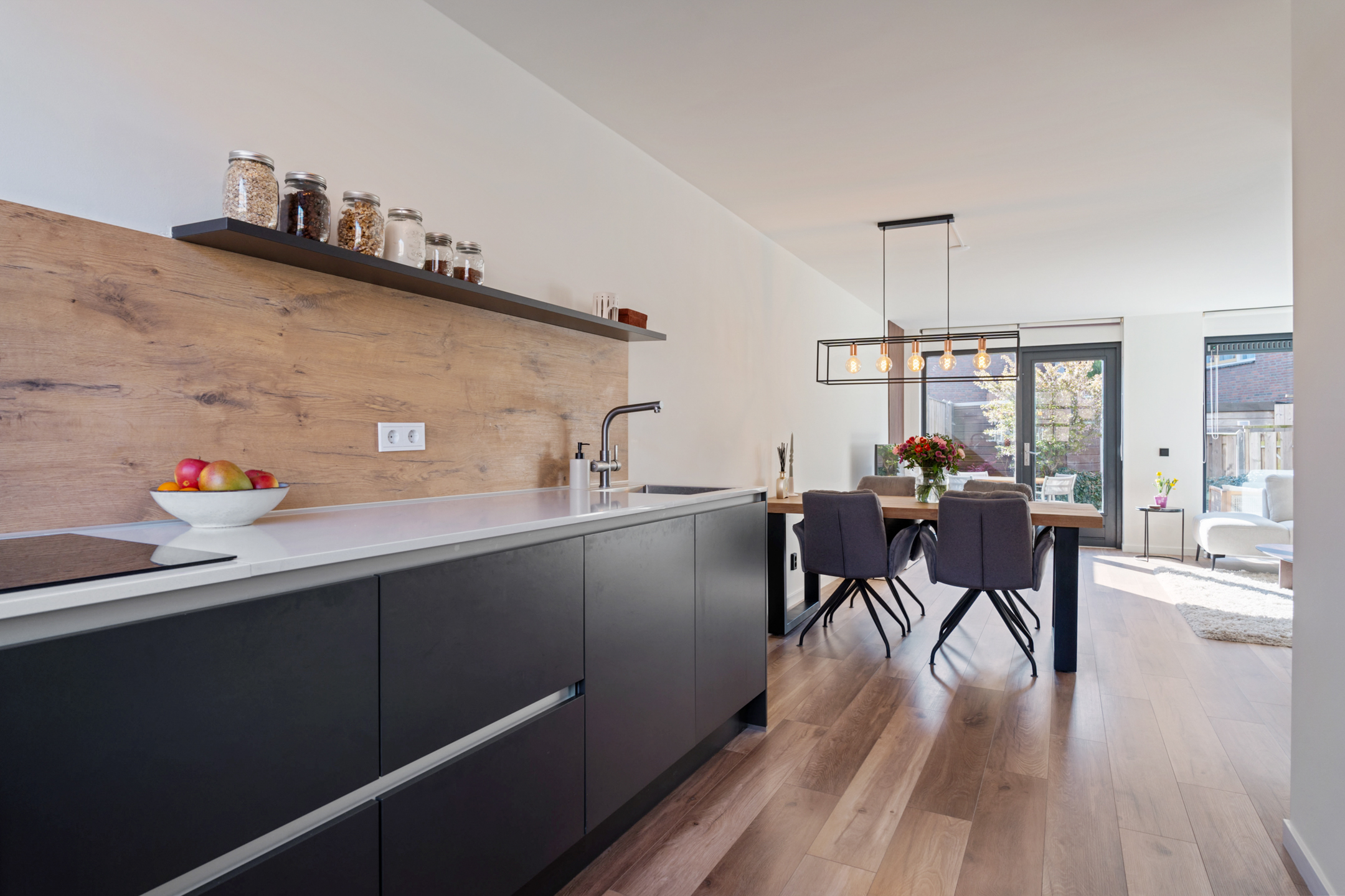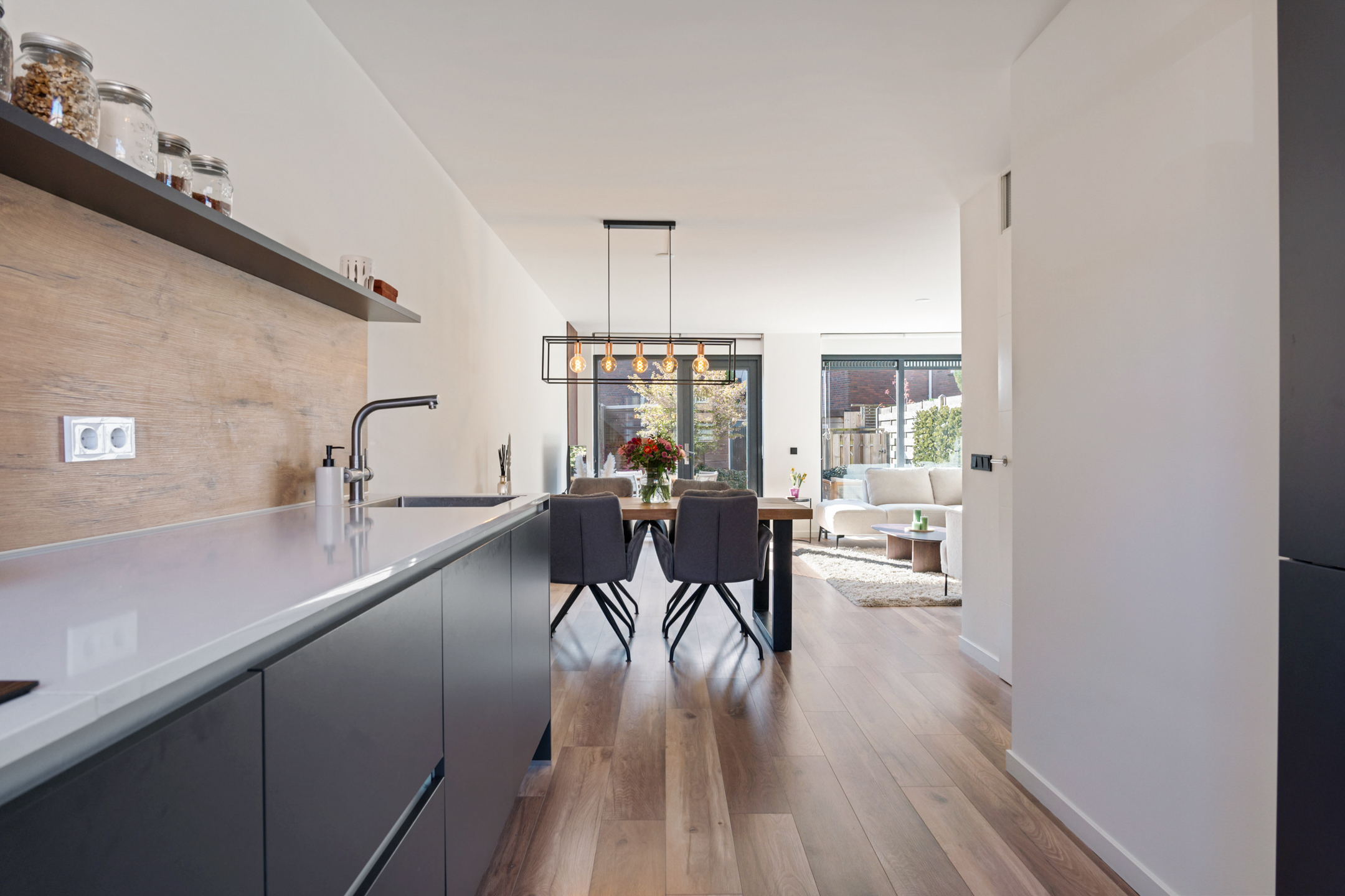 Hier kook je in stijl met hoogwaardige inbouwapparatuur zoals een kokend-waterkraan, vaatwasser, koel-/vriescombinatie, combi-oven/magnetron, composiet werkblad en een inductiekookplaat met geïntegreerde afzuiging.