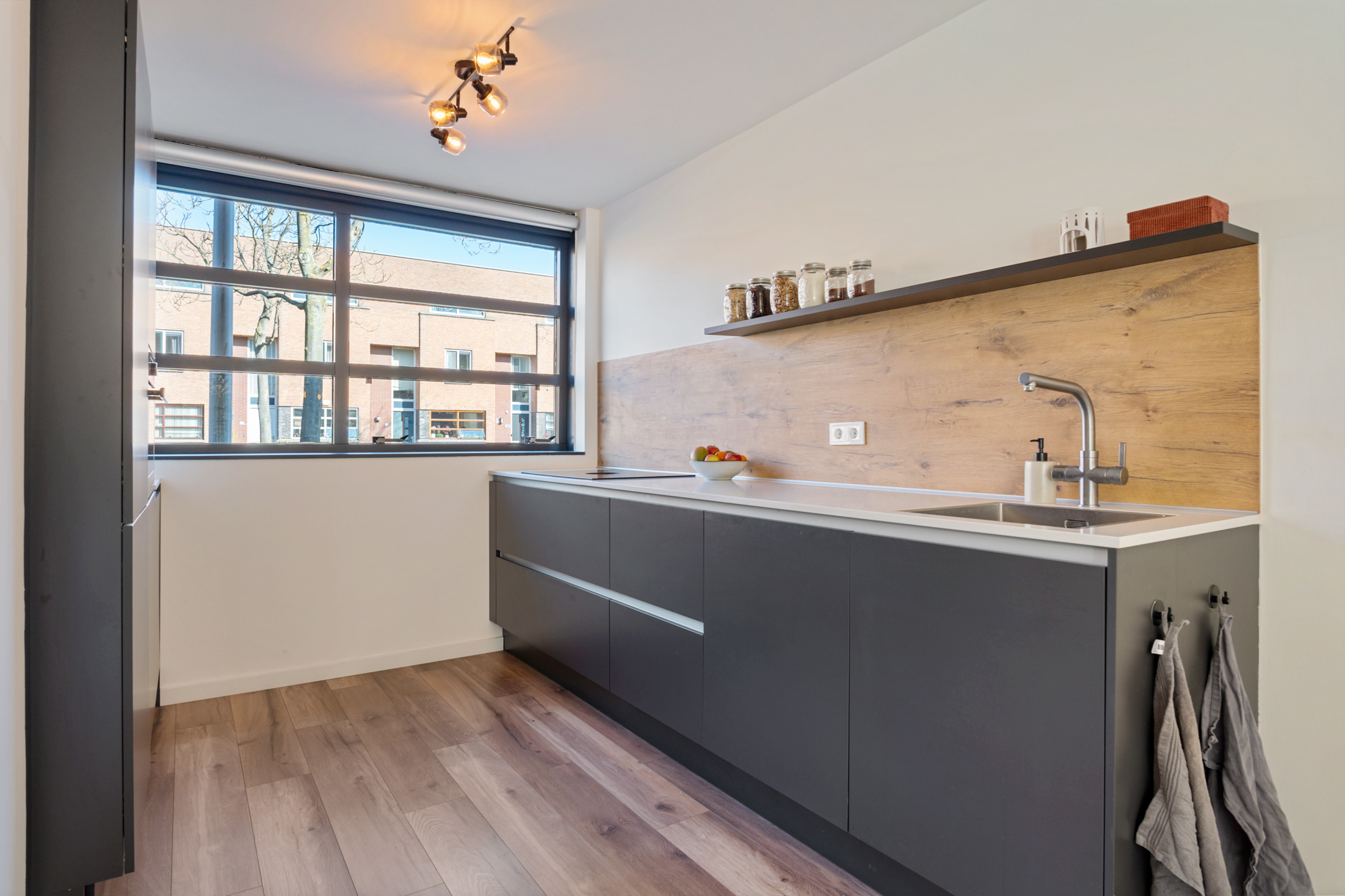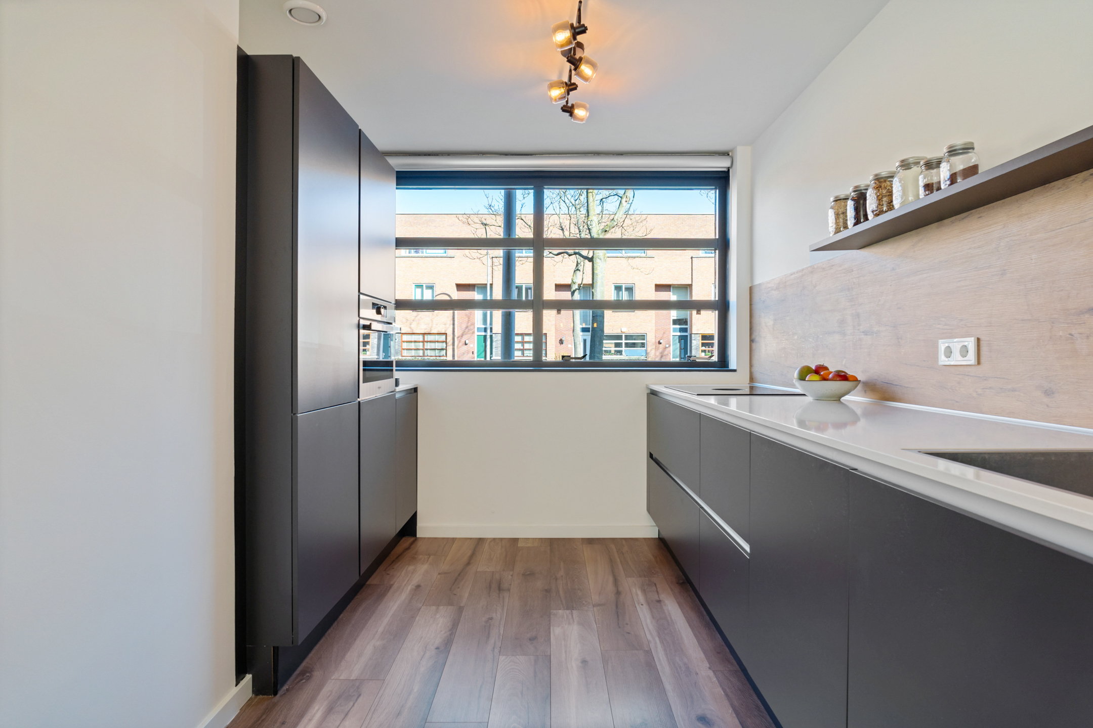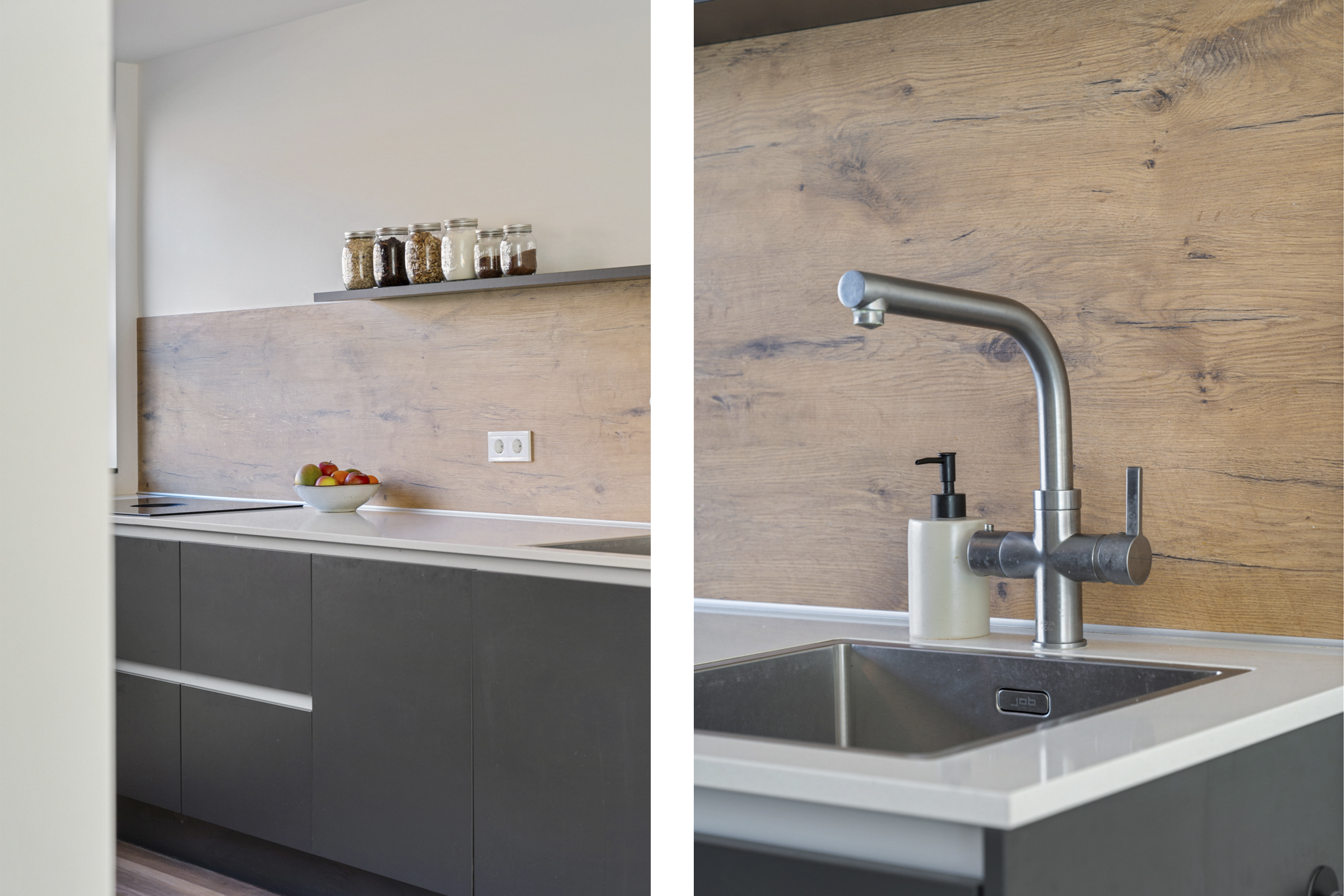 Hier kook je in stijl met hoogwaardige inbouwapparatuur zoals een kokend-waterkraan, vaatwasser, koel-/vriescombinatie, combi-oven/magnetron, composiet werkblad en een inductiekookplaat met geïntegreerde afzuiging.