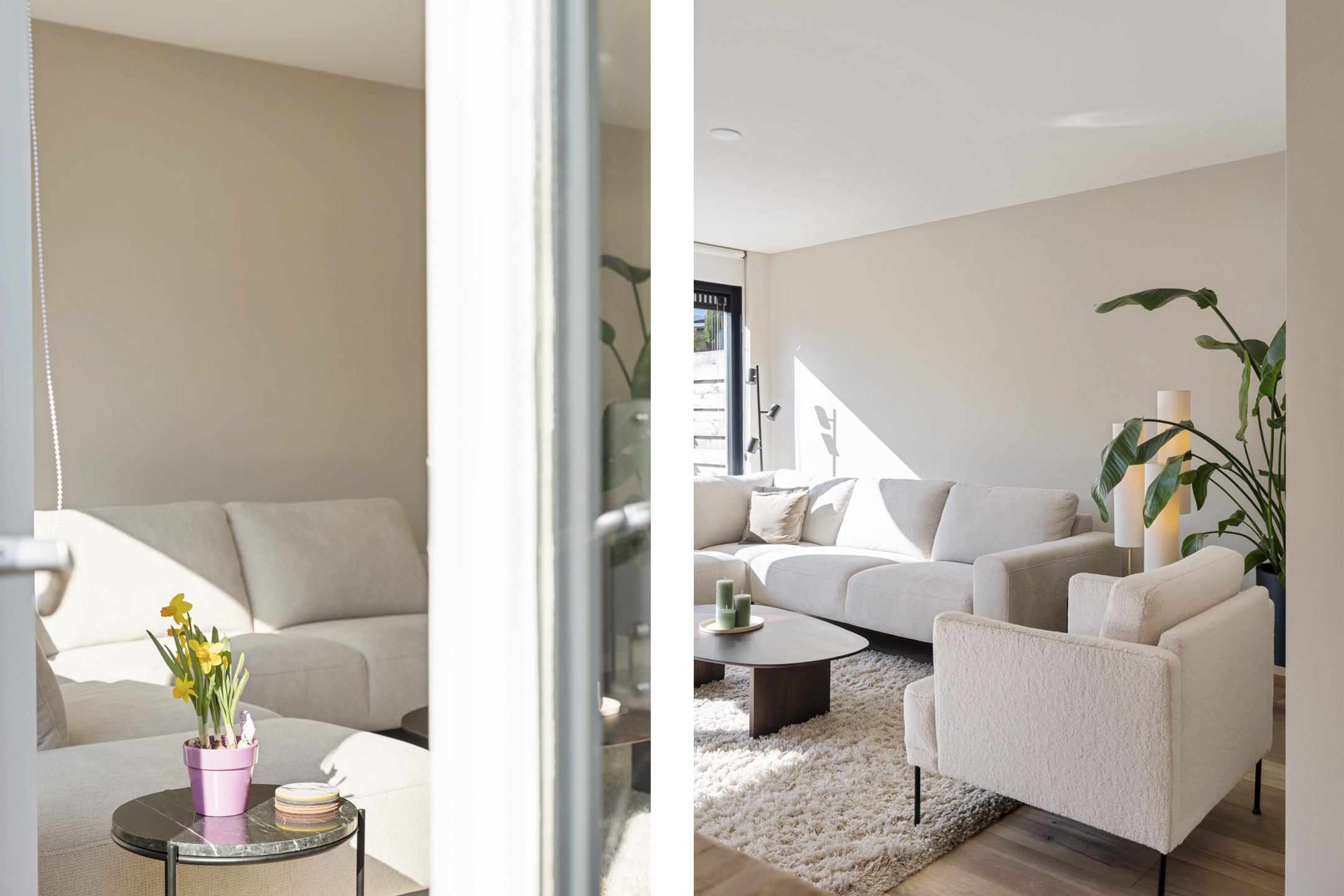 > In de hele woning, behalve in de hallen, is de spachtelputz vervangen door strak stucwerk of renovlies