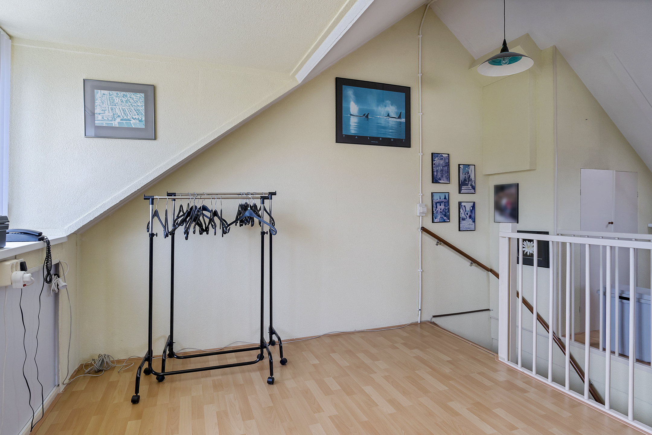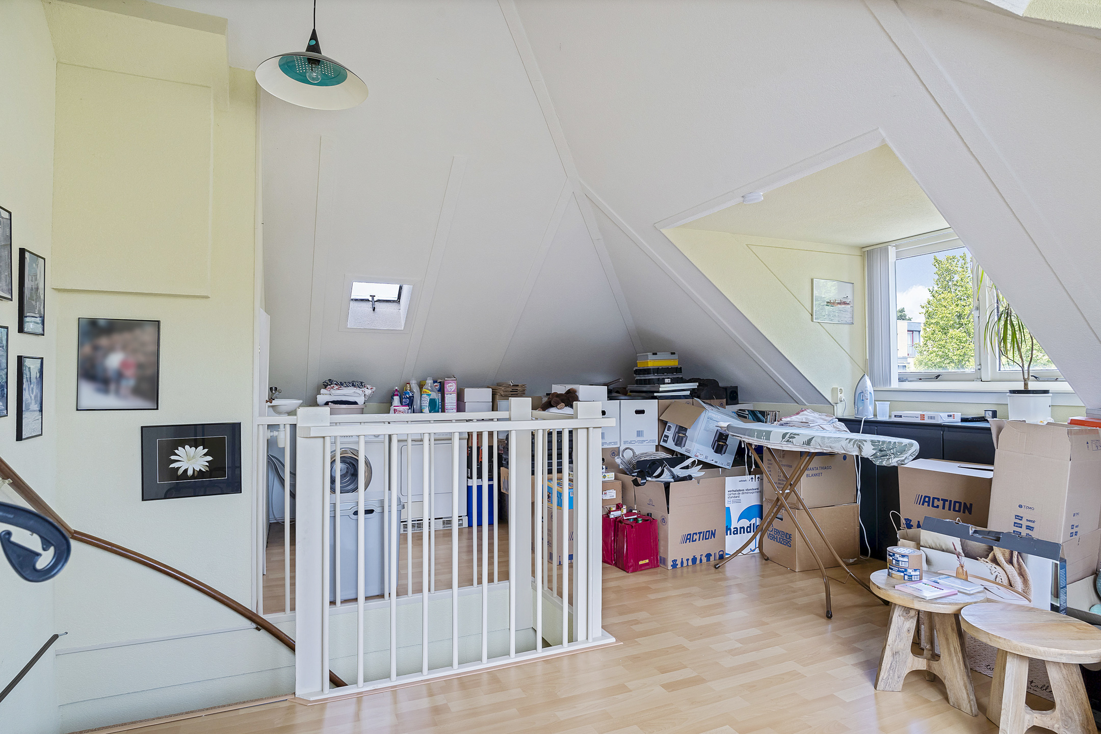 Deze open ruimte is voorzien van twee dakkapellen en een dakraam, wat zorgt voor veel natuurlijk licht. Hier vind je de opstelplaats voor de Cv-combiketel, de wasmachine en een wastafel.