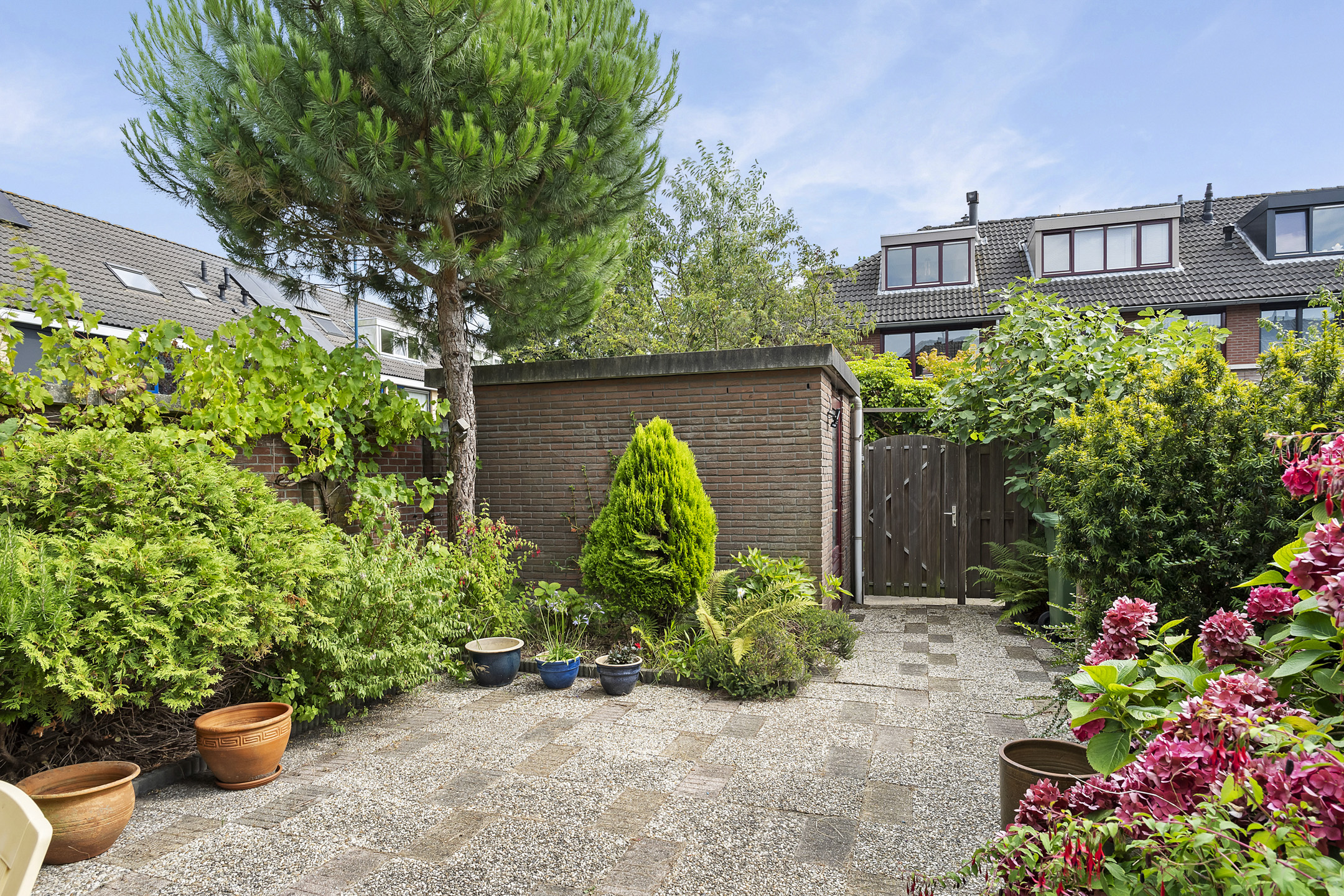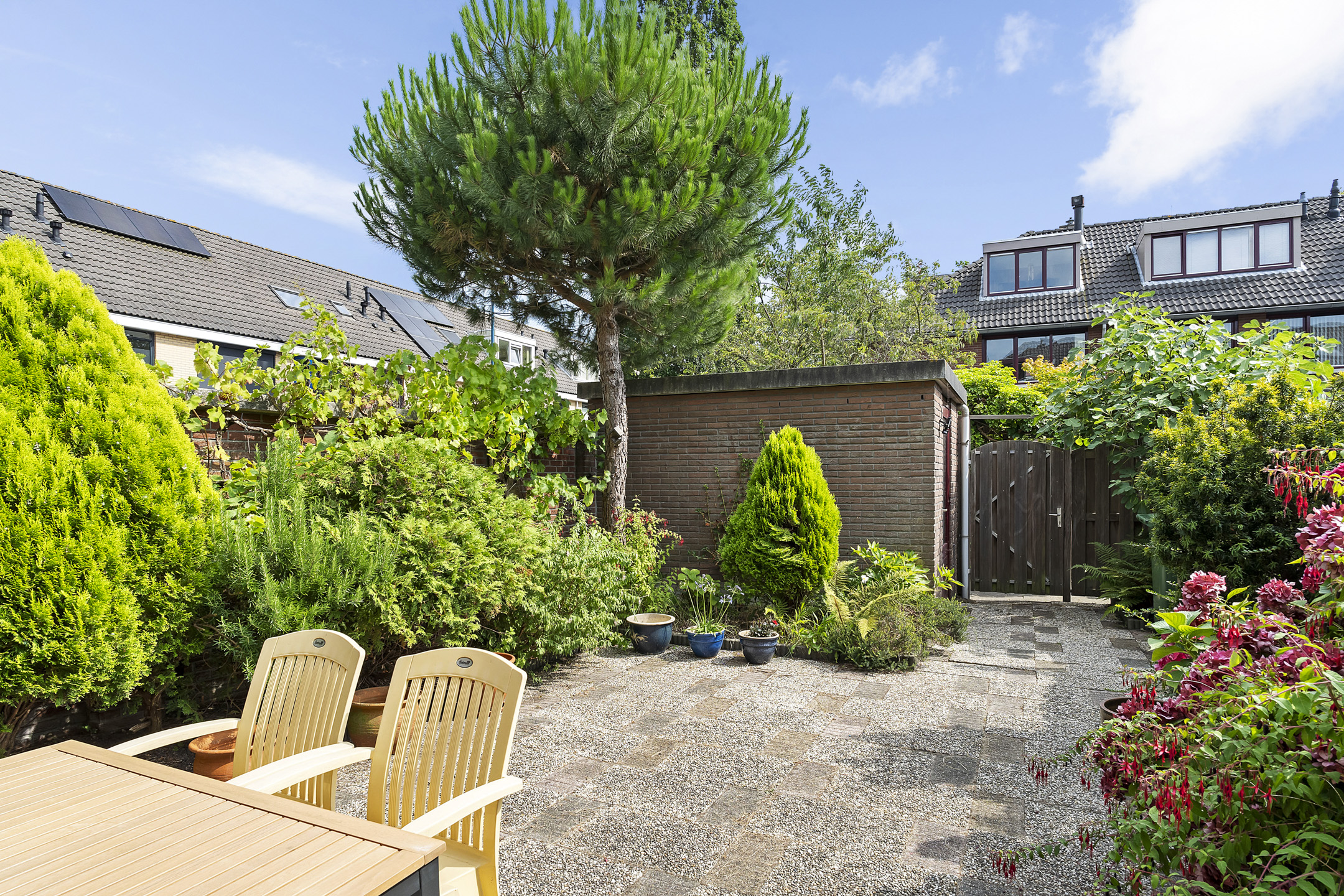 De verzorgde achtertuin op het zuidoosten is voorzien van groenborders en een boom, perfect voor zonnige dagen. Daarnaast is er een vrijstaande stenen berging met elektra en een achterom.