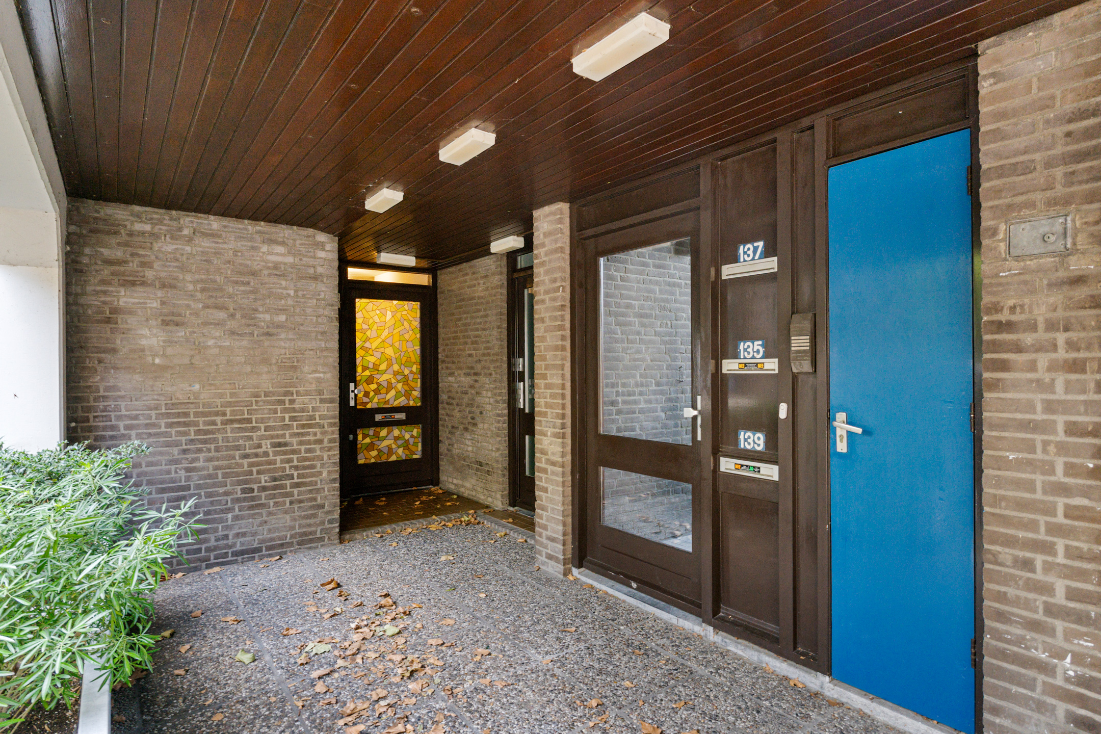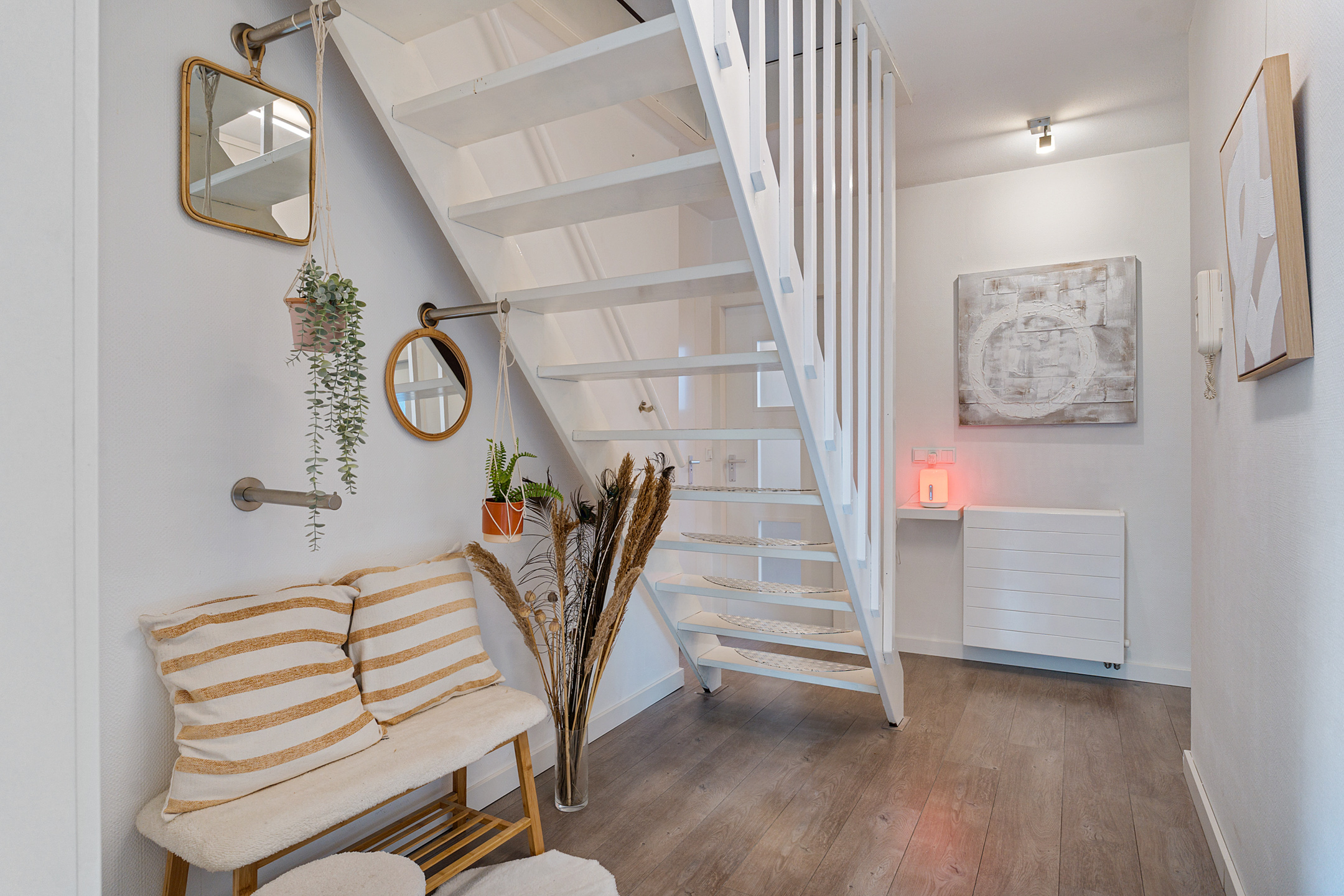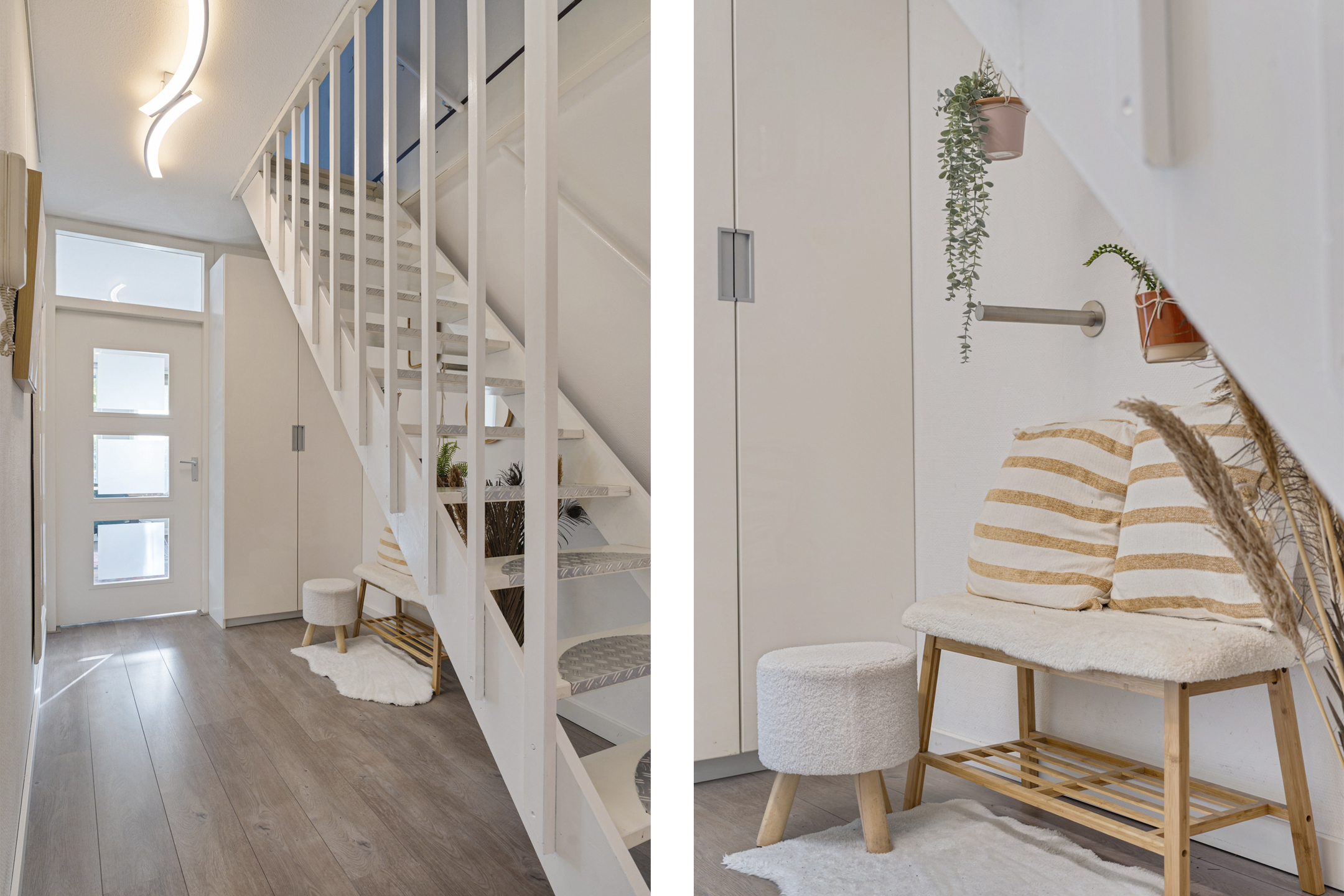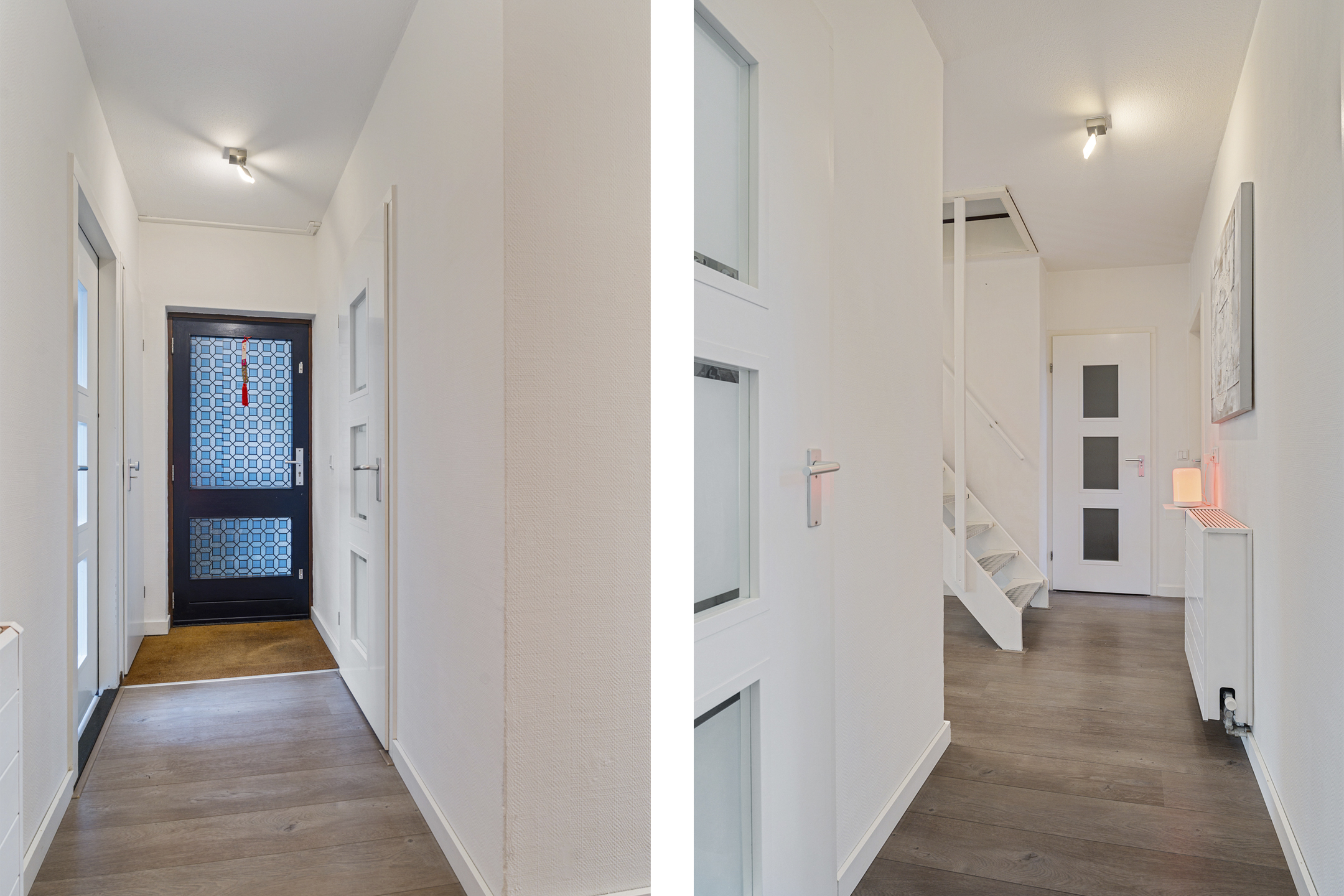 Afgesloten entree met bellenplateau, trappenhuis en toegang tot de eigen berging van circa 5 m². Het portiek is afgesloten en wordt gedeeld met slechts twee andere woningen, wat zorgt voor rust en privacy.