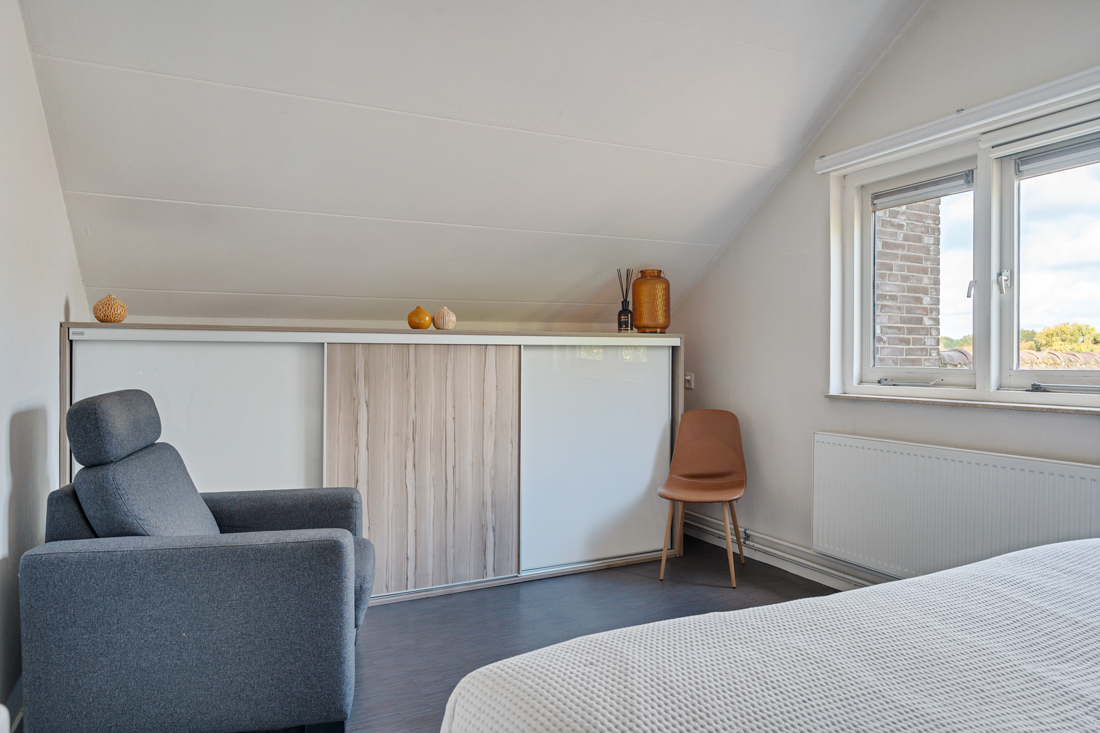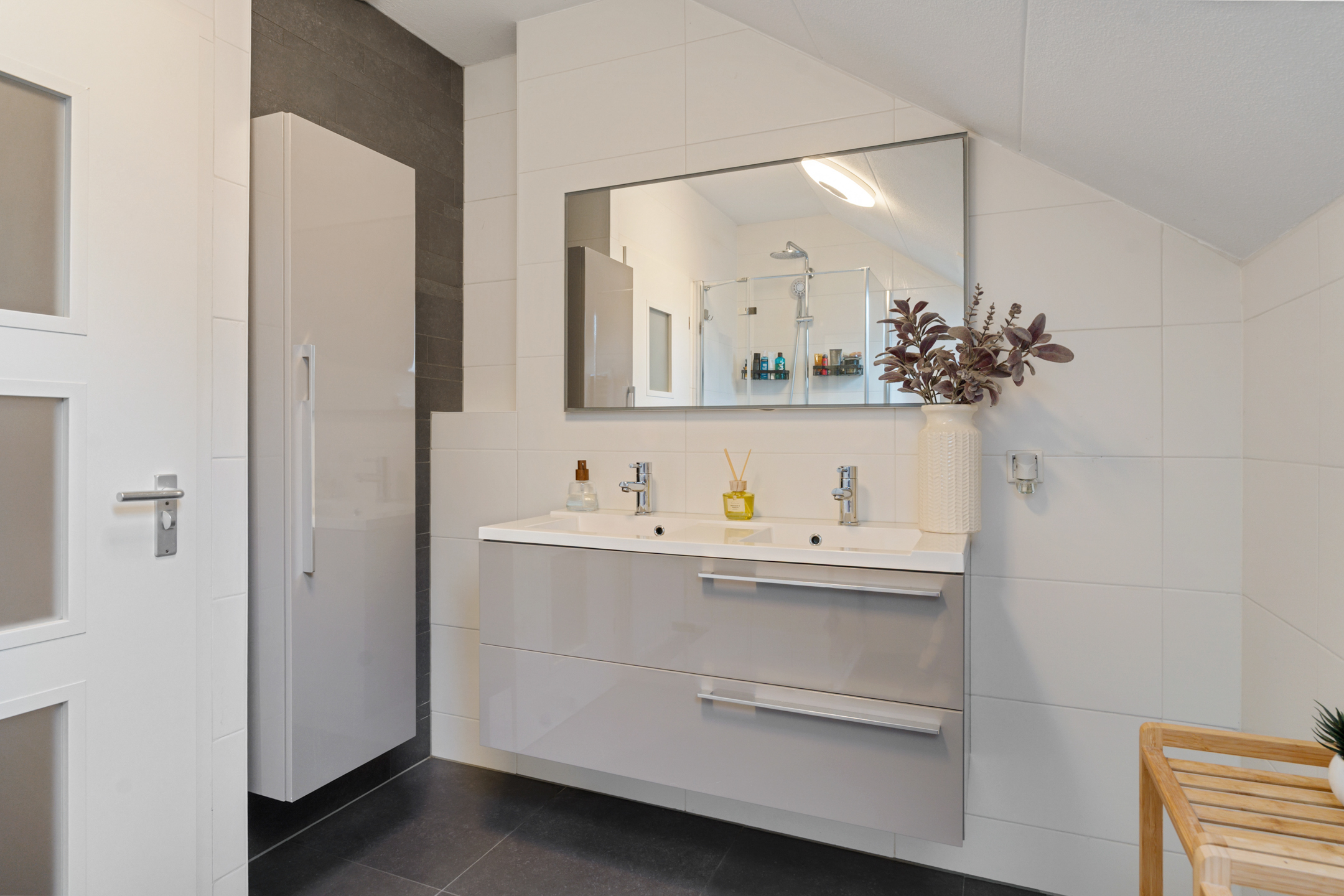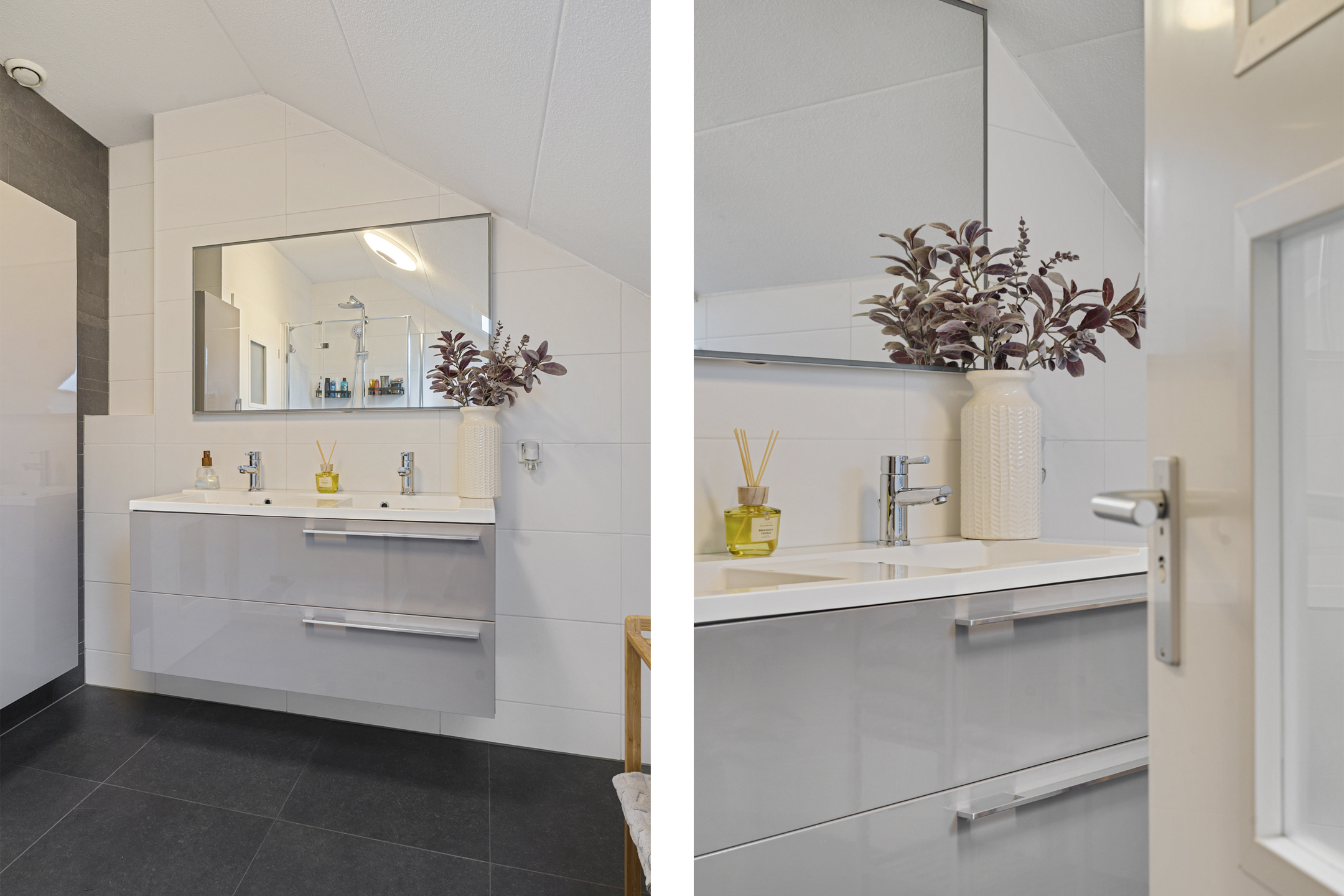 Via de overloop bereik je twee royale slaapkamers, elk met vaste kasten en een eigen wastafelmeubel. Ook vind je hier een grote bergruimte en de opstelplaats van de cv-installatie (Remeha, 2016, eigendom). Dankzij de ligging op de bovenste verdieping geniet je van maximale rust en geen bovenburen.