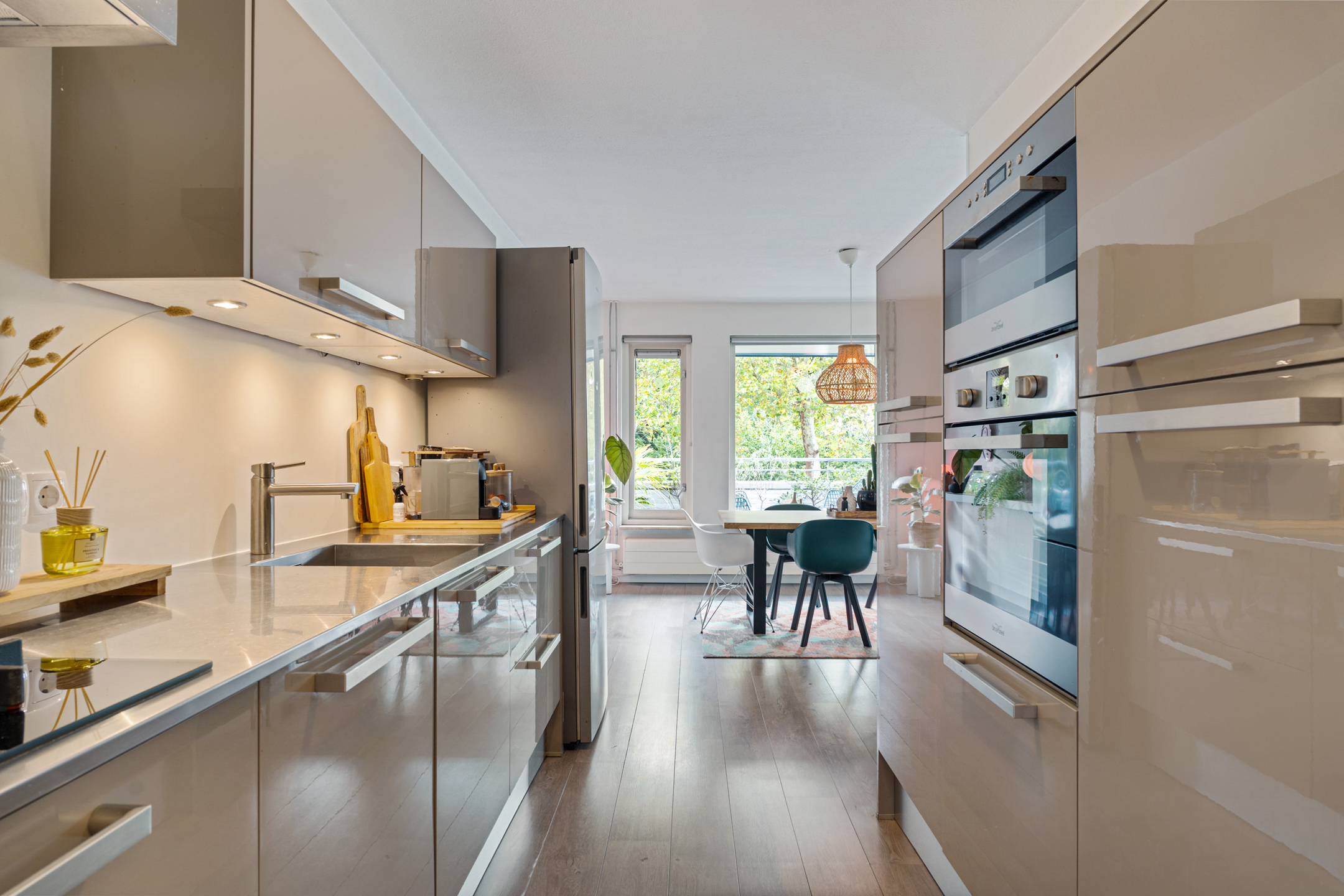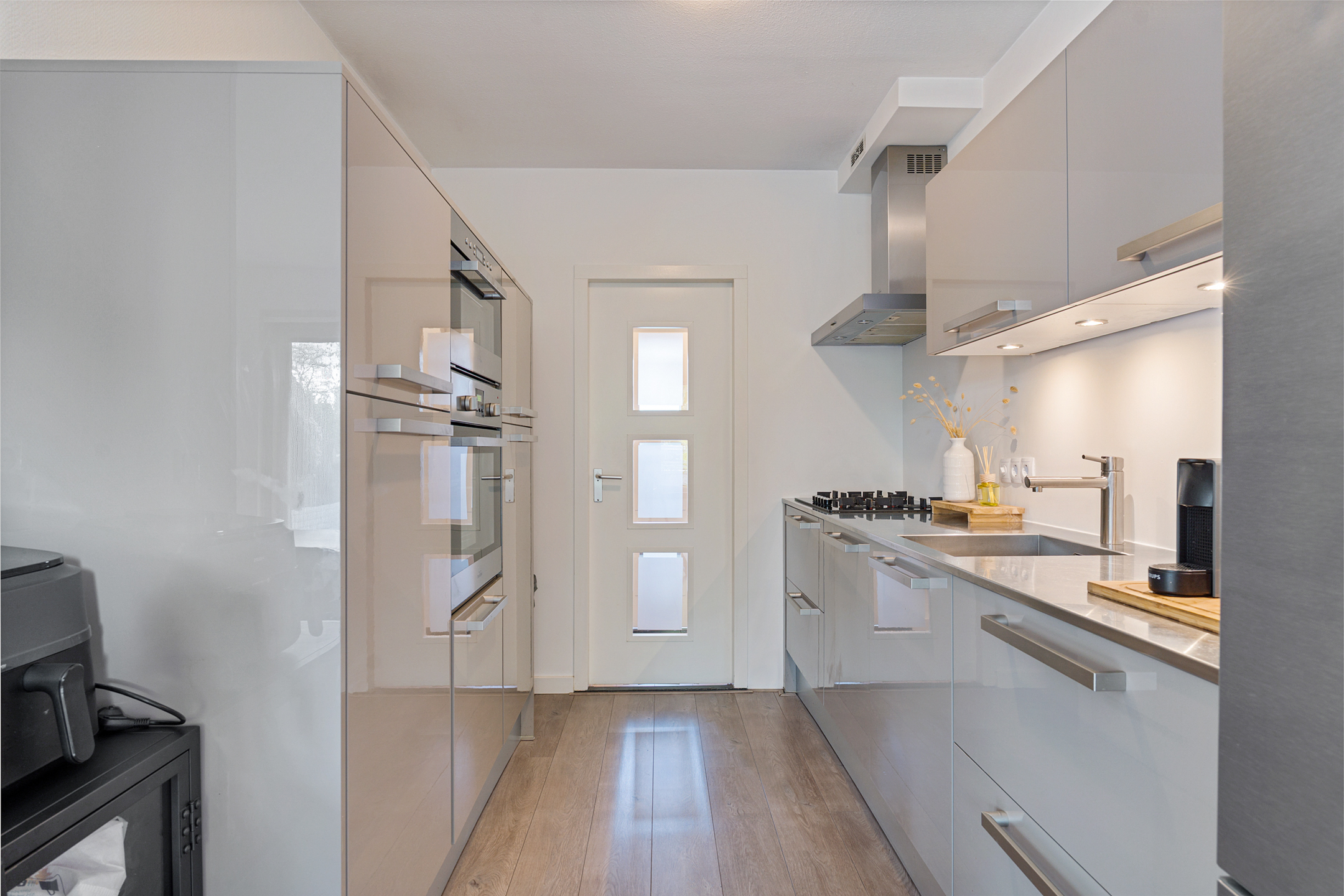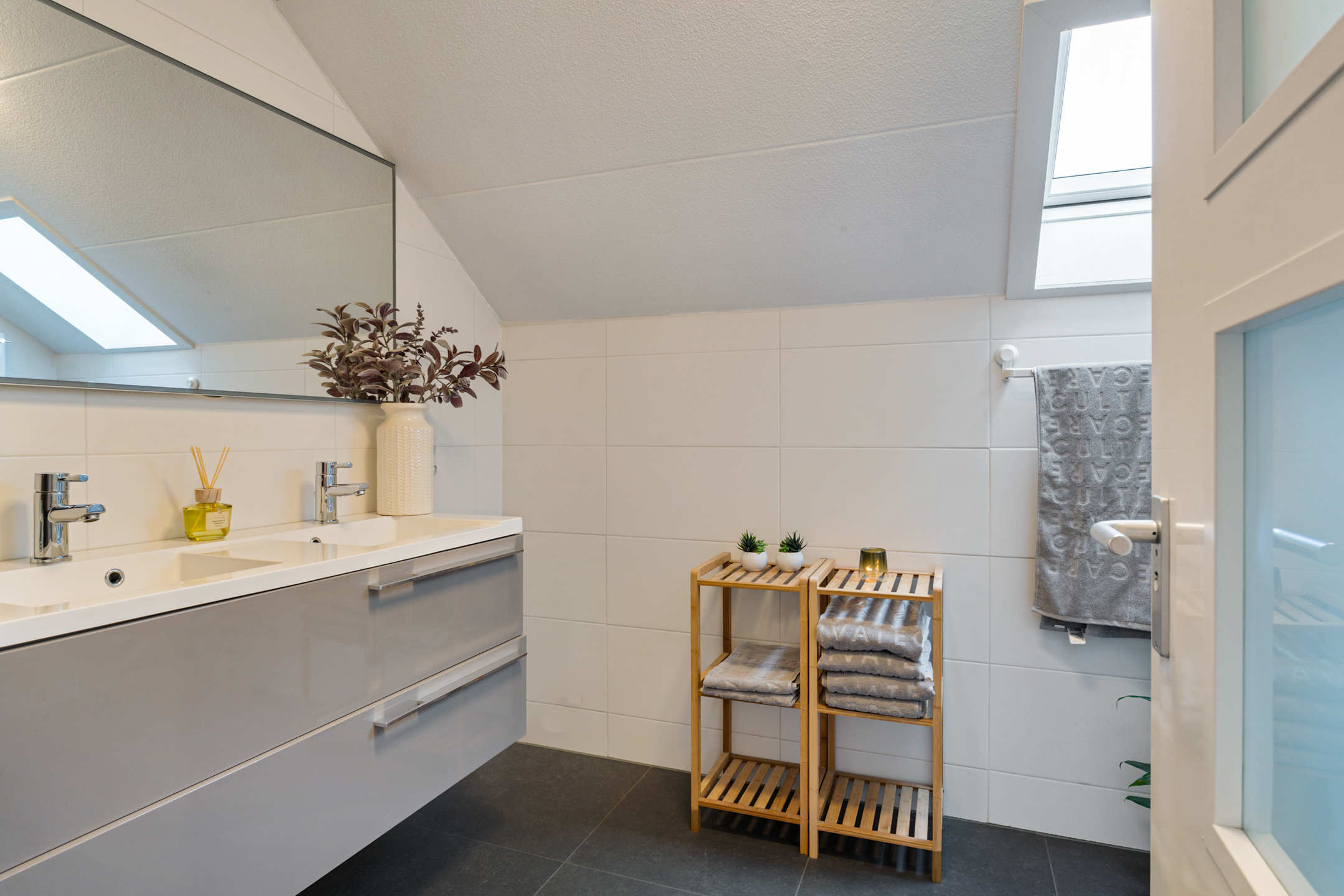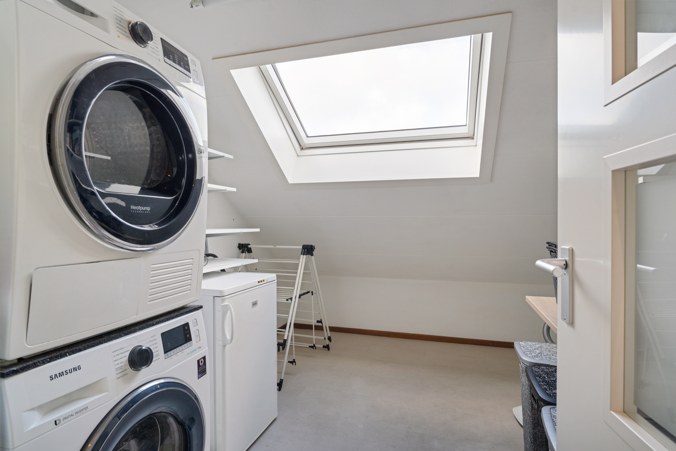 De open keuken heeft een moderne opstelling met inbouwapparatuur, waaronder een kookplaat, oven, afzuigkap, vaatwasser en koelkast. De badkamer is luxe uitgevoerd met een ruime inloopdouche, dubbele wastafel, verwarmde spiegel en strak tegelwerk. Daarnaast is er een separate toiletruimte en een praktische wasruimte, beide voorzien van een dakraam.