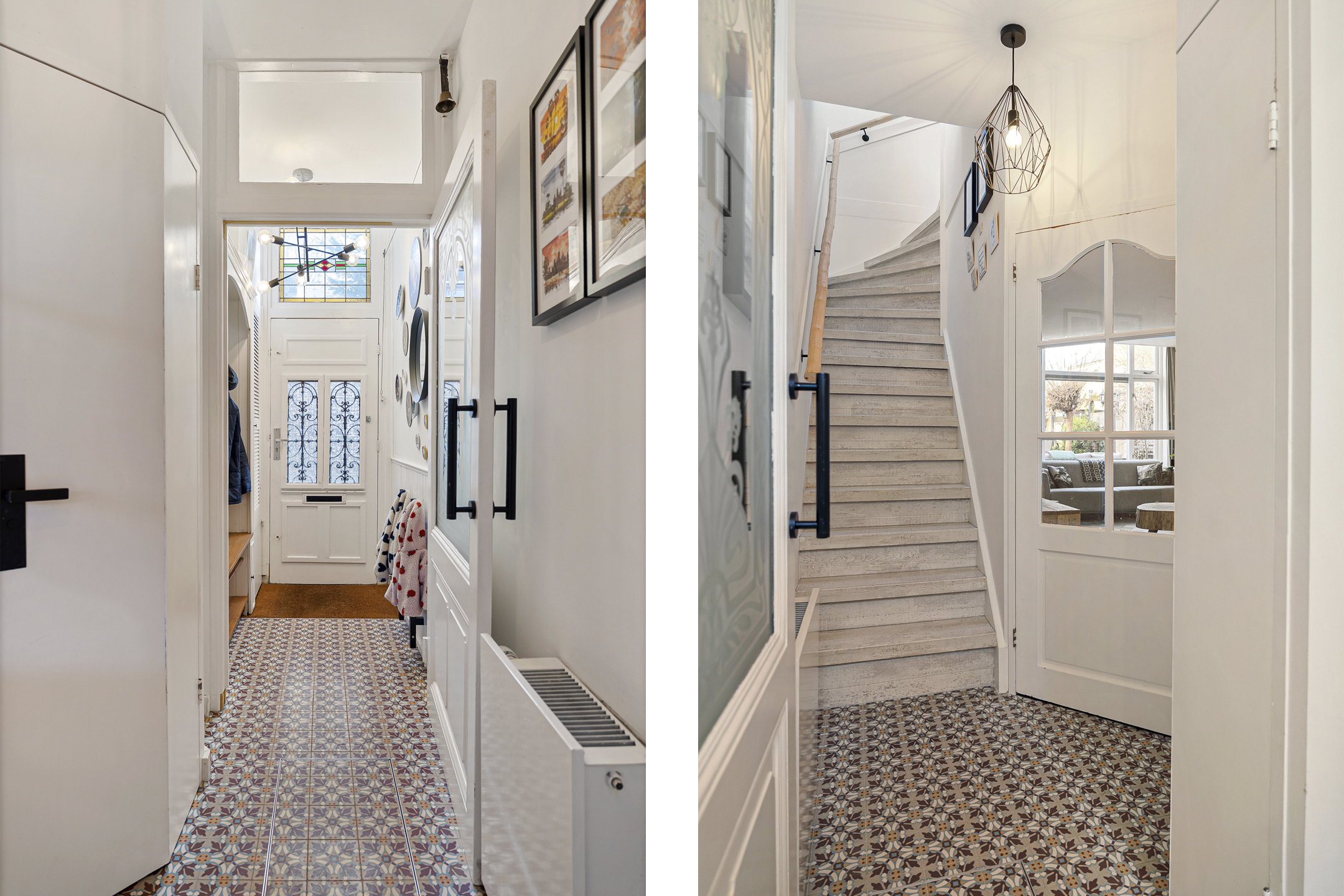 Via het tochtportaal met tegelvloer kom je in de hal, waar zich de moderne meterkast, de toiletruimte en de trapopgang naar de bovenverdieping bevinden. De woonkamer is een echte sfeermaker: royaal van opzet en voorzien van een houten vloer, gestuukte wanden, glas-in-loodramen, een allesbrander en een diepe trapkast.