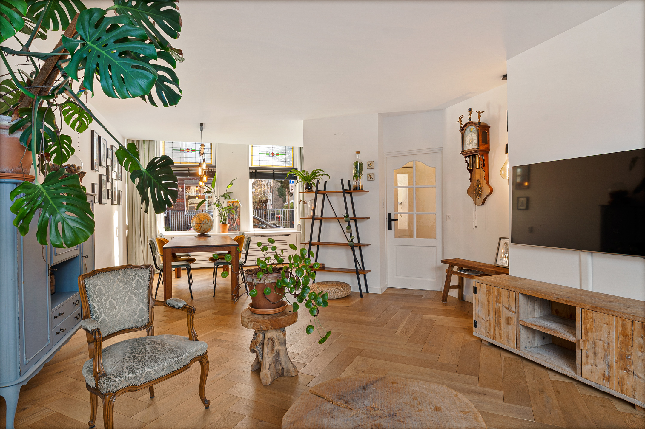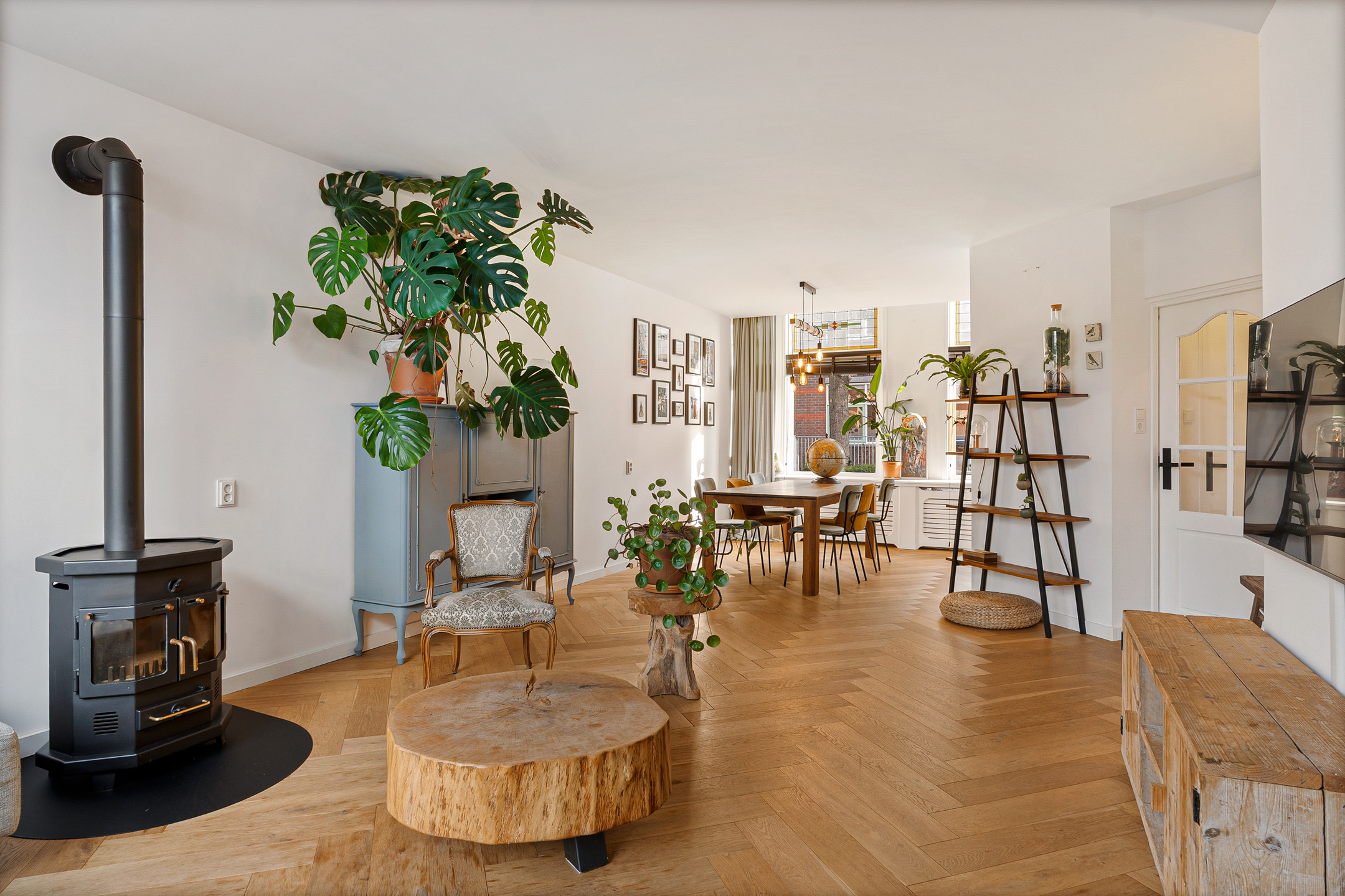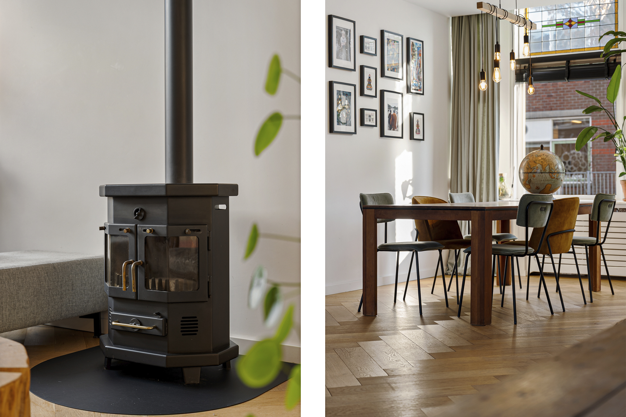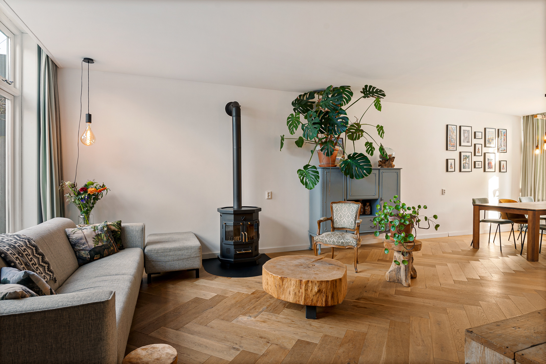 + Woonkamer met allesbrander en glas-in-lood