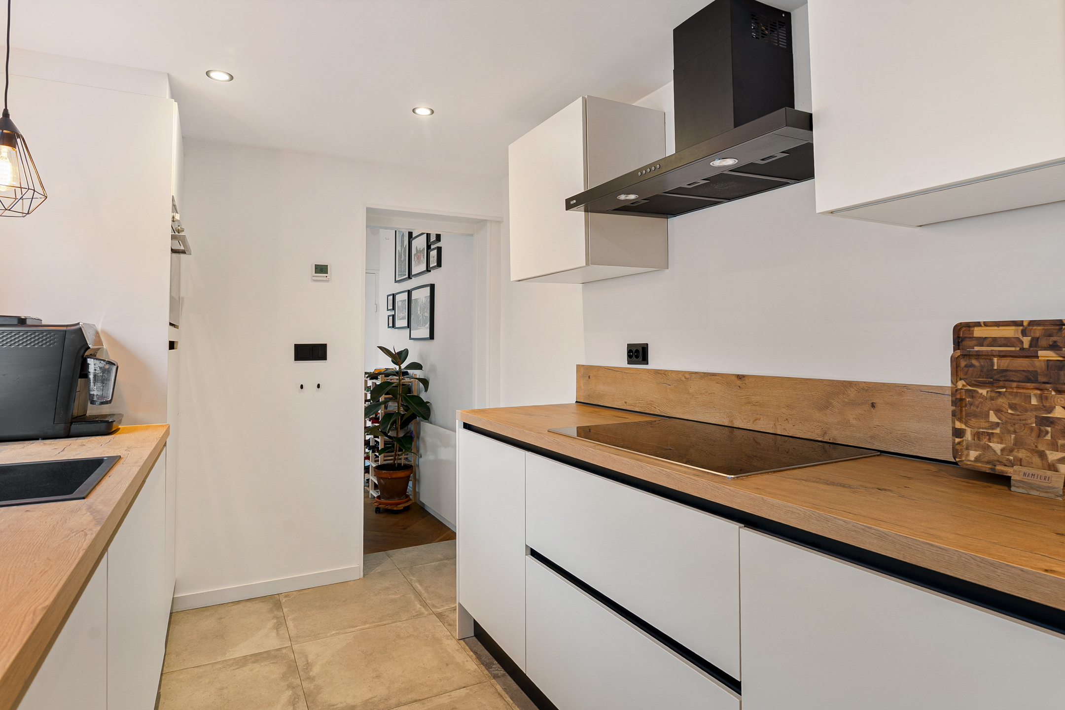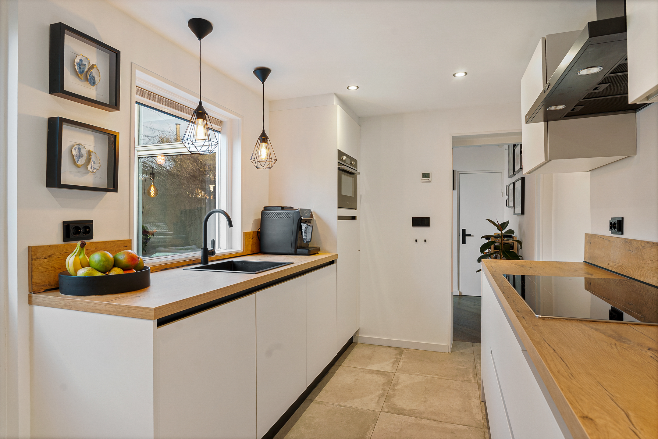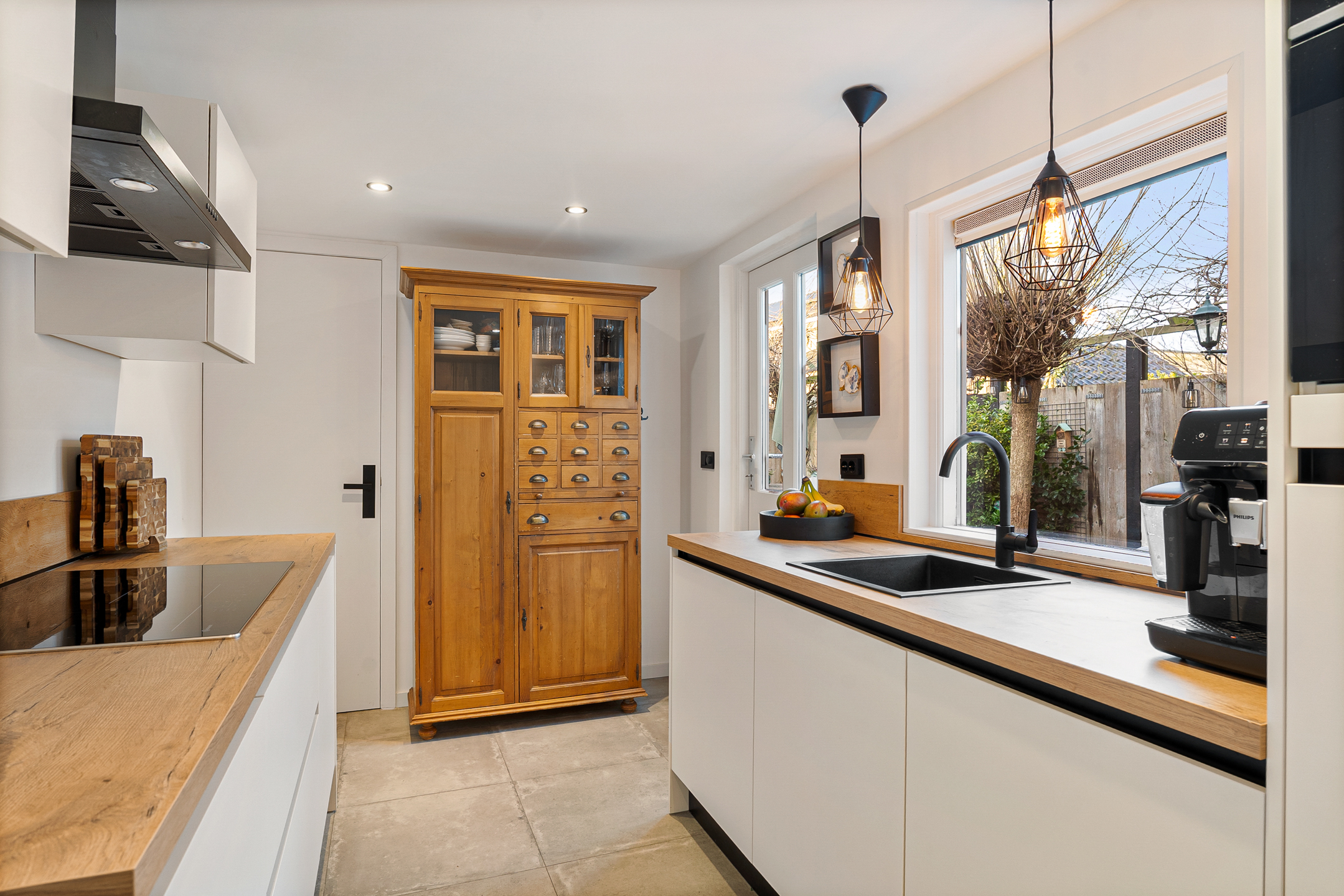 Een plek waar je je direct thuis voelt. De keuken is bereikbaar via een schuifdeur en bevindt zich in de uitbouw aan de achterzijde. In 2024 is deze keuken volledig vernieuwd en uitgevoerd in twee delen, voorzien van diverse inbouwapparatuur. In een vaste kast zijn de cv-combiketel (2021) en de wasmachineaansluiting netjes weggewerkt.