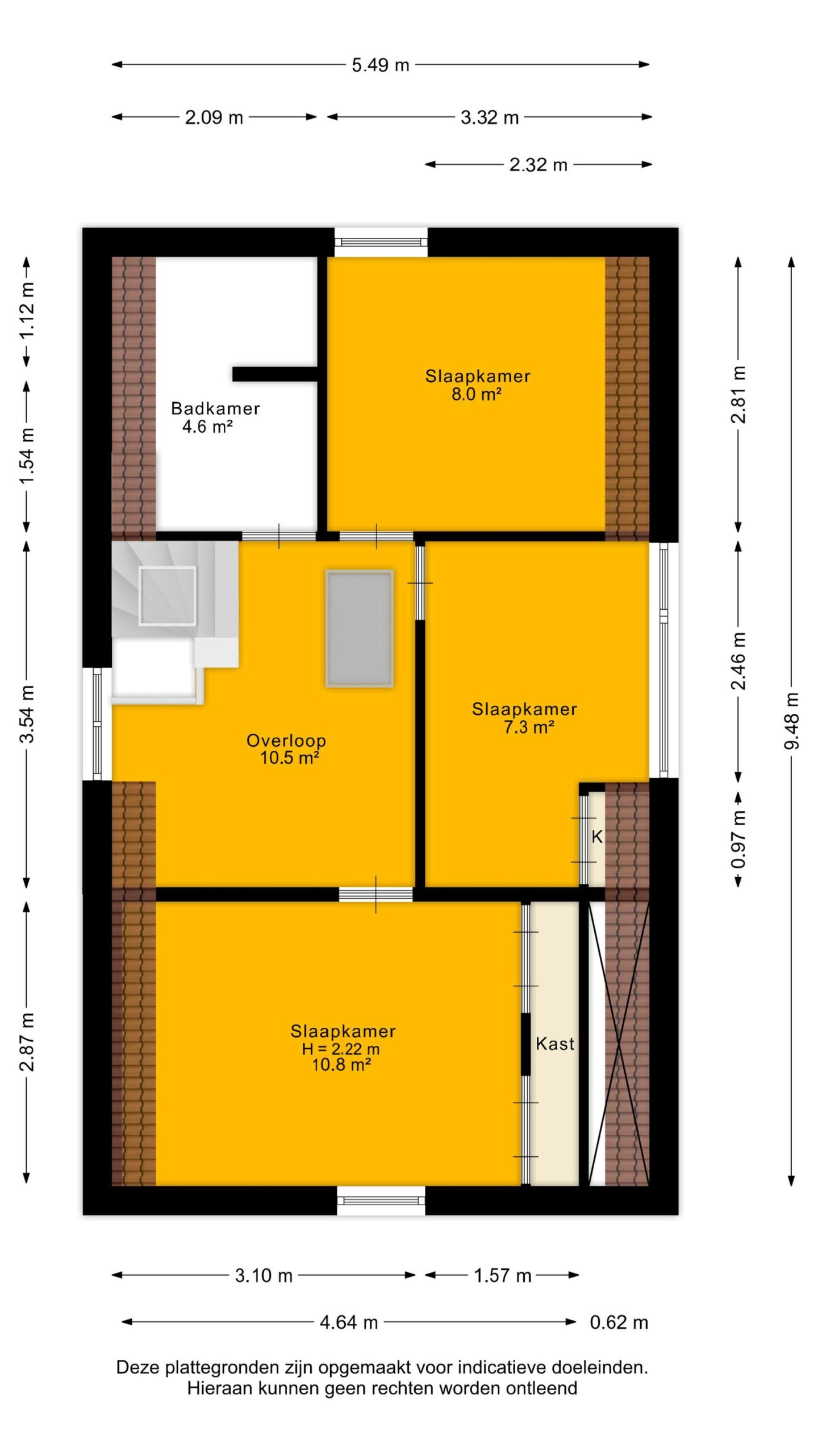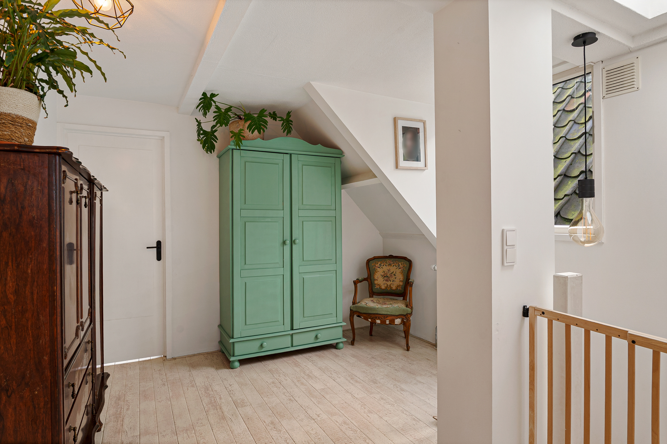De ruime overloop is voorzien van een kunststof dakkapel en een lichtkoepel, wat zorgt voor veel daglicht. Hier is voldoende ruimte om een prettige werkplek te creëren. Vanuit de overloop is via een luik de bergvliering bereikbaar. De hoofdslaapkamer bevindt zich aan de voorzijde en is voorzien van een robuuste steigerhouten kastenwand.