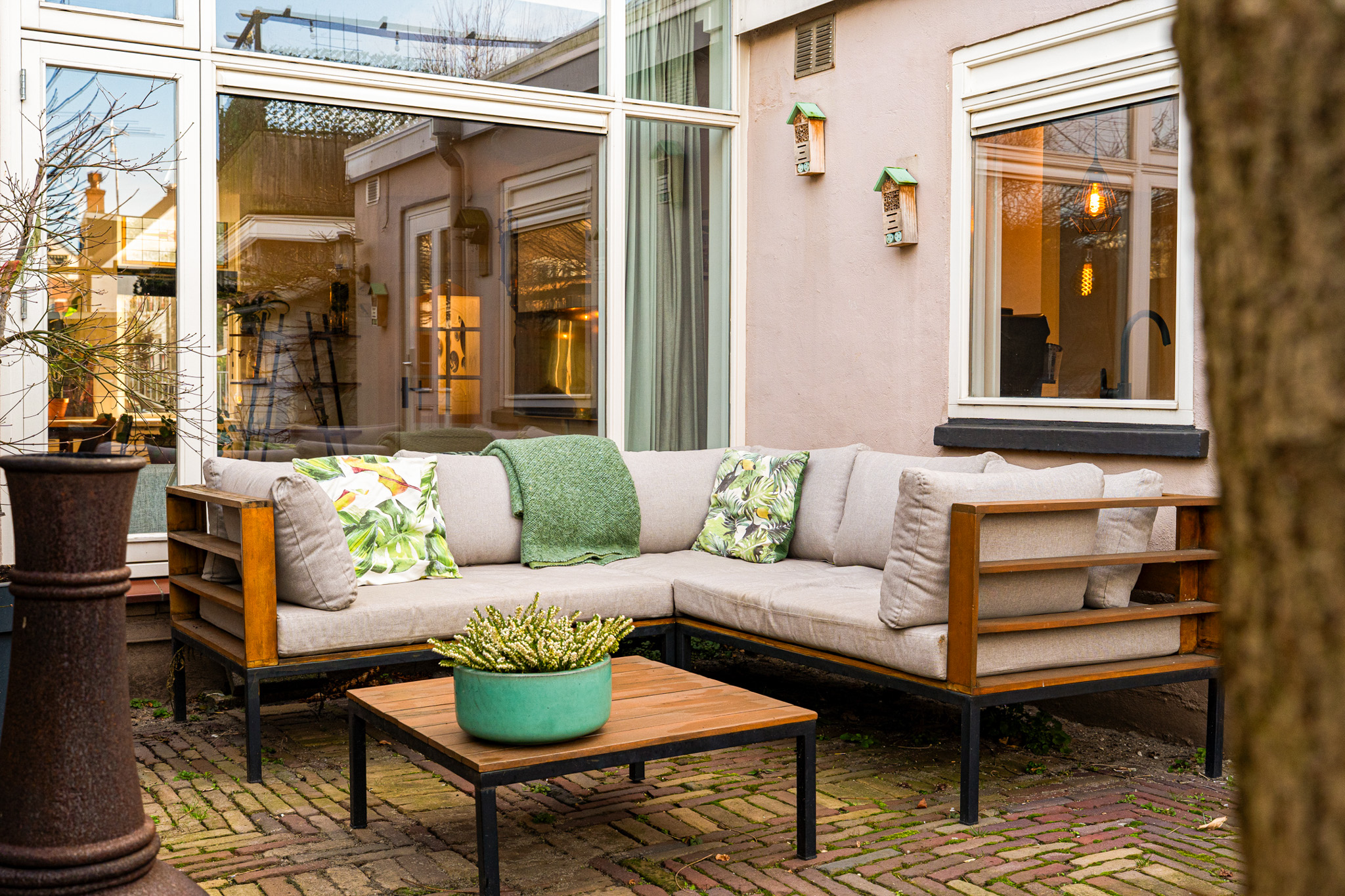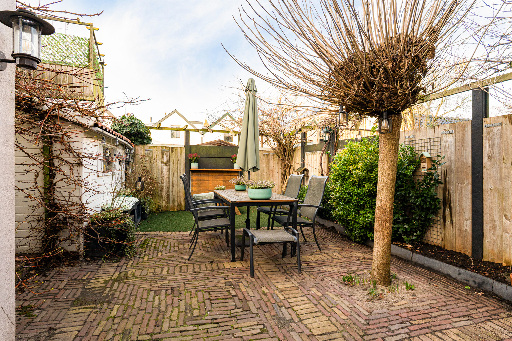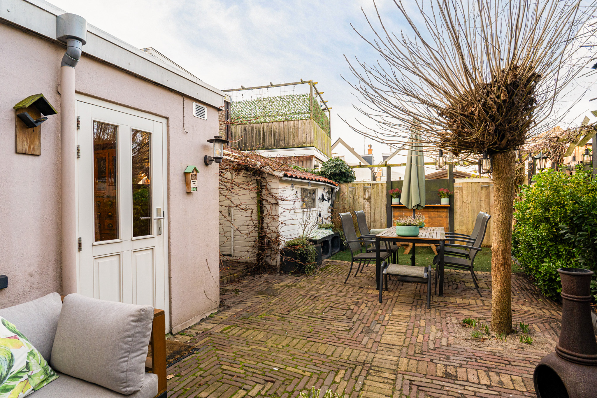 De achtertuin is met veel gevoel voor sfeer aangelegd en biedt een fijne combinatie van sierbestrating, acaciabomen en zonwering. Daarnaast is er een houten chaletberging met elektra en verwarming en beschikt de tuin over een eigen overkapte steeg naar de straat. Een heerlijke, beschutte stadstuin waar het goed vertoeven is.