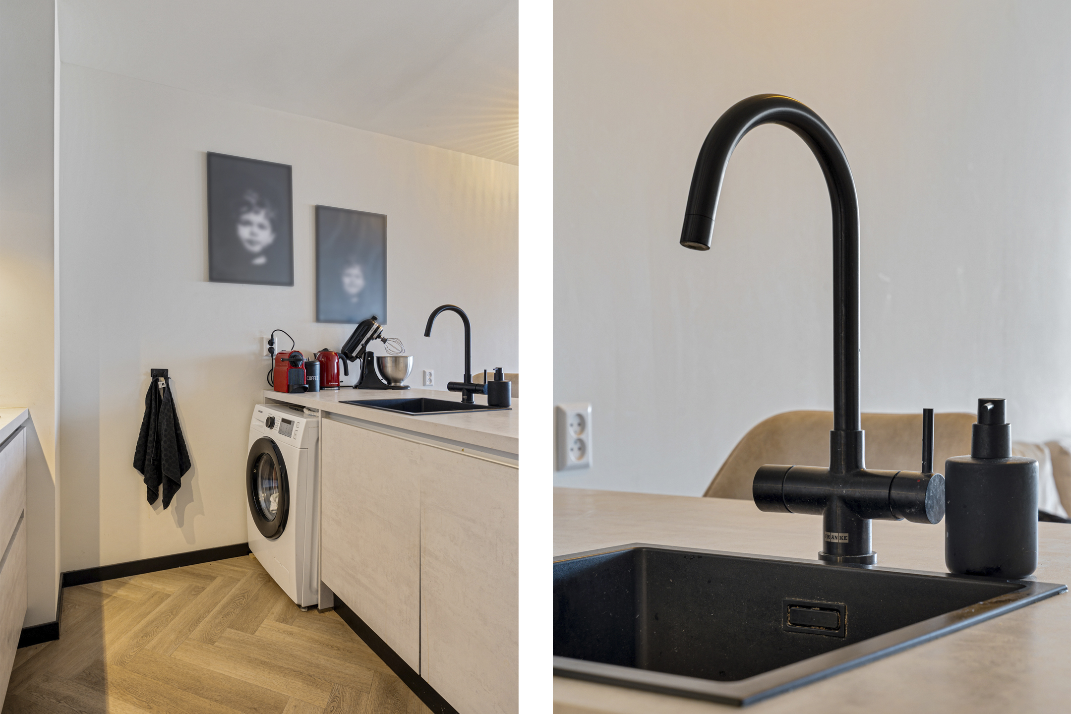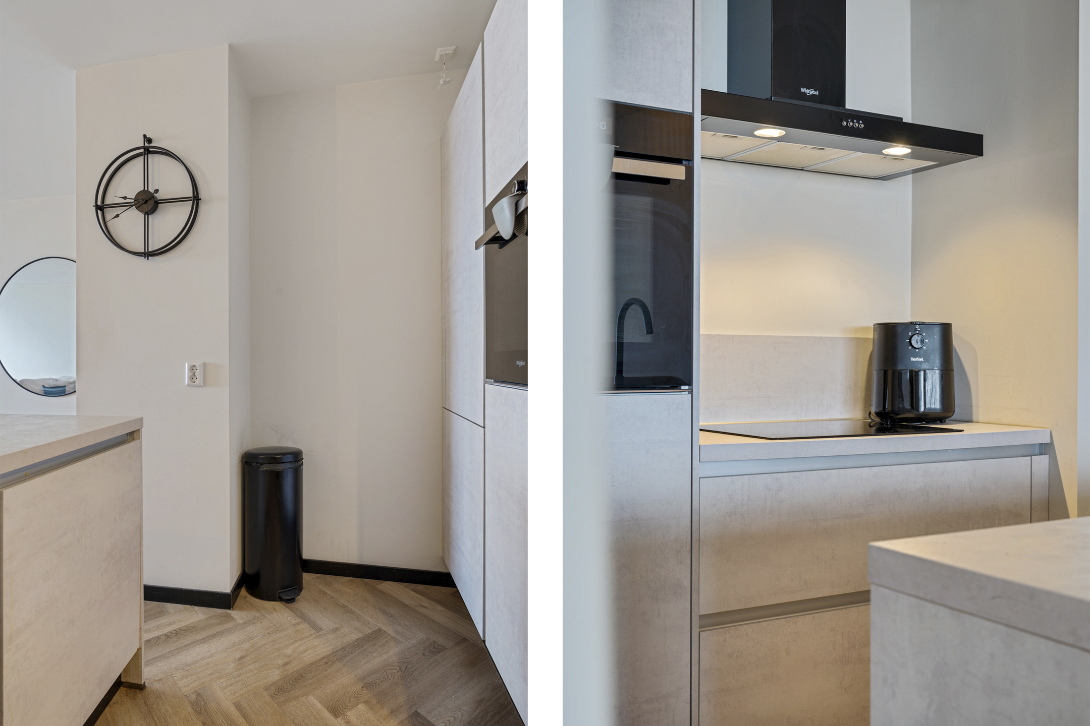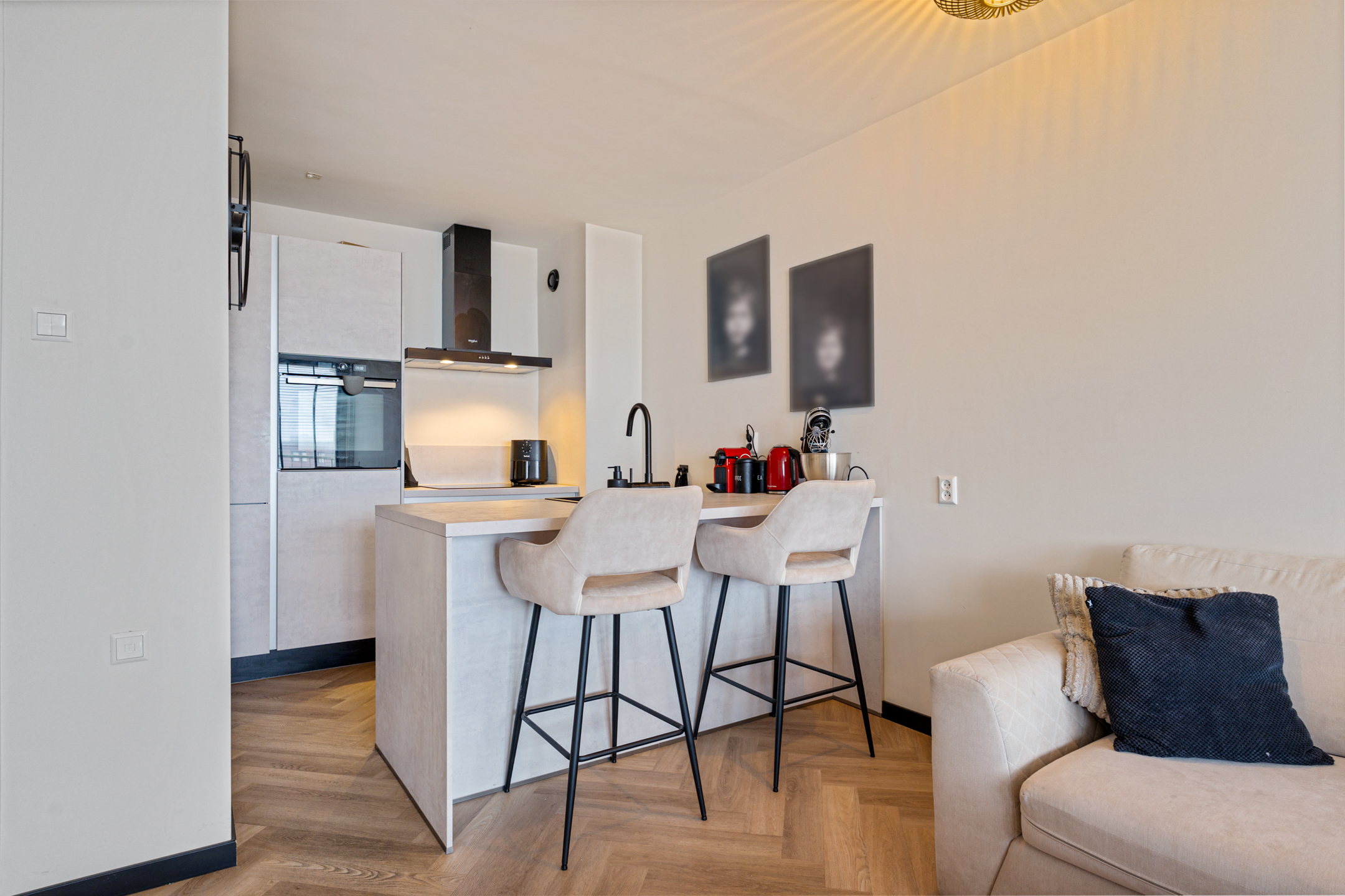 De hal geeft toegang tot de lichte woonkamer met open woonkeuken. De moderne keuken is een echte eyecatcher en uitgerust met een spoeleiland, een gezellige bar met plek voor twee personen en diverse inbouwapparatuur waaronder een; inductiekookplaat, vaatwasser, oven, afzuigkap en een elektrische Franke boiler. De aansluiting voor de wasmachine bevindt zich eveneens in de keuken.