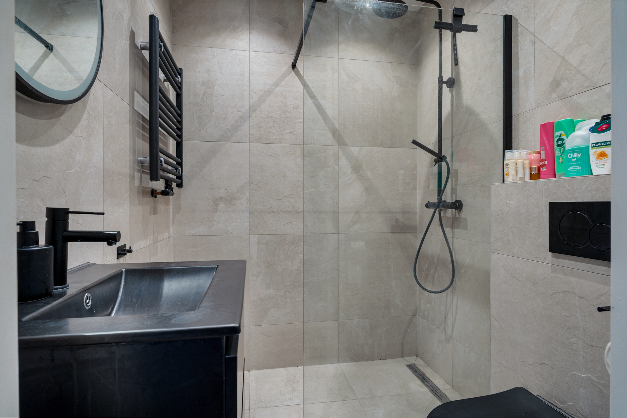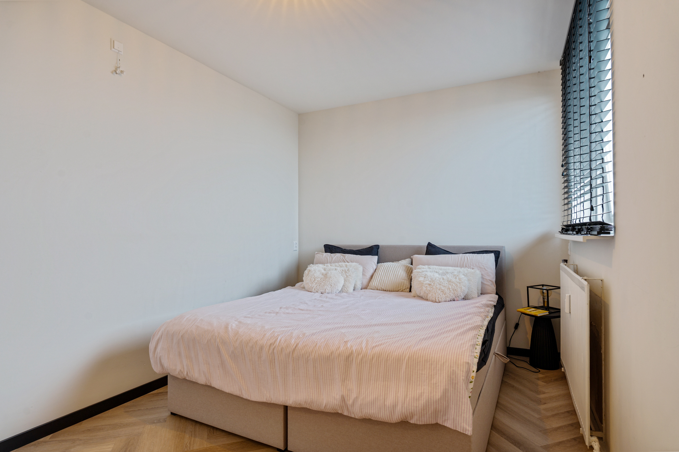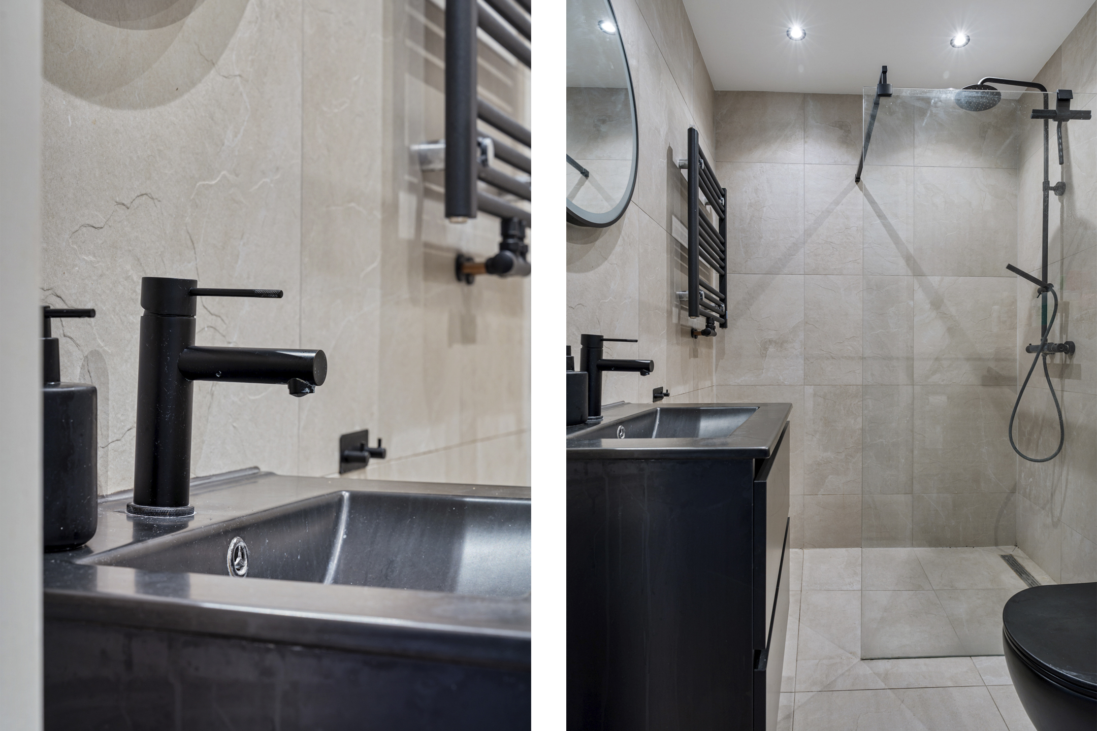 De slaapkamer beschikt over vaste bergkasten en een kiepraam met HR-glas, wat zorgt voor een prettige lichtinval en energiezuinig comfort. De badkamer is hoogwaardig afgewerkt met taupe keramische tegels, een inloopdouche, modern wastafelmeubel, toilet en stijlvolle zwarte kranen en details — een perfecte combinatie van elegantie en functionaliteit.